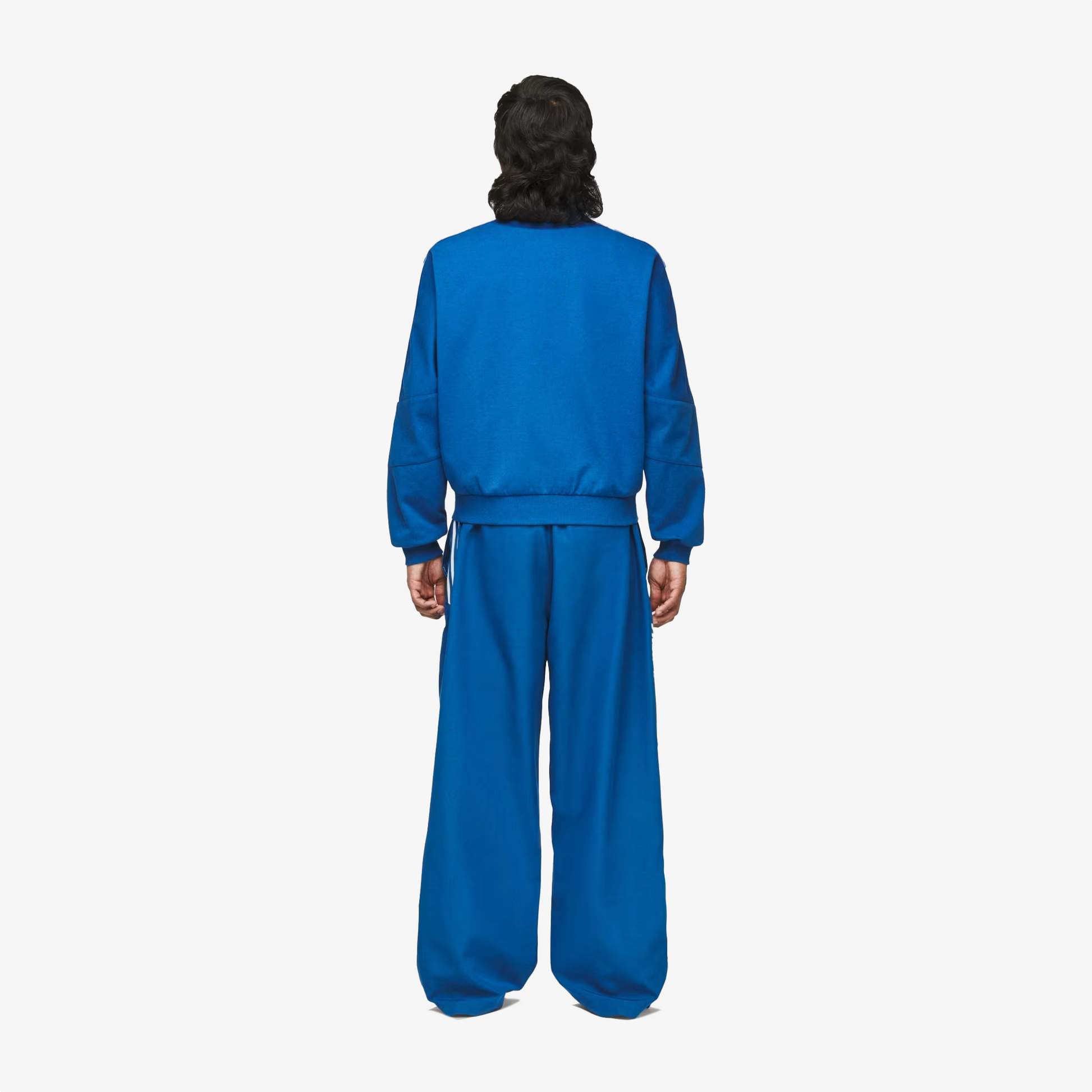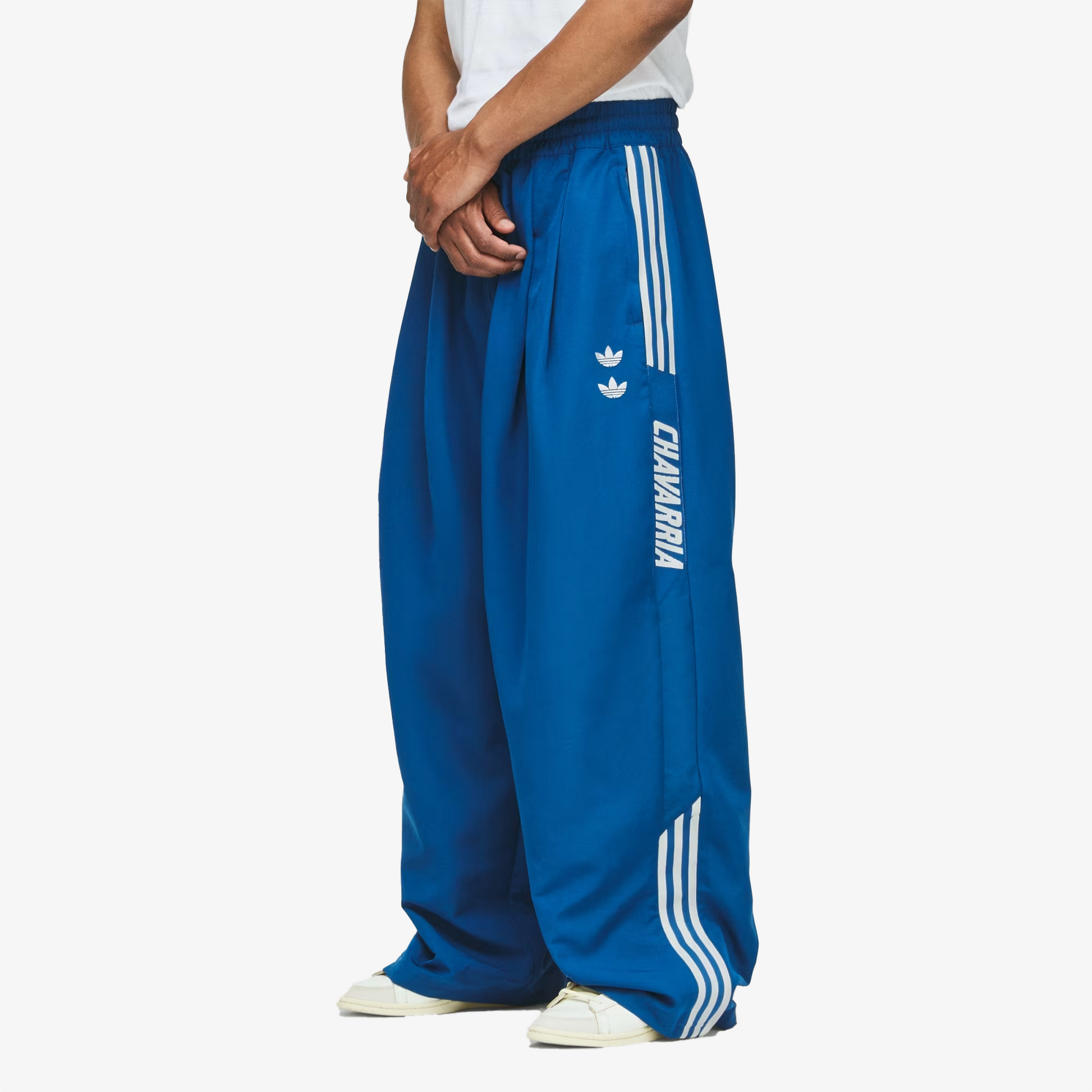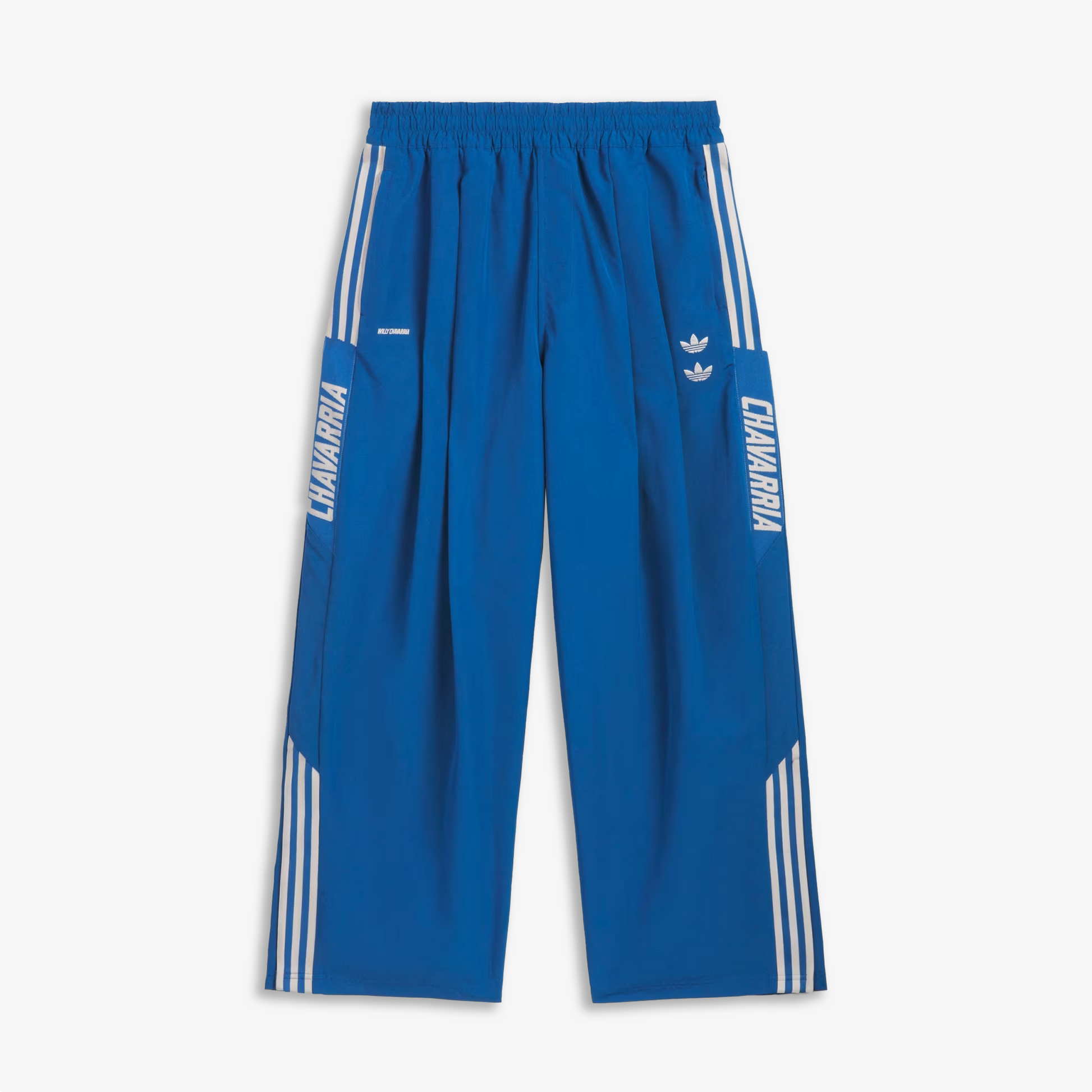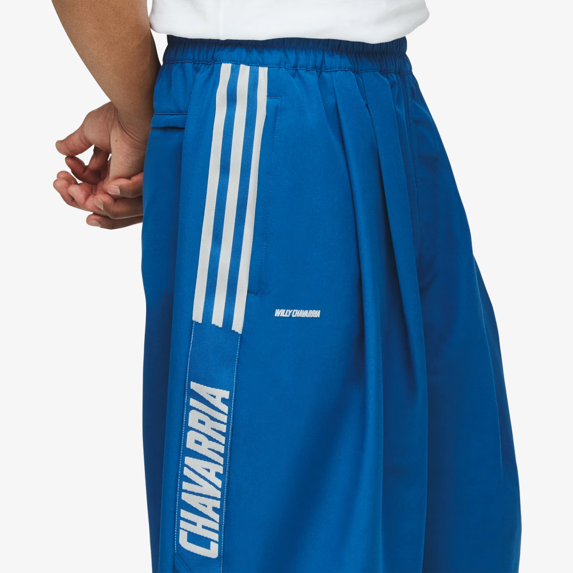 The Chavarria Track Pant is elevated in a ponte knit fabric to provide exceptional quality and comfort. The track pant is designed with voluminous proportions in the legs. Functional details include an elastic drawcord waistband and side pockets with zippers. Branding is symbolized by embroidered double trefoils on the wearer's left thigh and embroidered Willy Chavarria wordmark on the wearer's right thigh. 3 stripes tape with Chavarria incorporated in it appears on each leg in two segments.