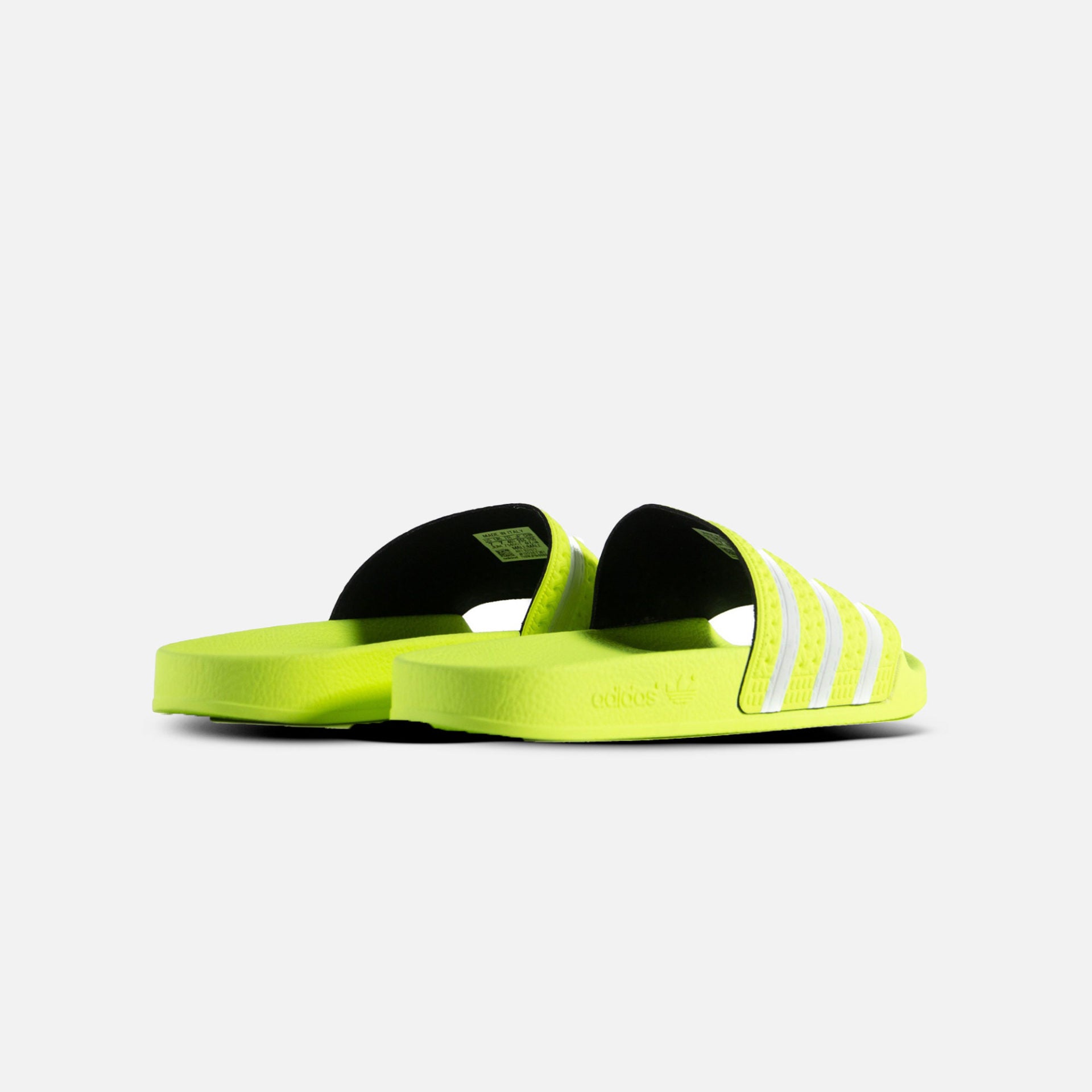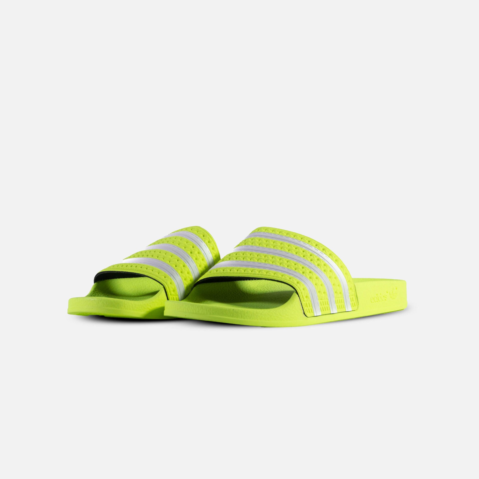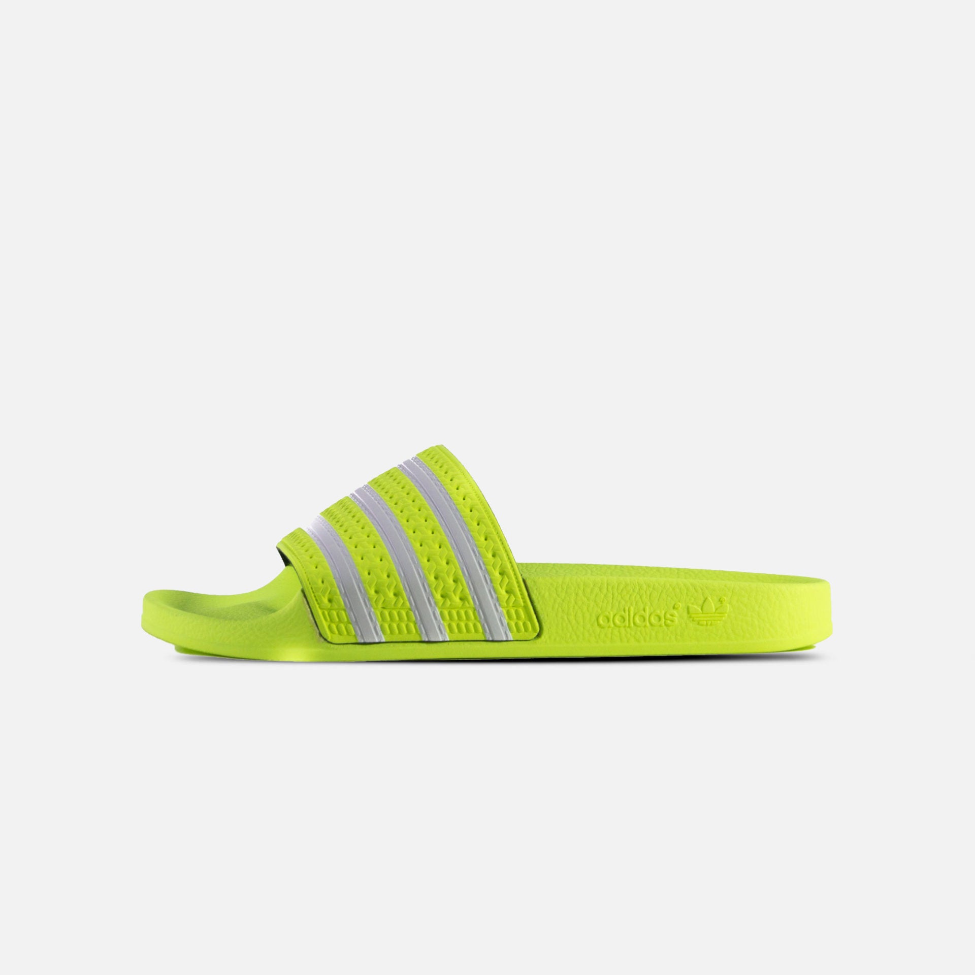 Originally a shower slidethe Adilette has become a fixture of street style and the standard for slip on comfort. This version of the slide features a dimpled upper wrapped in contrasting 3 Stripes. The rubber bottom PU footbed contours to your foot and gets more comfortable the more you wear them.