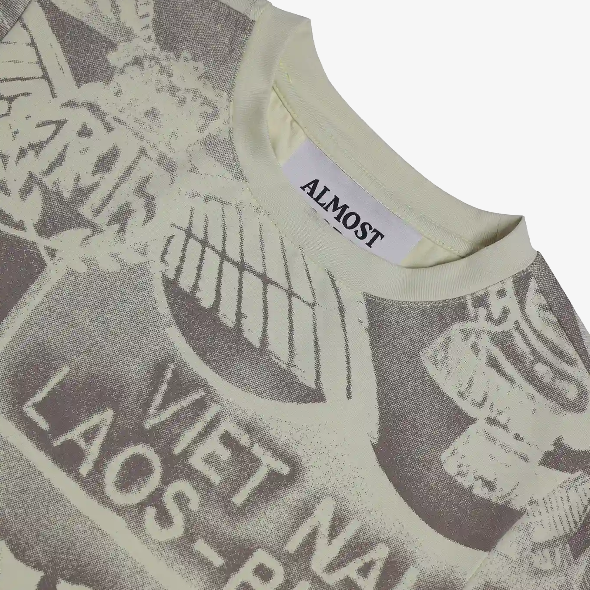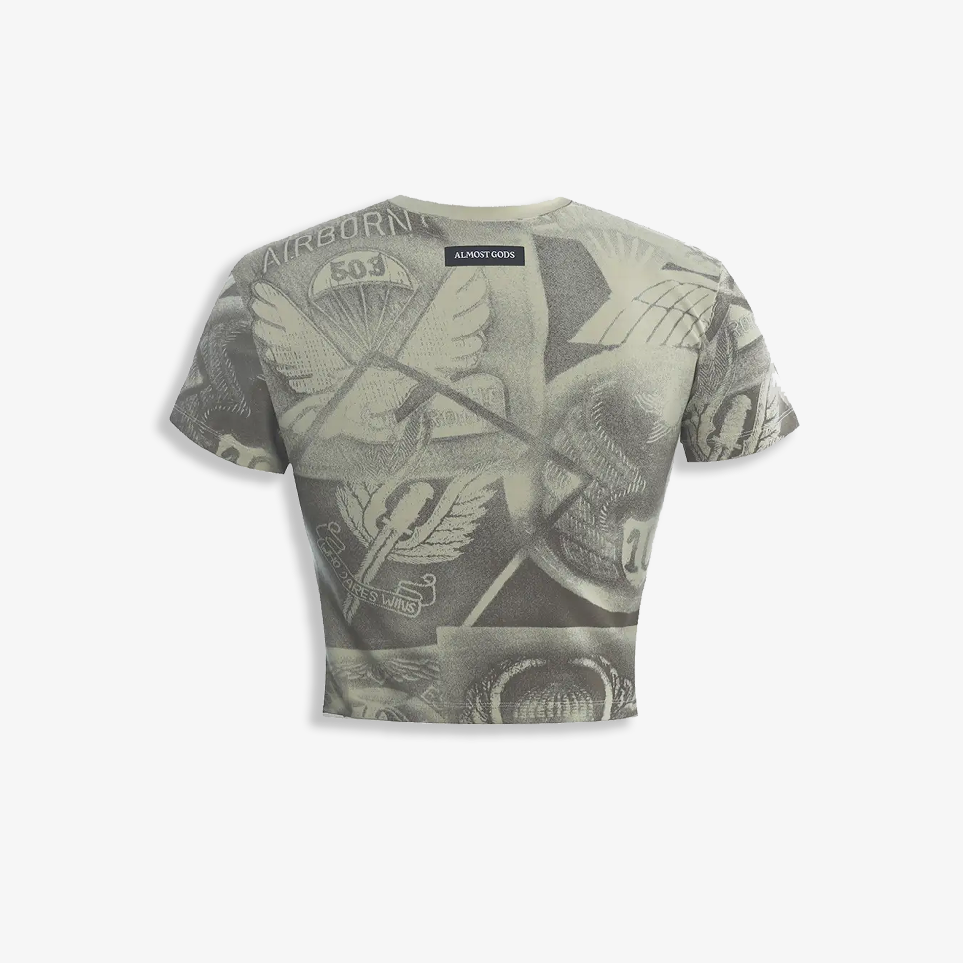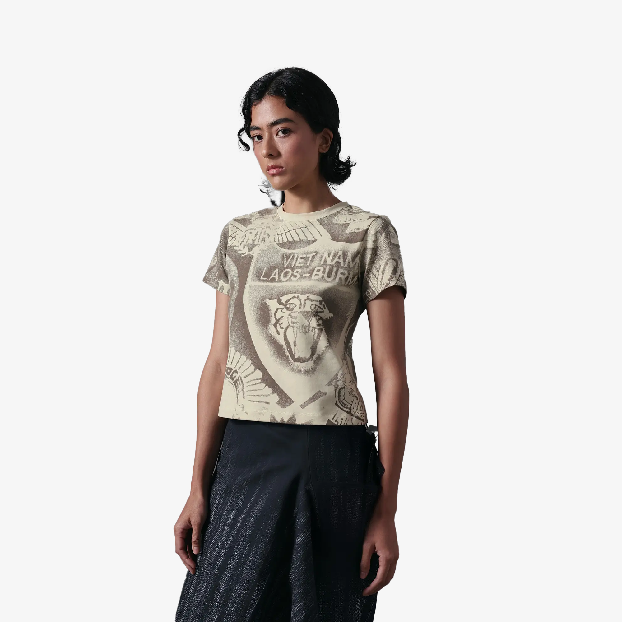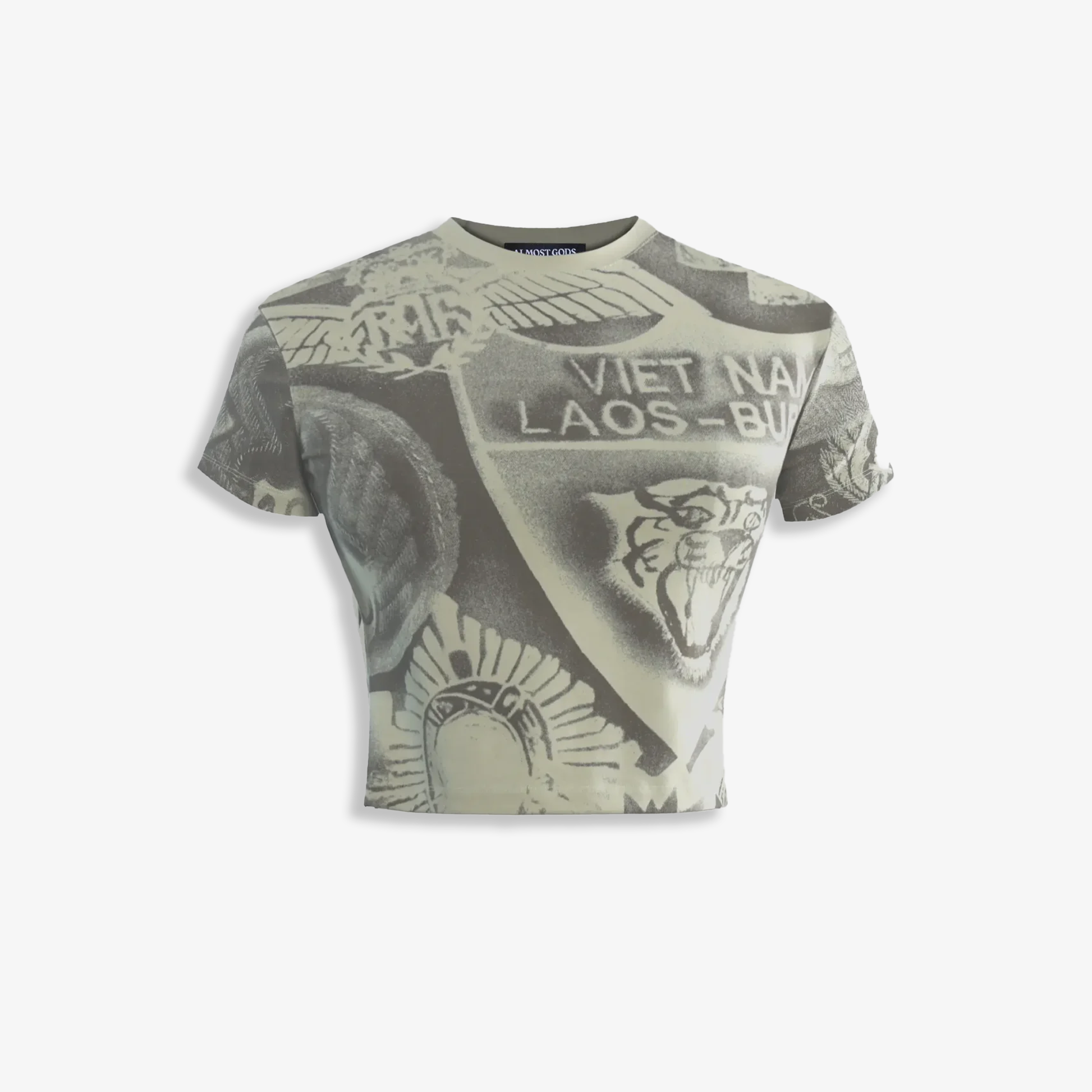 Relaxed-fit tee featuring a fading tapestry of Vietnam War-era badges, rendered in a fading spray-paint effect.