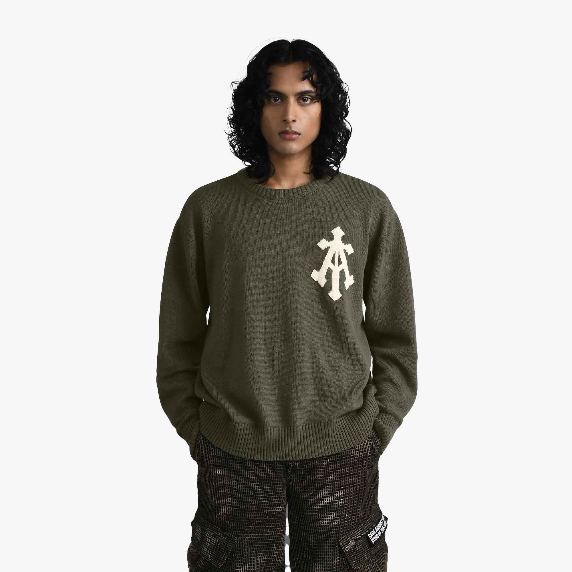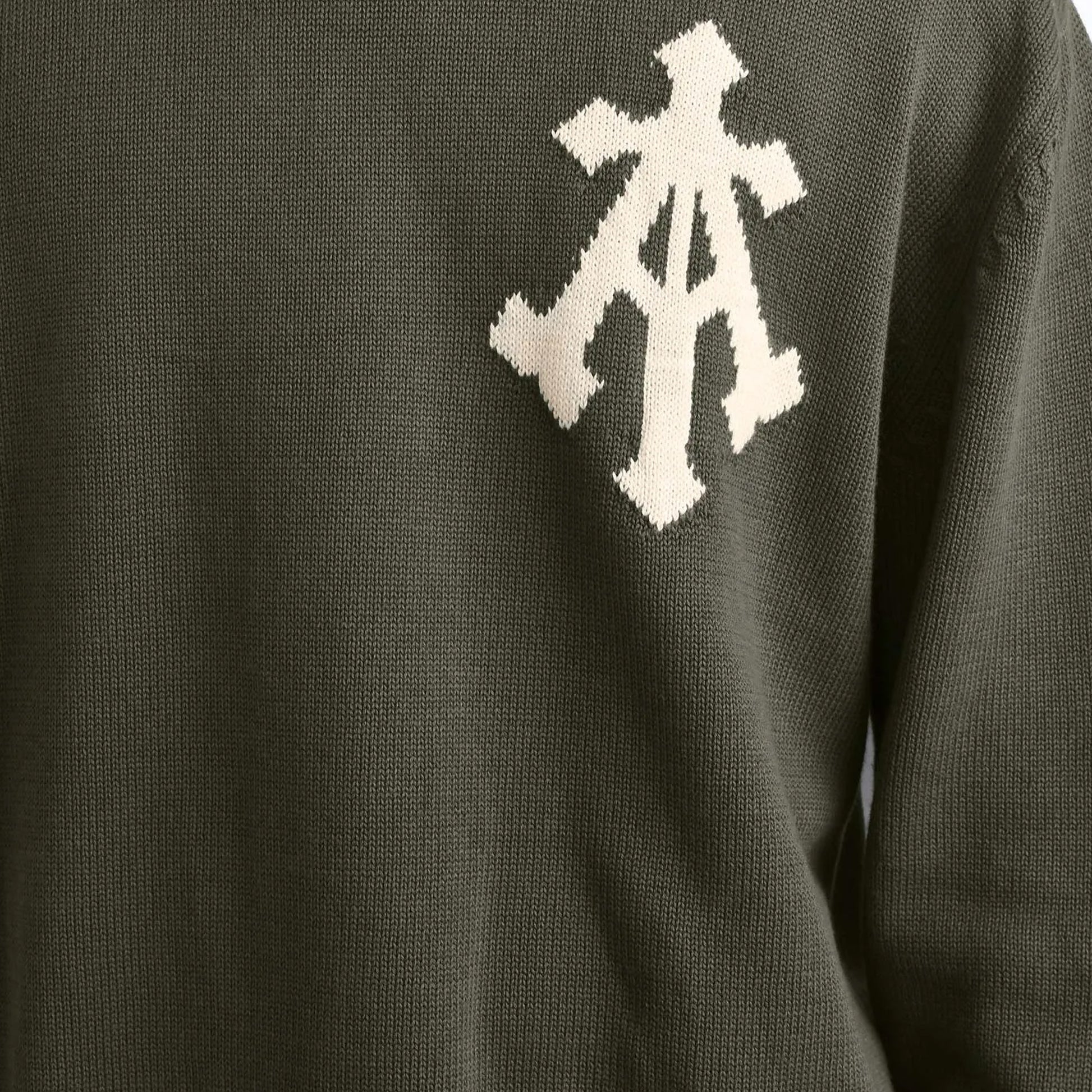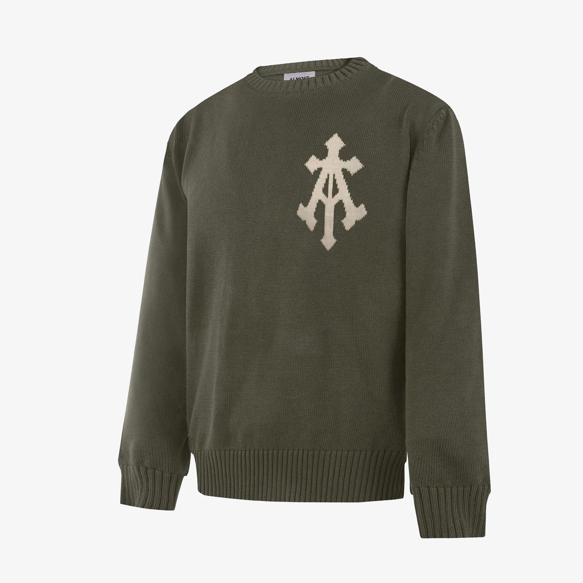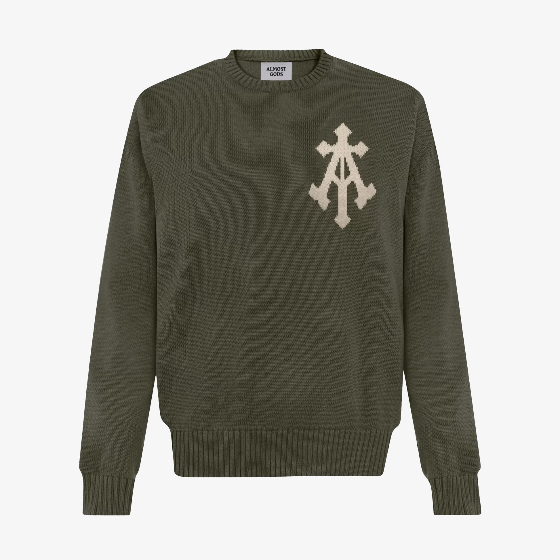 Relaxed cut knit sweater featuring the Alpha Cross knitted in off-white on an olive base.