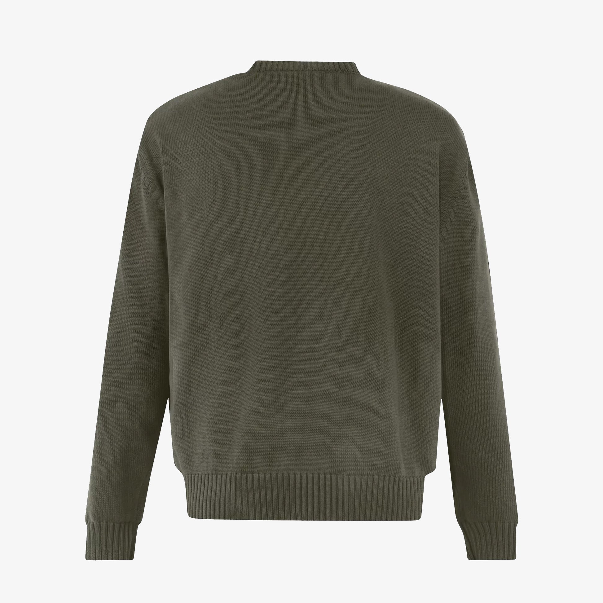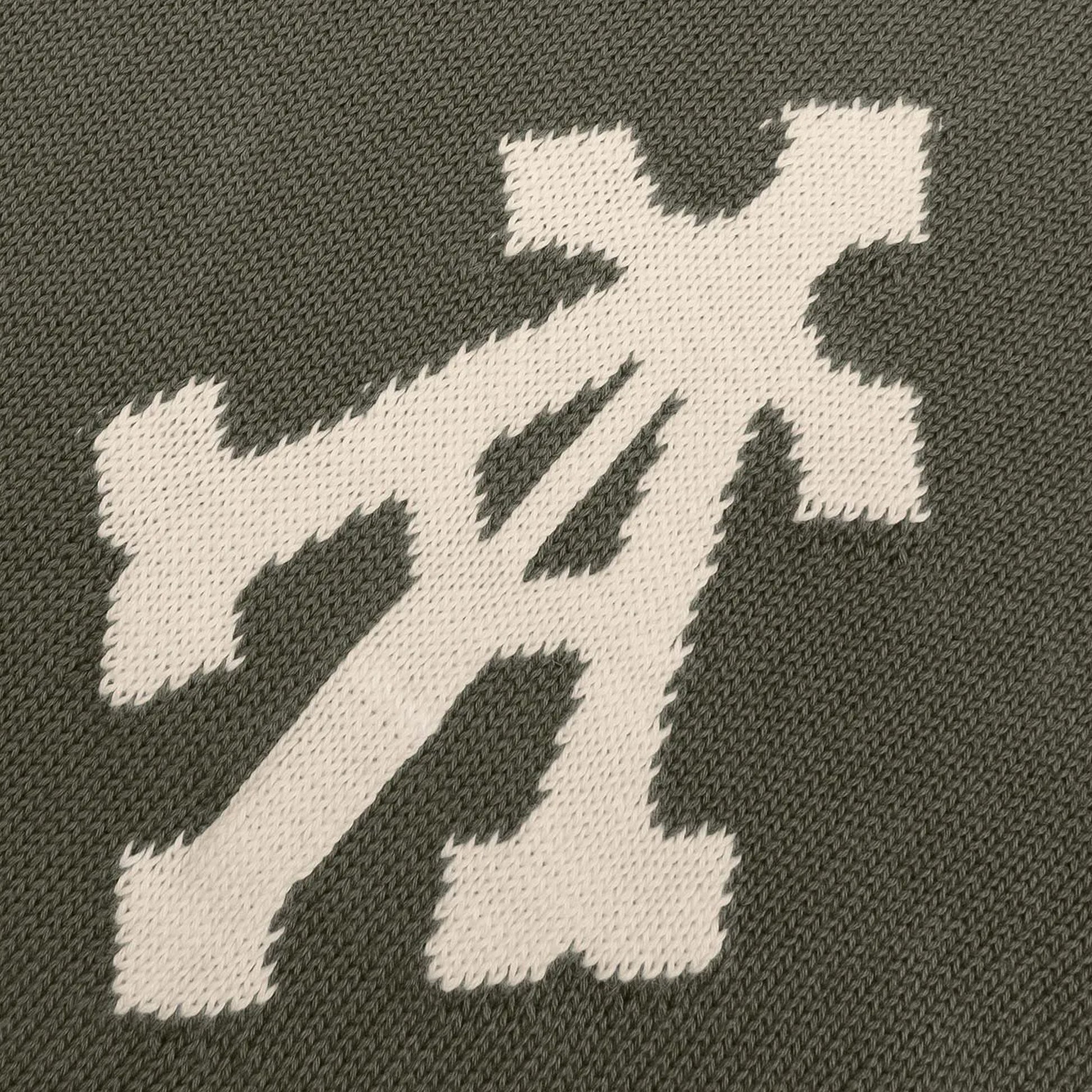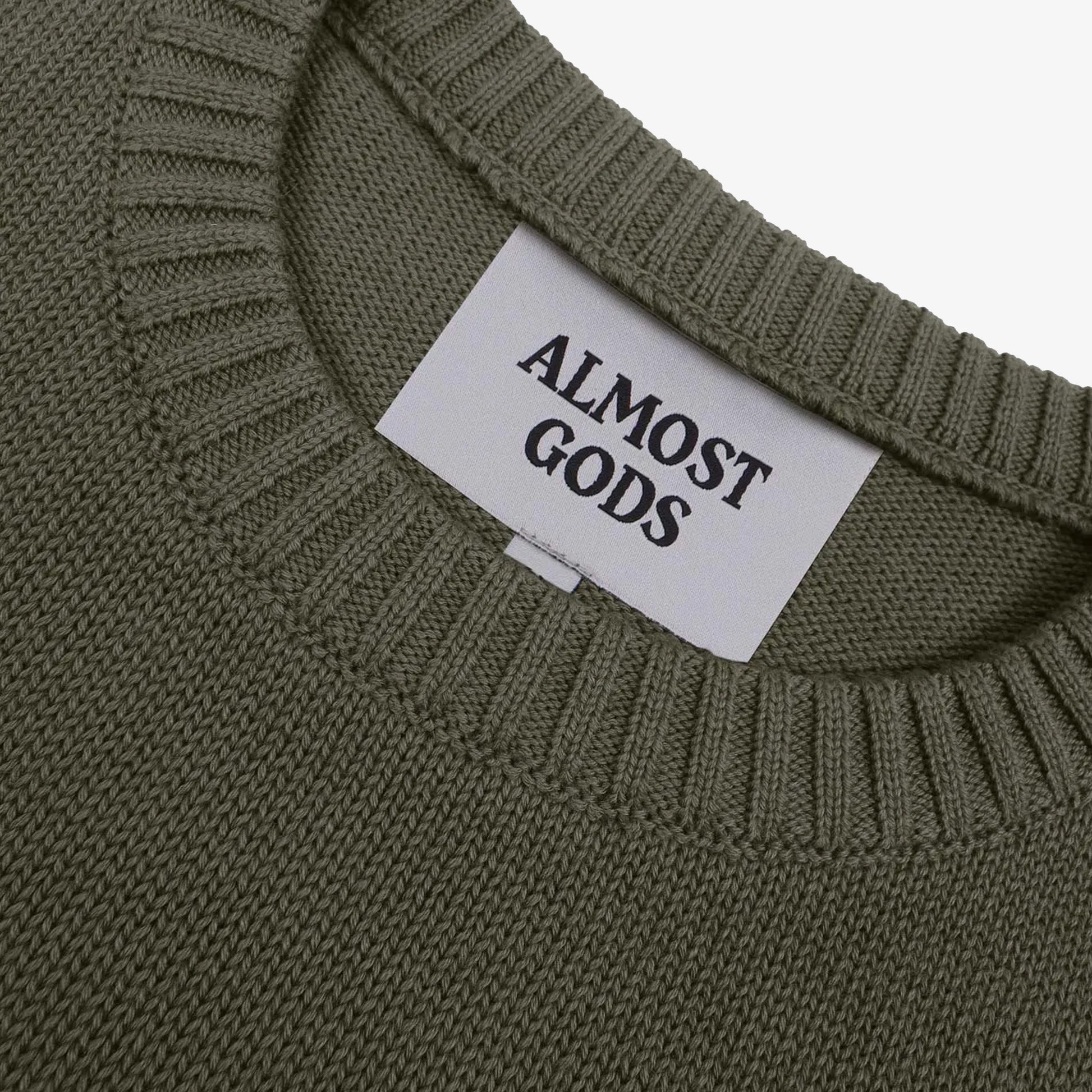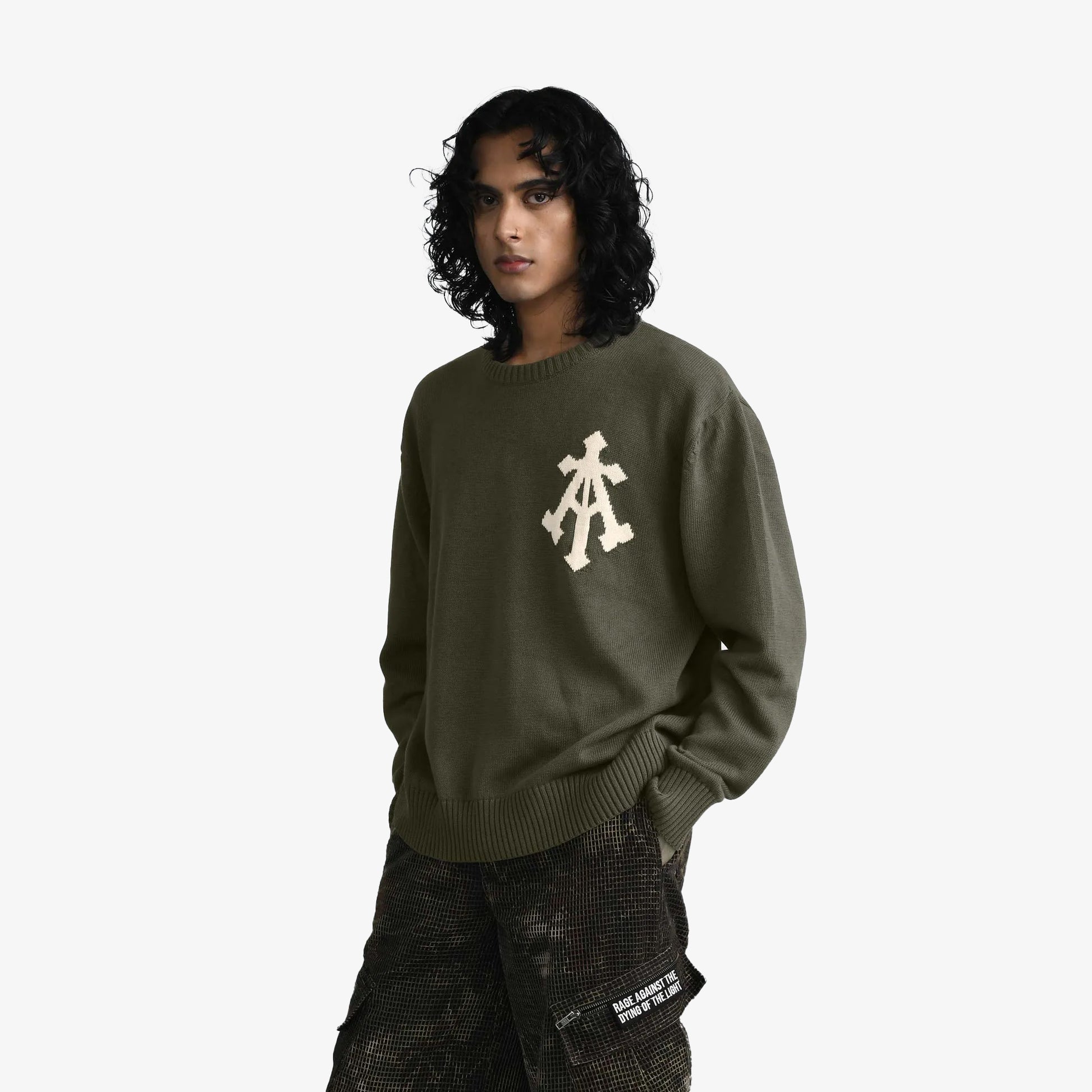 Relaxed cut knit sweater featuring the Alpha Cross knitted in off-white on an olive base.