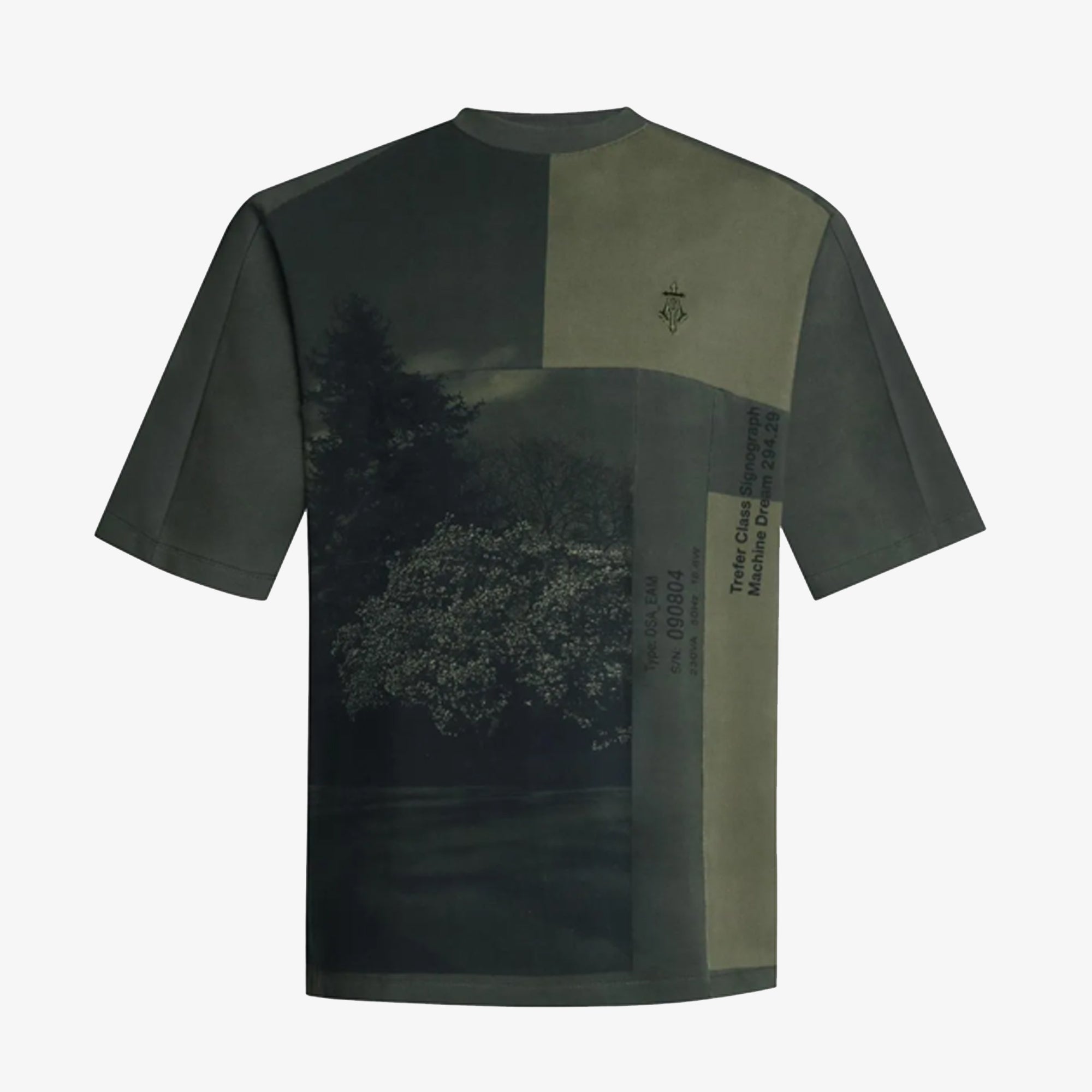 Oversized tee featuring a paneled construction inspired by Kunel Gaur’s artwork.