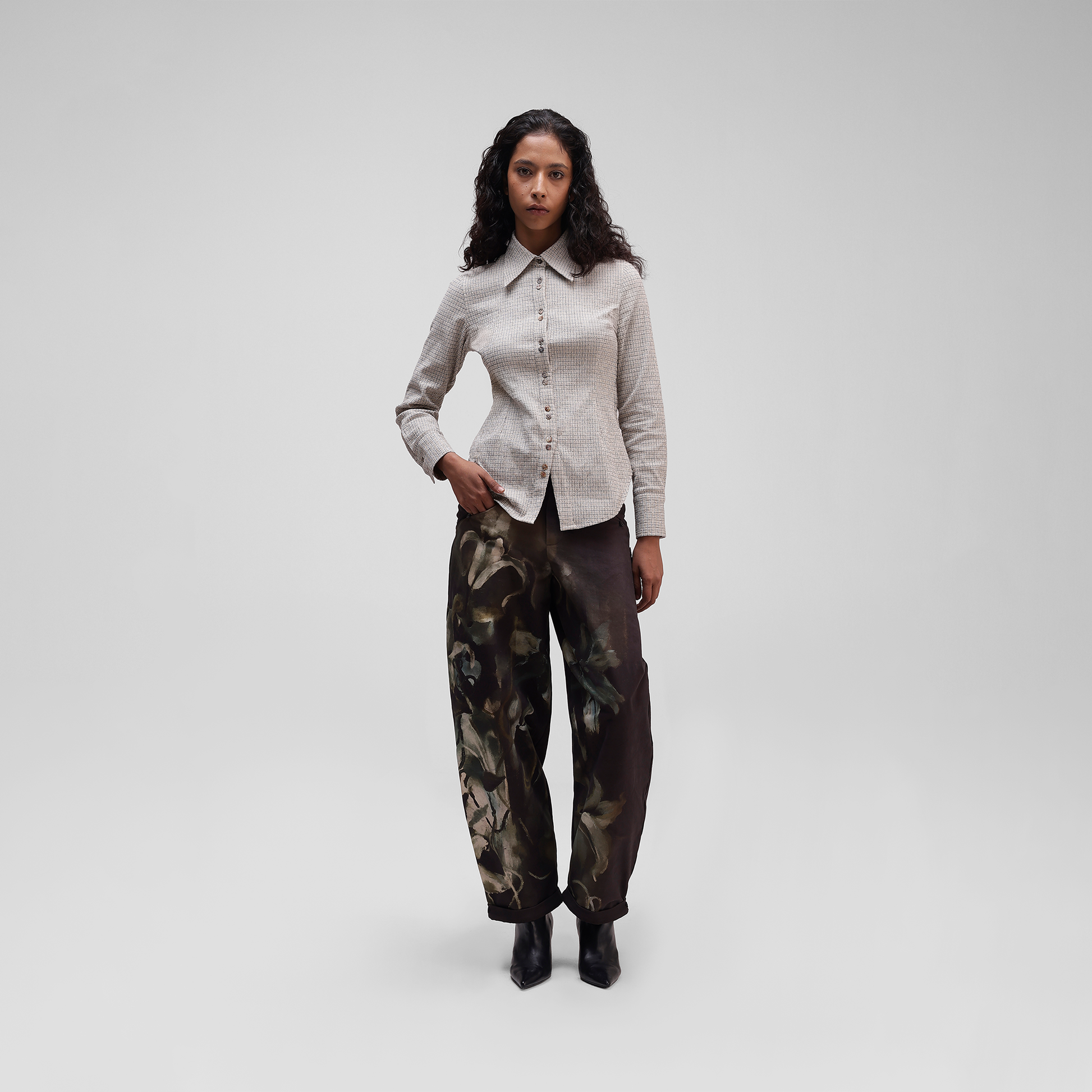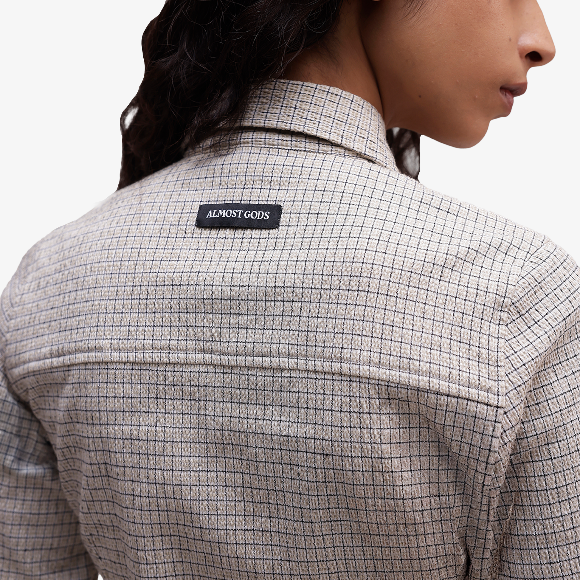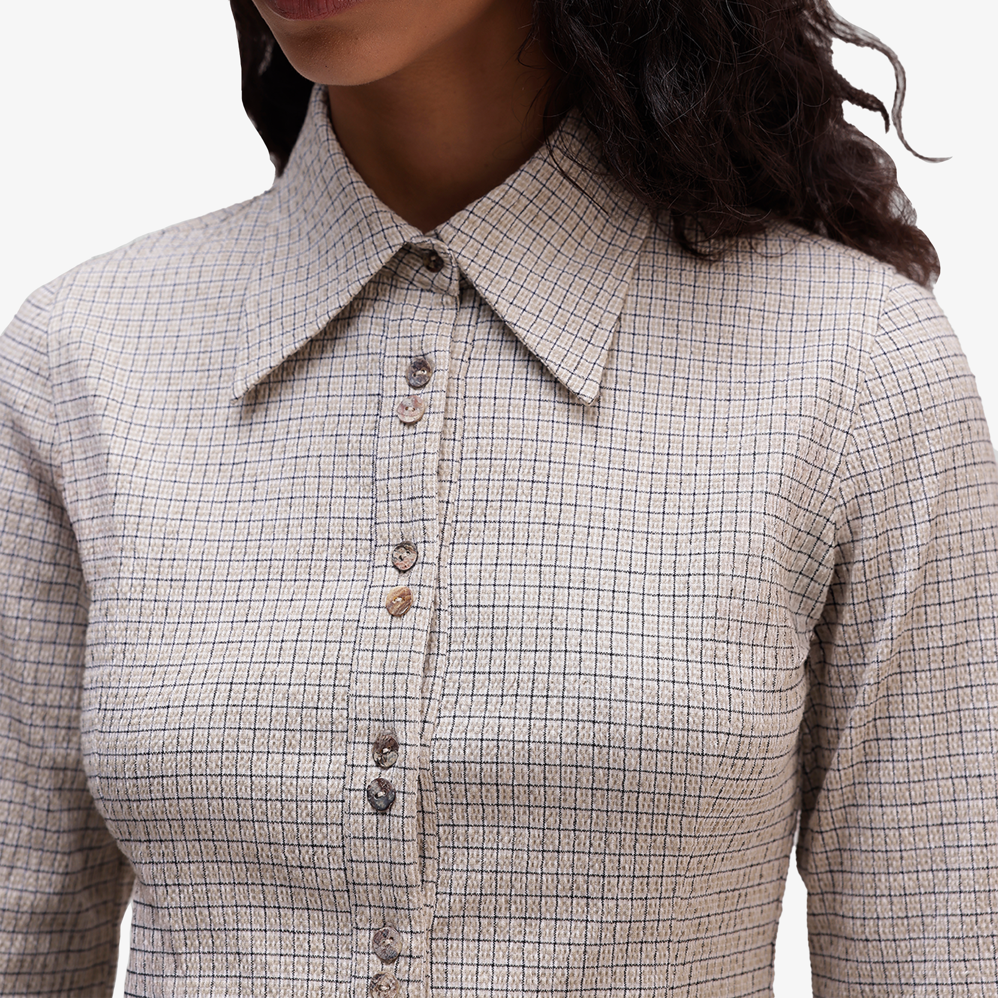 A long, fitted shirt cut in checked seersucker fabric featuring real shell buttons, bringing in the natural balance and quiet strength of shell, formed through movement, pressure, and the pull of the ocean.