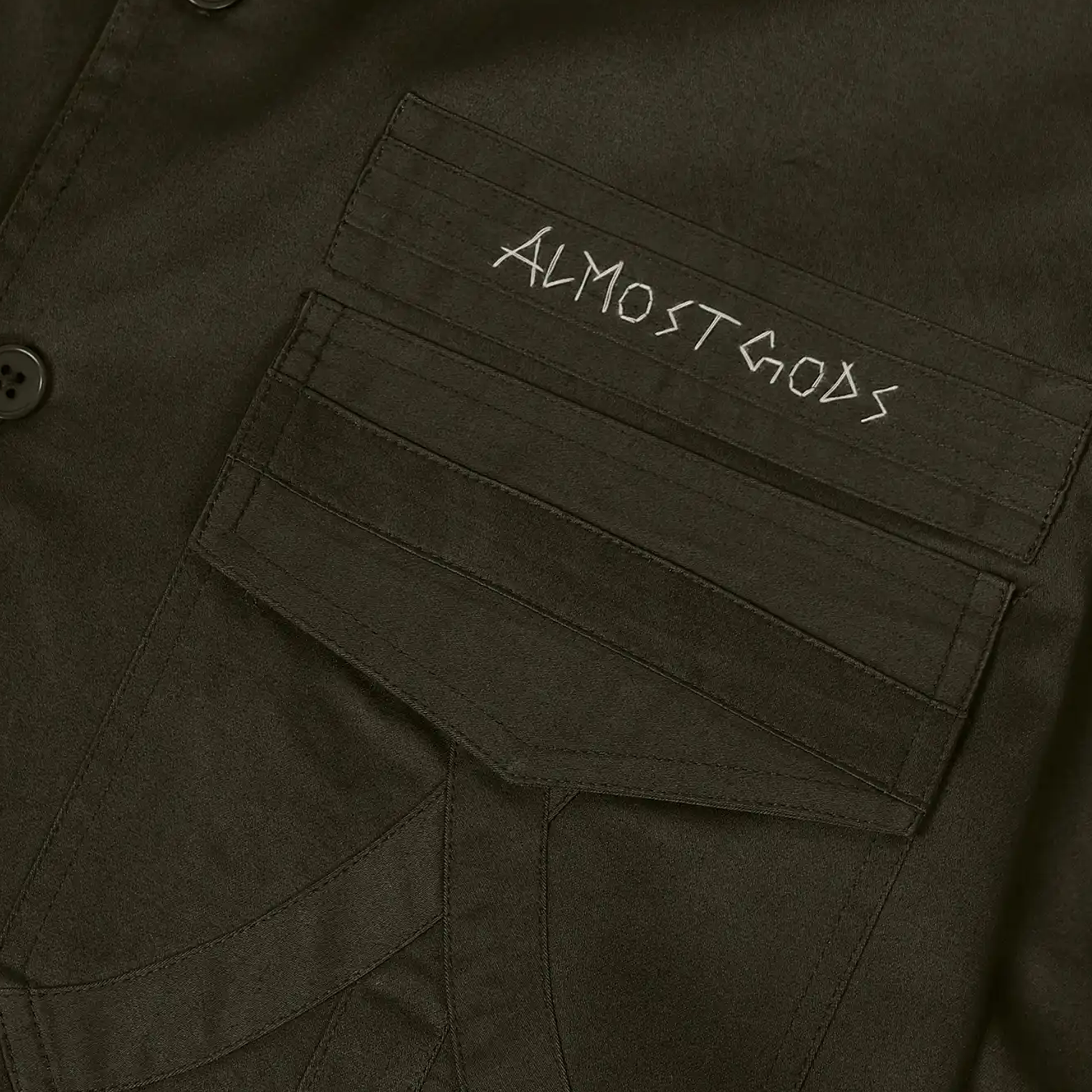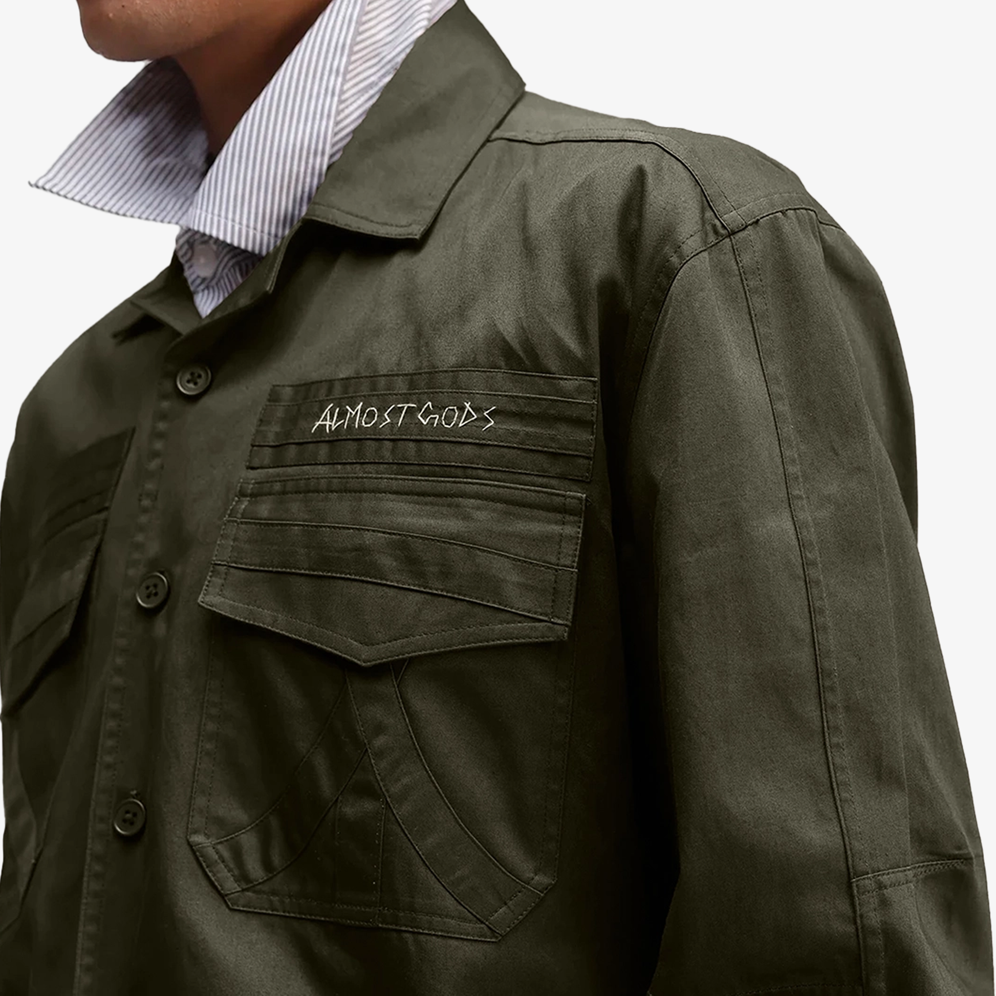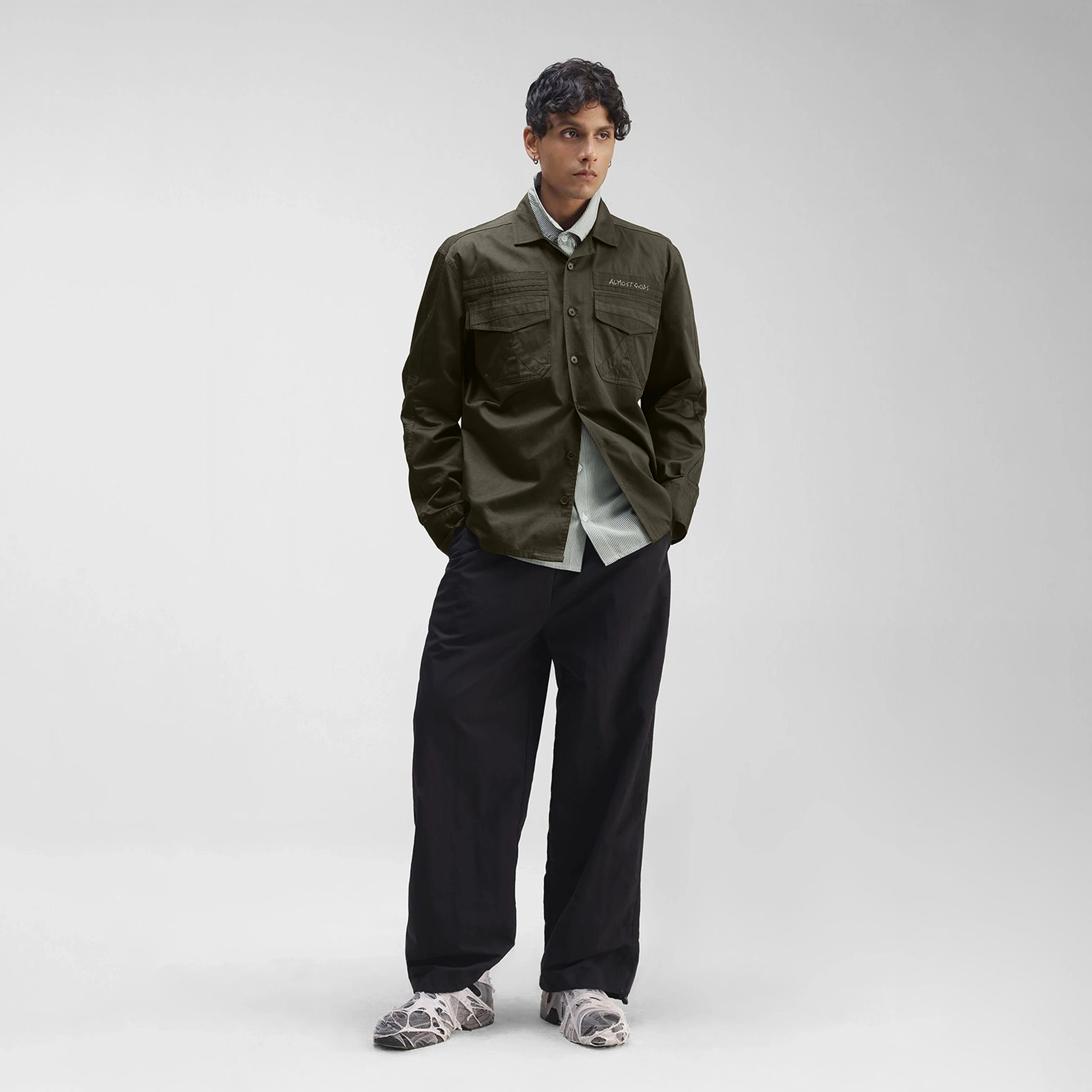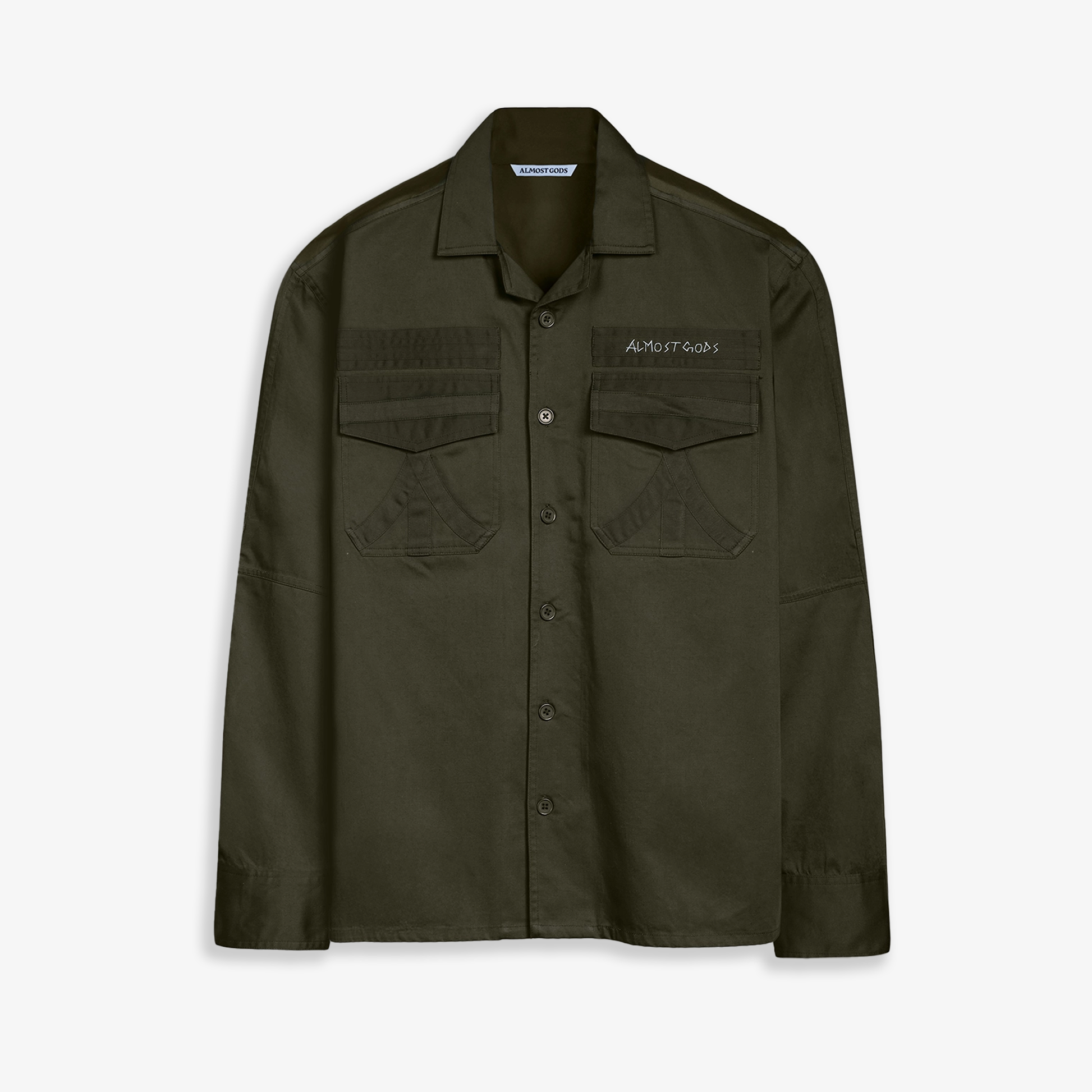 A play on military overshirts featuring chest pockets and a hand-embroidered Alpha Cross.