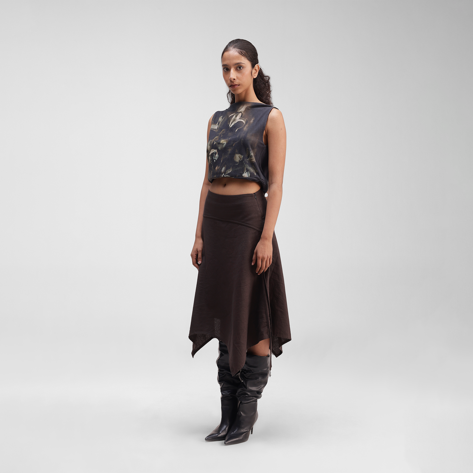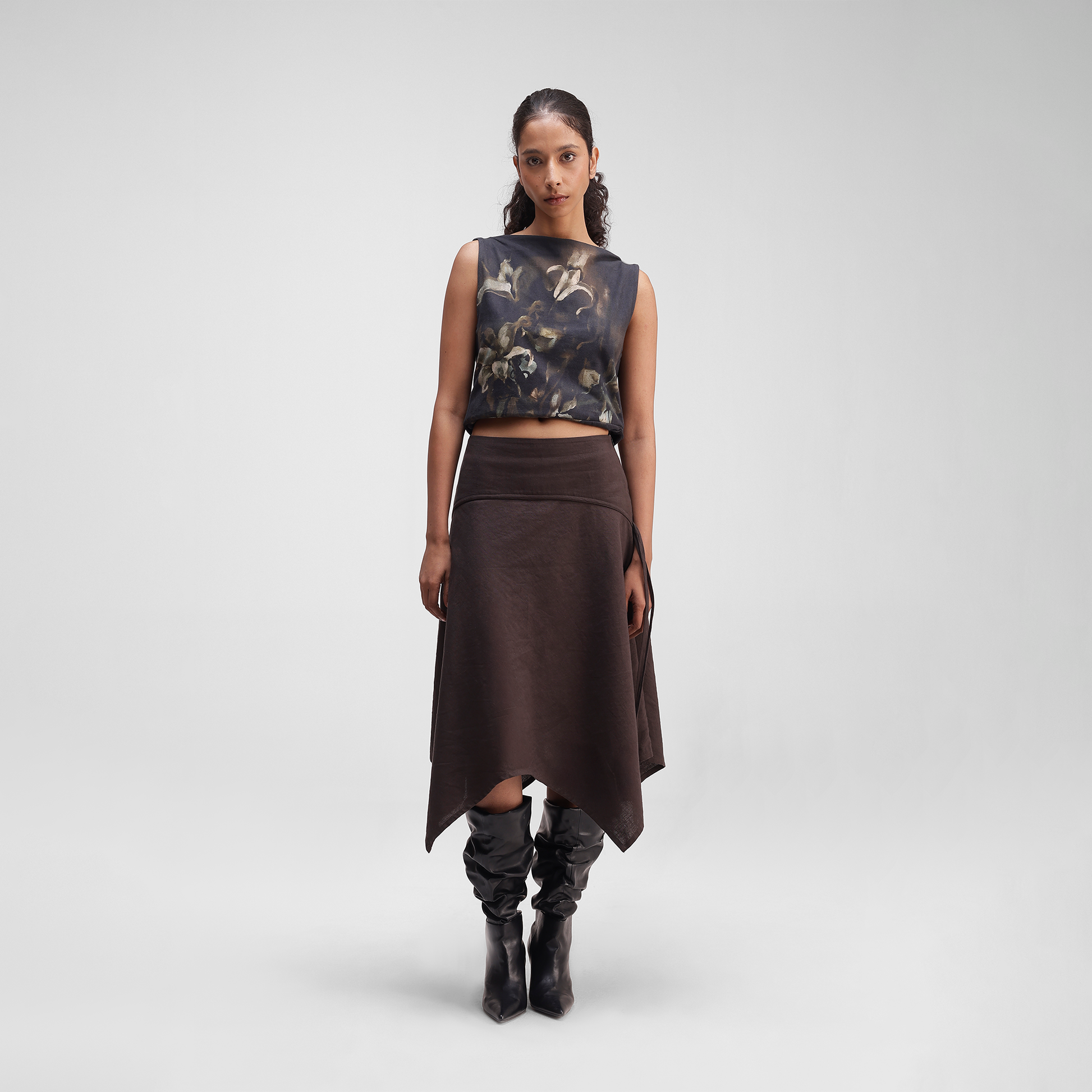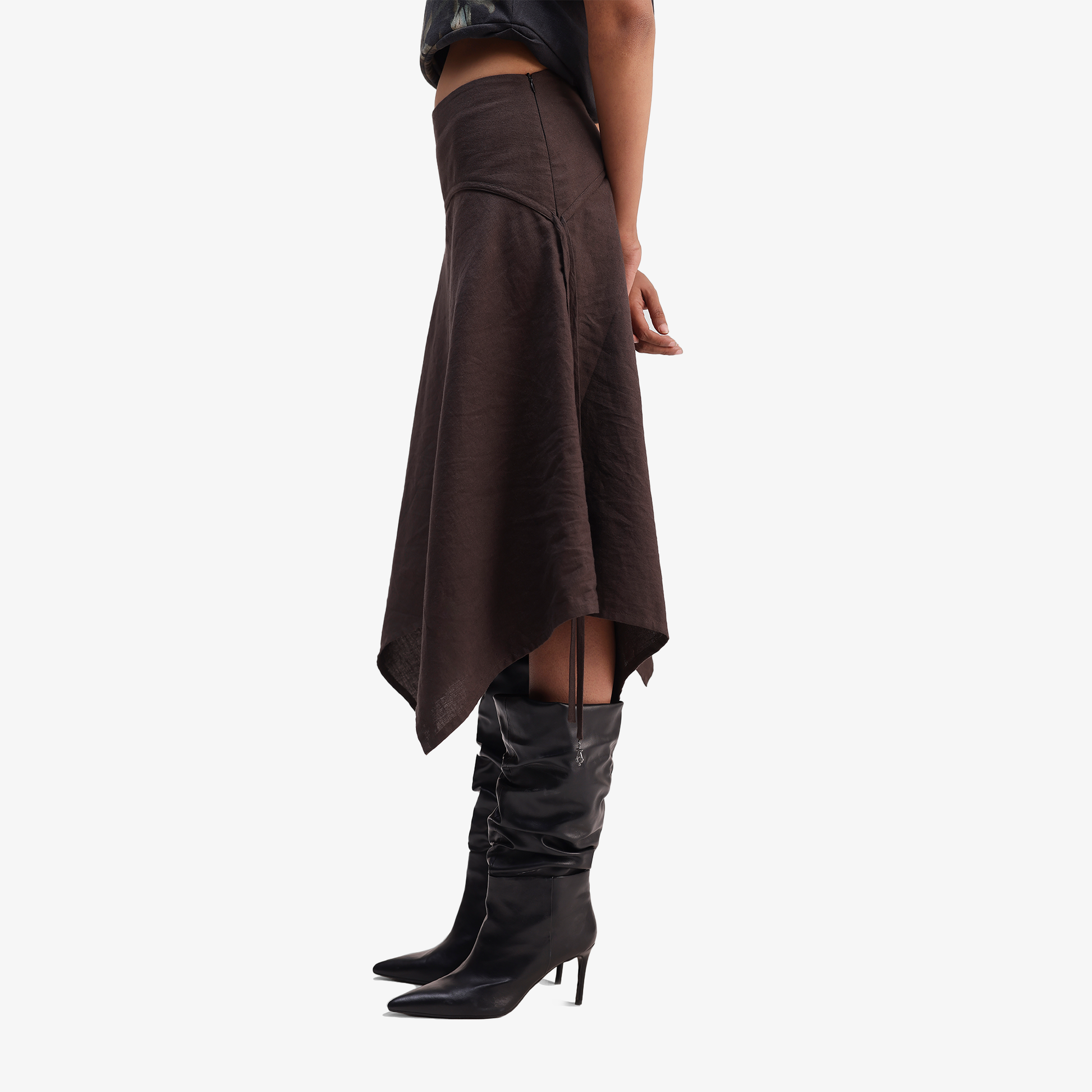Asymmetric hem skirt with a curved waistband, featuring signature Alpha Cross with the piping