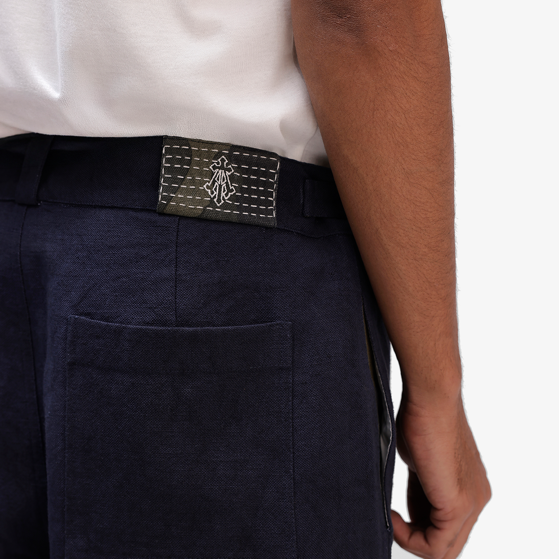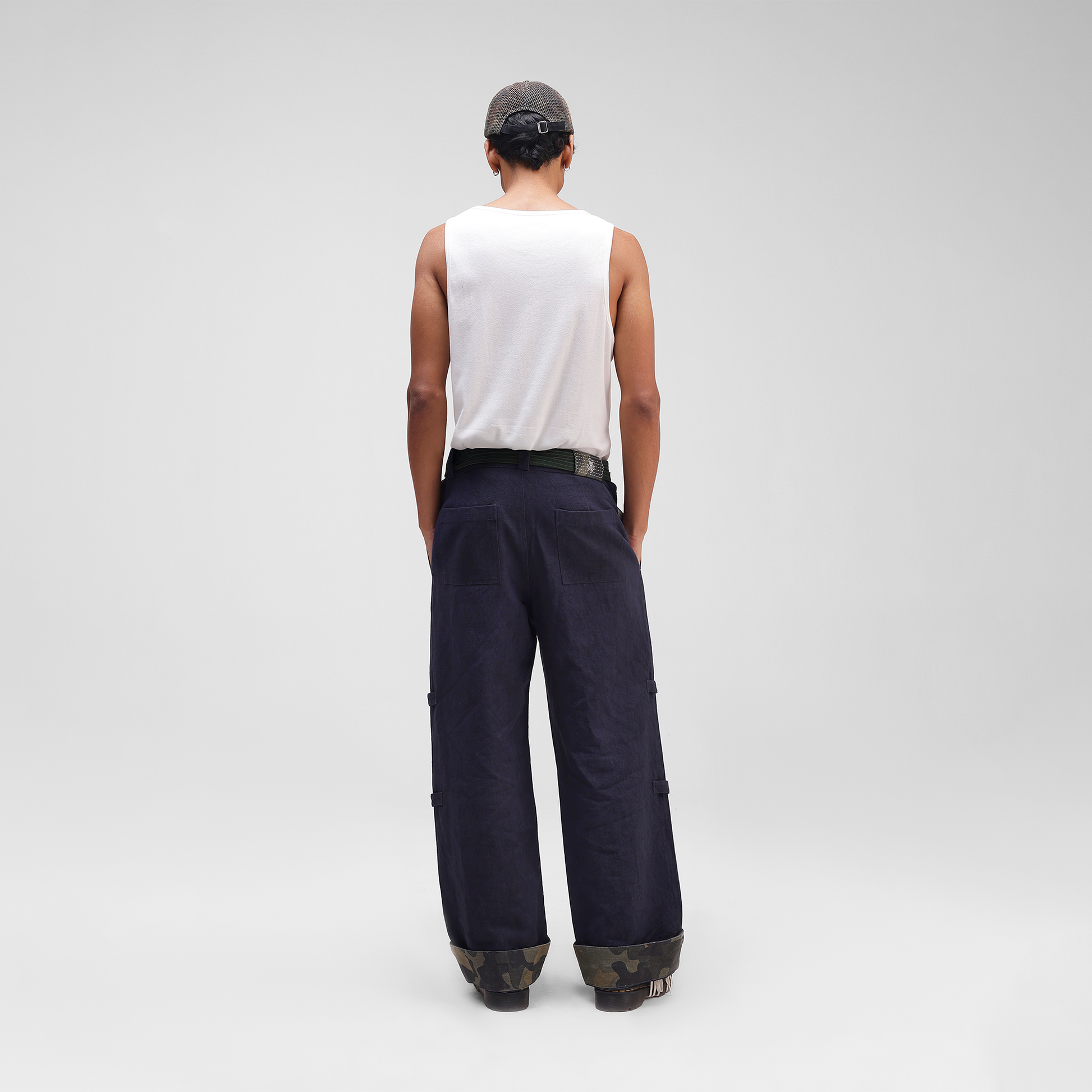 Relaxed, straight-legged trousers featuring a panelled front and a button-secured cuff fold lined with camouflage, allowing the length to extend and the silhouette to shift.