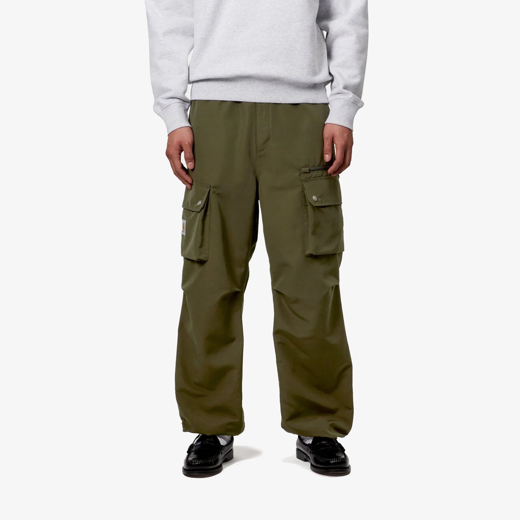 The Irwin Pants are an outdoor-inspired style made from lightweight, water-repellent polyester poplin. The silhouette is a relaxed tapered fit with a regular waist. Multiple pockets are placed on the front, sides, and back of the pants. There is also a zip pocket on the left leg. The Carhartt WIP square label tightens the design.