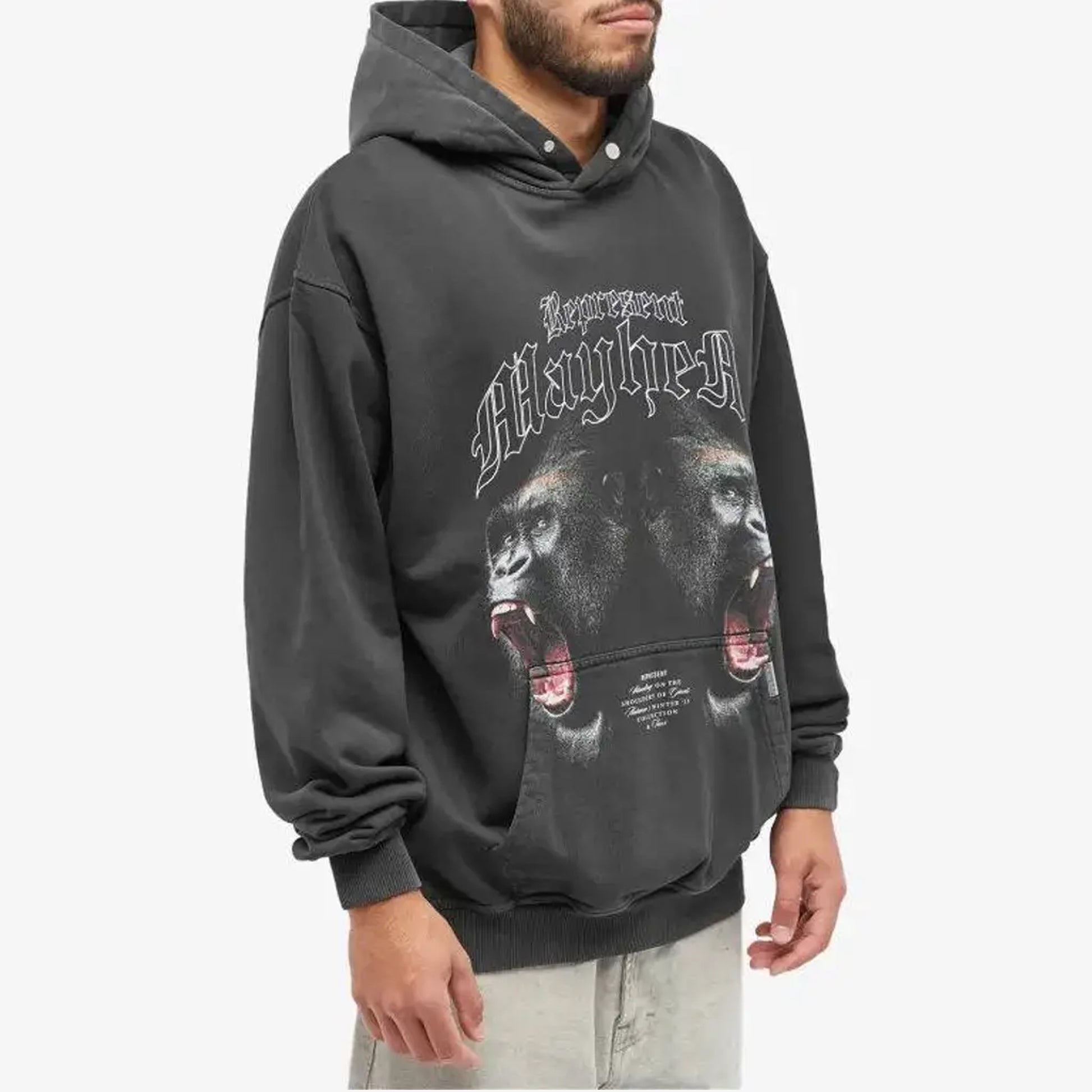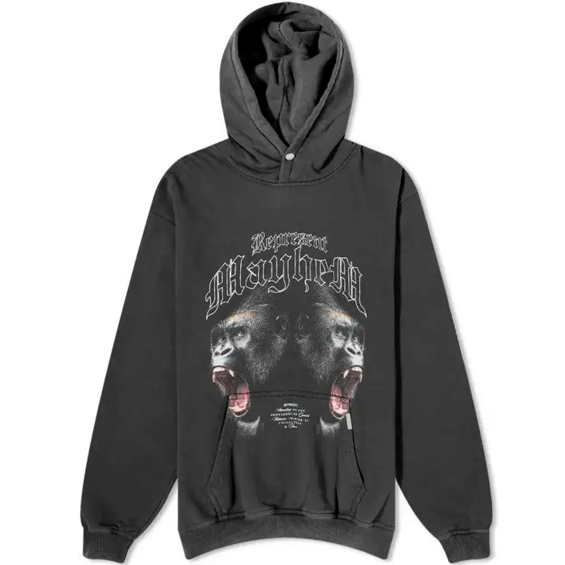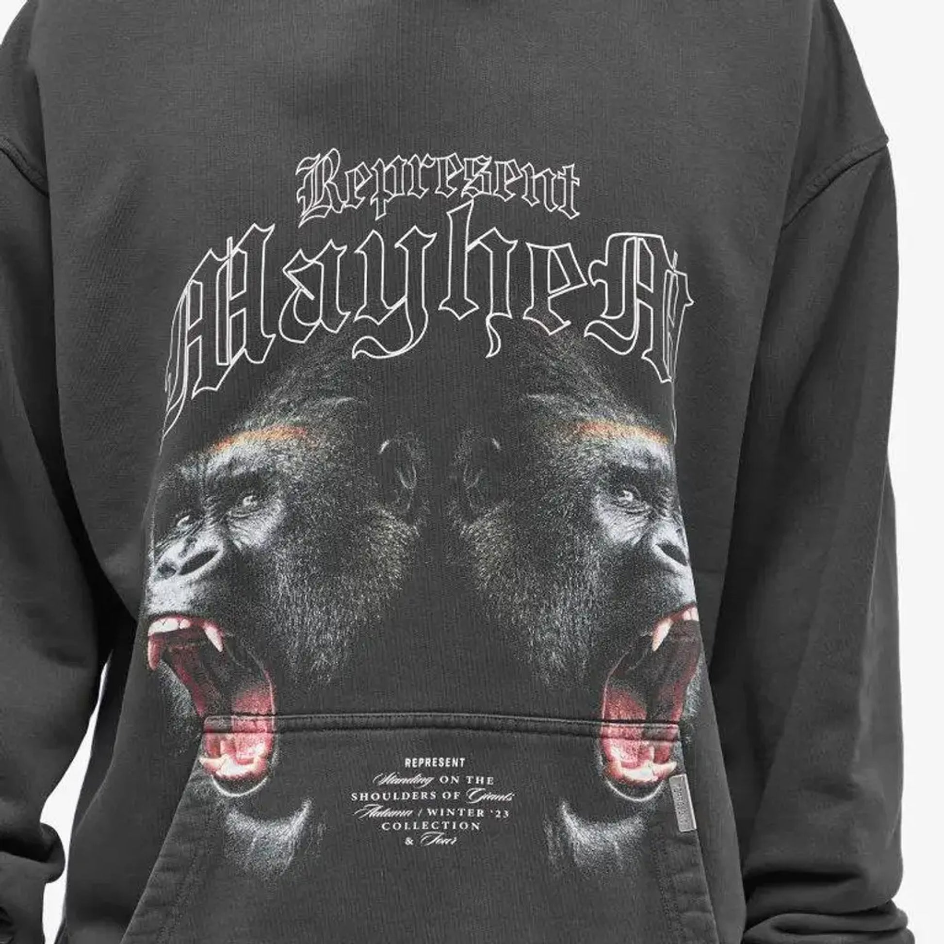 Originally Manchester born brothers George and Mike Heaton printed graphics on tees as a side hustle, flash forward 12 years and Represent is at the very top of the British streetwear scene. With premium fabrics throughout, collections vary from minimalist wardrobe staples to audacious graphic prints. Part of the AW23 collection, this hoodie is crafted from a luxury heavyweight cotton. Vintaged washed with a slightly oversized fit, an ape inspired mayhem graphic features on the chest. Finished with a metal bar logo on the hem.
