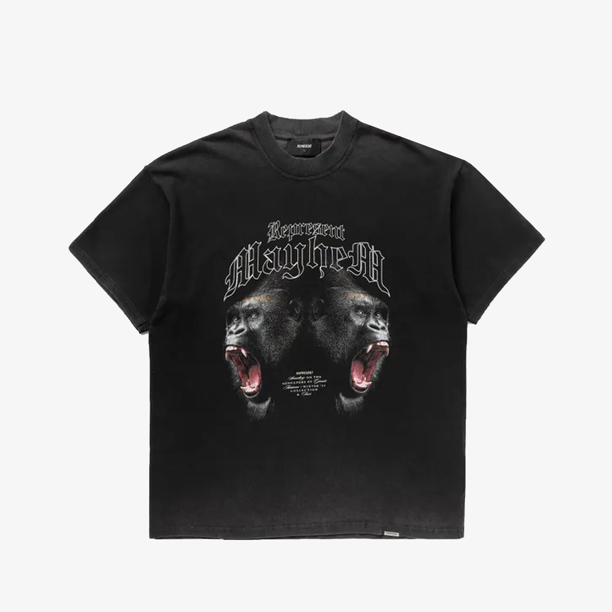 Originally Manchester born brothers George and Mike Heaton printed graphics on tees as a side hustle, flash forward 12 years and Represent is at the very top of the British streetwear scene. With premium fabrics throughout, collections vary from minimalist wardrobe staples to audacious graphic prints. Part of the AW23 collection, this tee is crafted from a medium weight cotton. Vintaged washed with a slightly oversized fit, an ape inspired mayhem graphic features on the chest. Finished with a metal bar logo on the hem.