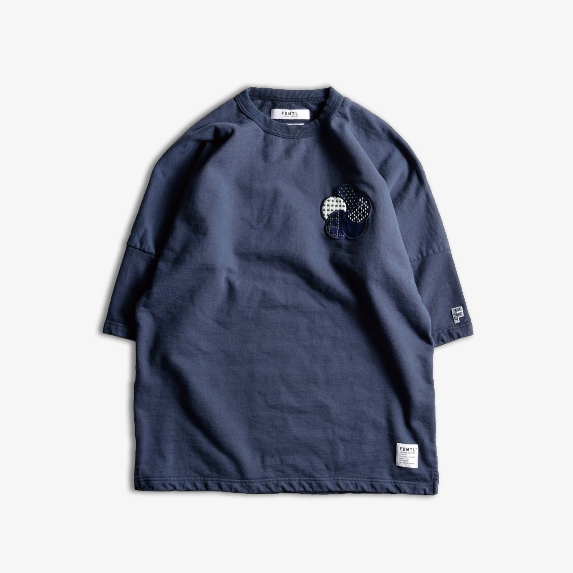 This crewneck sweat T-shirt is crafted from loopback fabric. It features a patch made from indigo fabric on the chest. A small 'F' patch is attached to the left cuff. To enhance the fabric's texture, it has undergone a one-wash treatment.