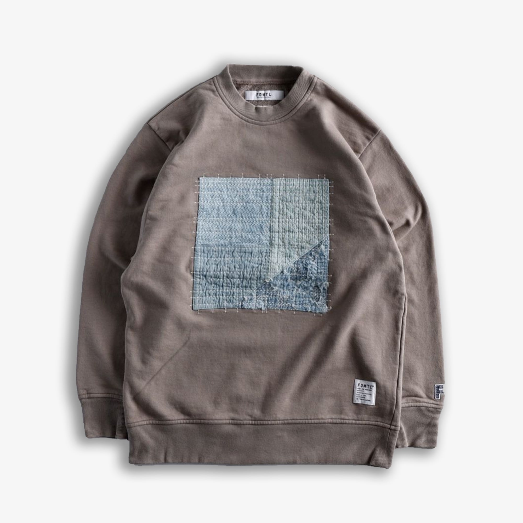 Hailing from Japan, a country renowned for their gold standard denim, FDMTL have been producing bespoke denim goods since 2005. They champion the ethos of quality over volume of production, striving to make garments that can't be easily reproduced on mass. A lot of their inspiration stems from the Boro patchwork technique that combines offcuts of denim as means of repair for a garment, creating a unique blend of differently aged patches of denim material. This garment carries the brand's signature denim style into another wardrobe staple, the crewneck sweatshirt. A dyed cotton is the backdrop for denim overlaid patches on the chest in the Boro patchwork style, with white stitching finishing the look. A small F patch on the left hand cuff is a subtle piece of branding, with a white woven label on the hem for a further nod to FDMTL.