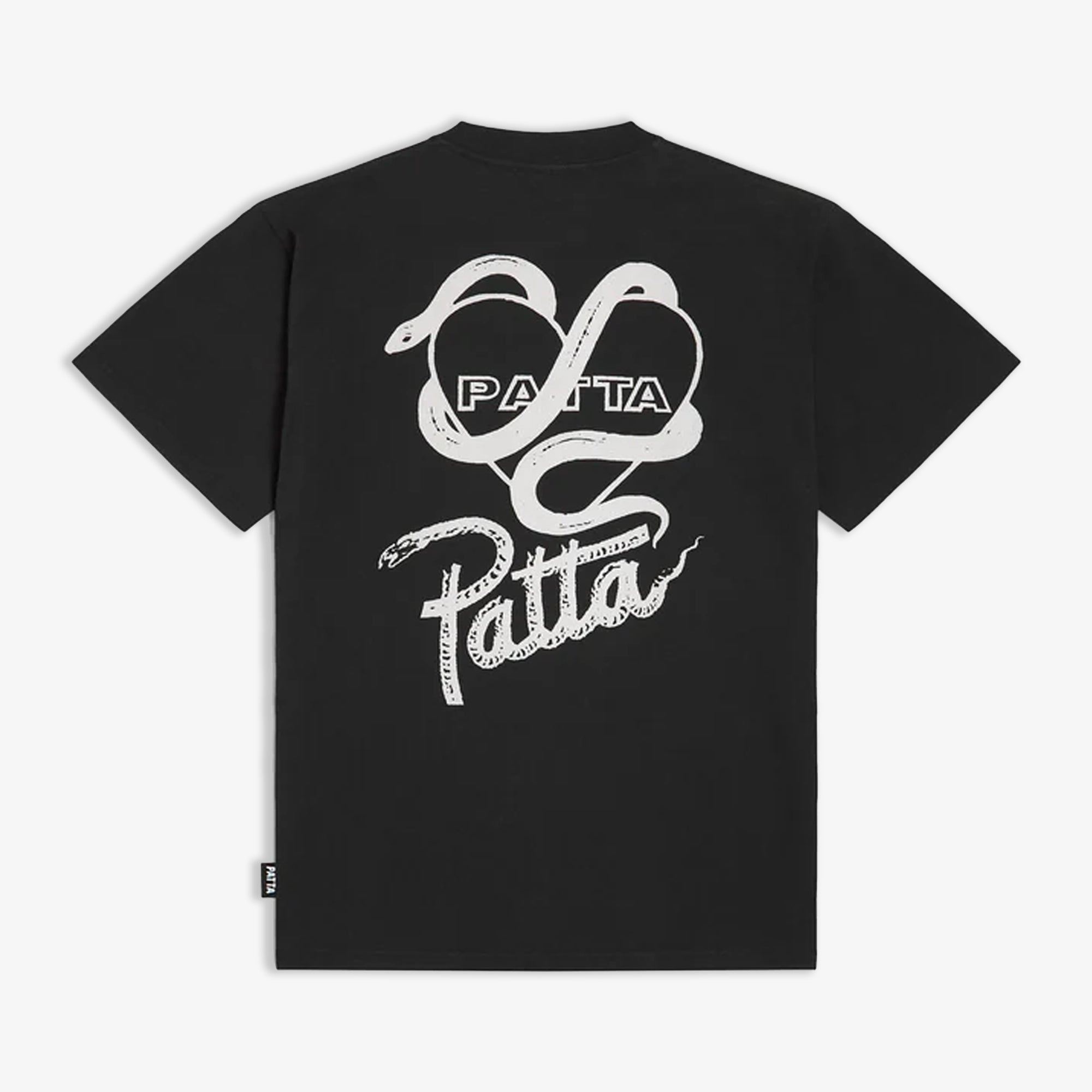 The Patta Snake Heart T-Shirt in Moonless Night comes in 230gsm 100% Cotton. Silkscreen printed Snake Heart graphics sit on the back of the t-shirt while the front is detailed with a small Snake Patta script logo.