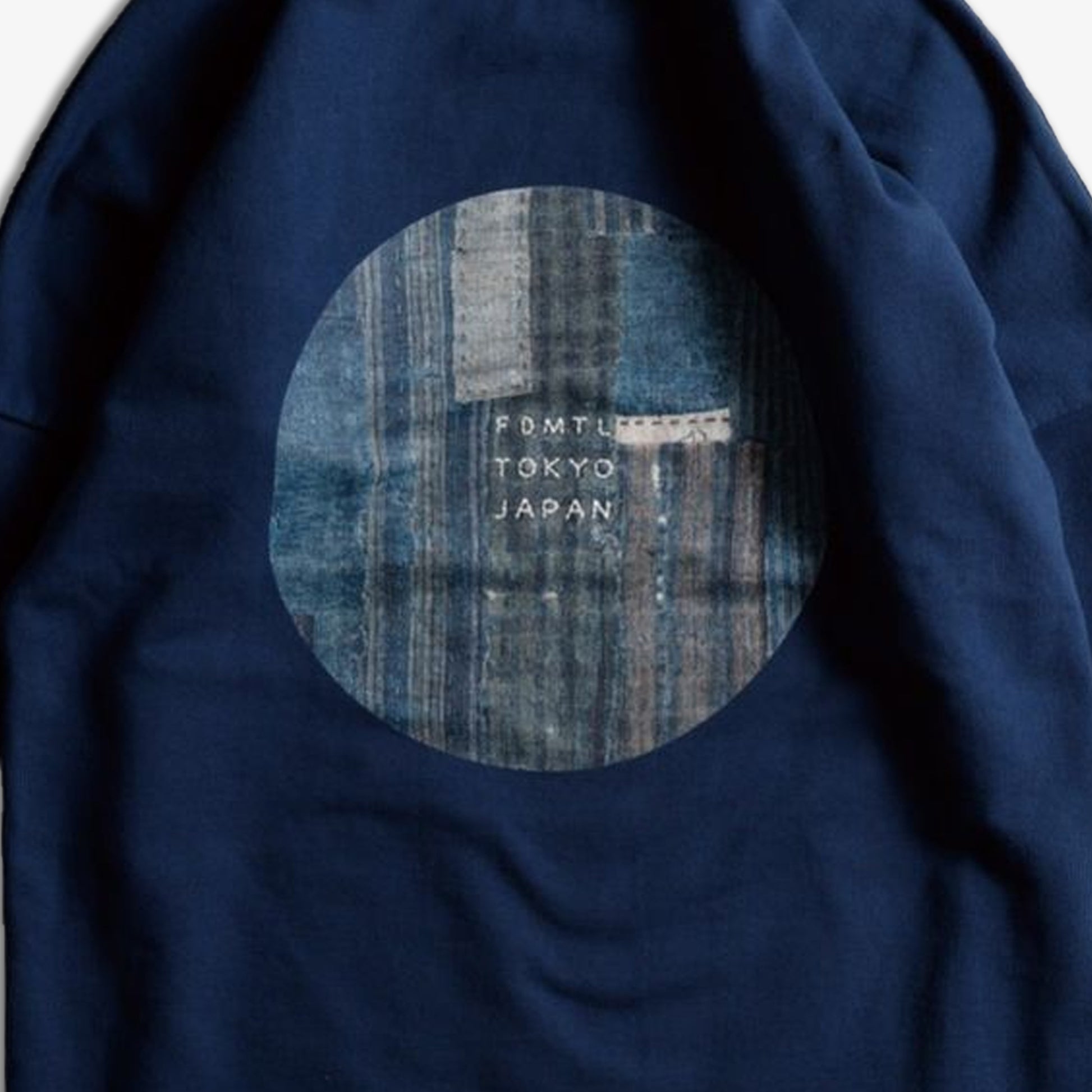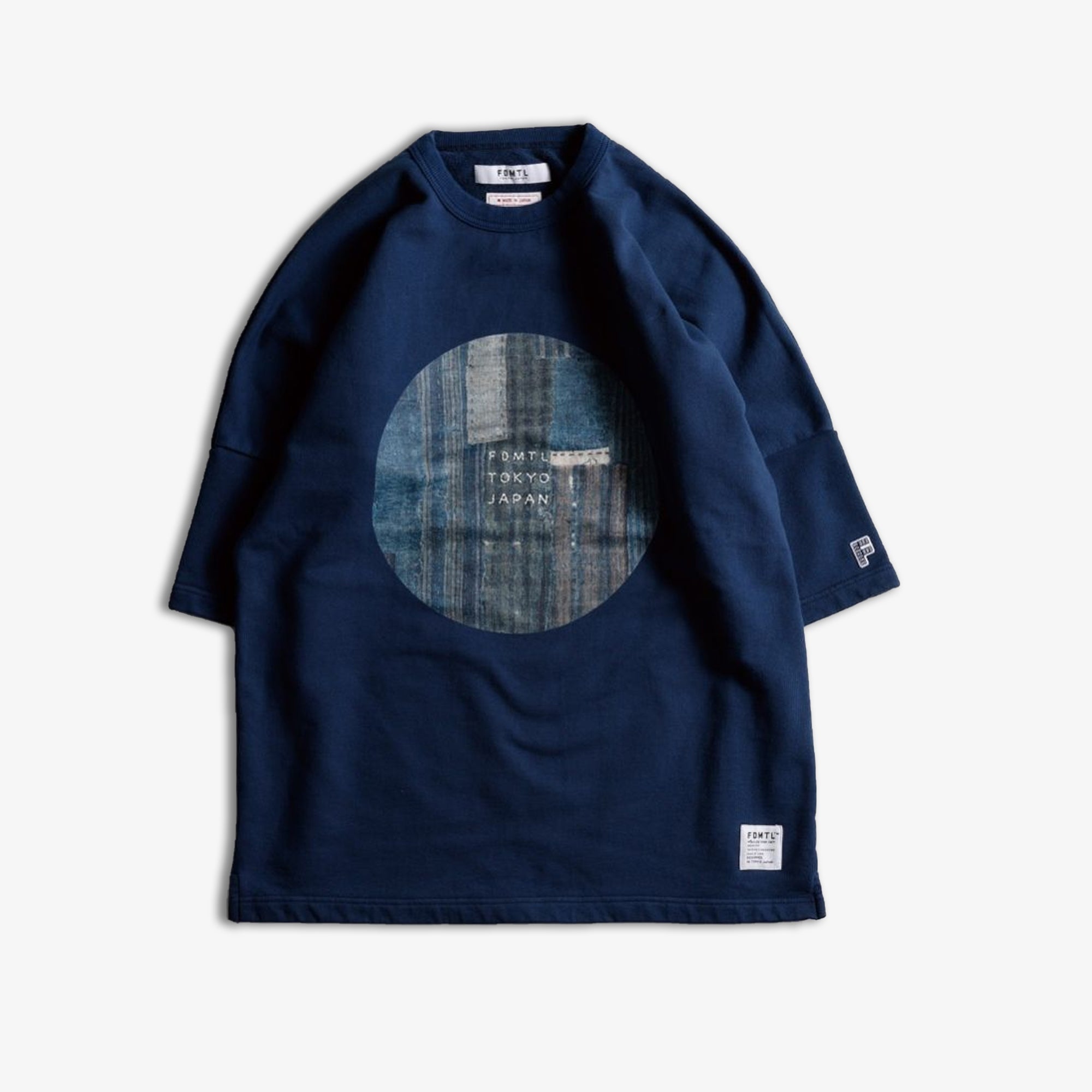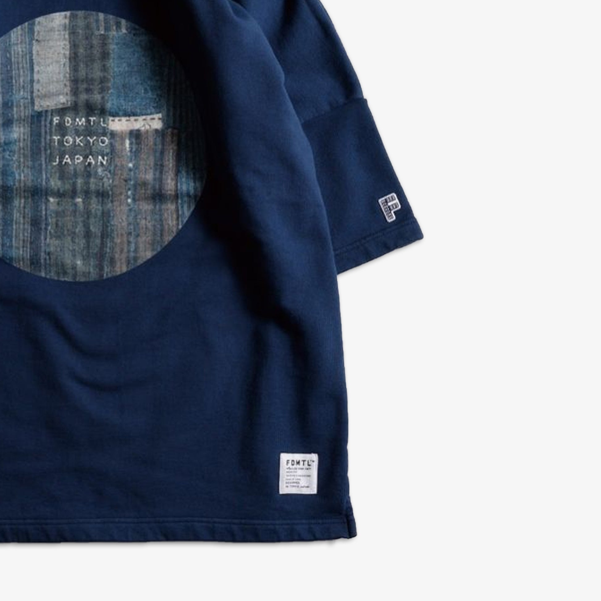 This crewneck sweat T-shirt is crafted from loopback fabric. The chest features an inkjet print of distressed fabric motif. The central FDMTL logo is embroidered. A small 'F' patch is attached to the left cuff. To enhance the fabric's texture, it has undergone a one-wash treatment.