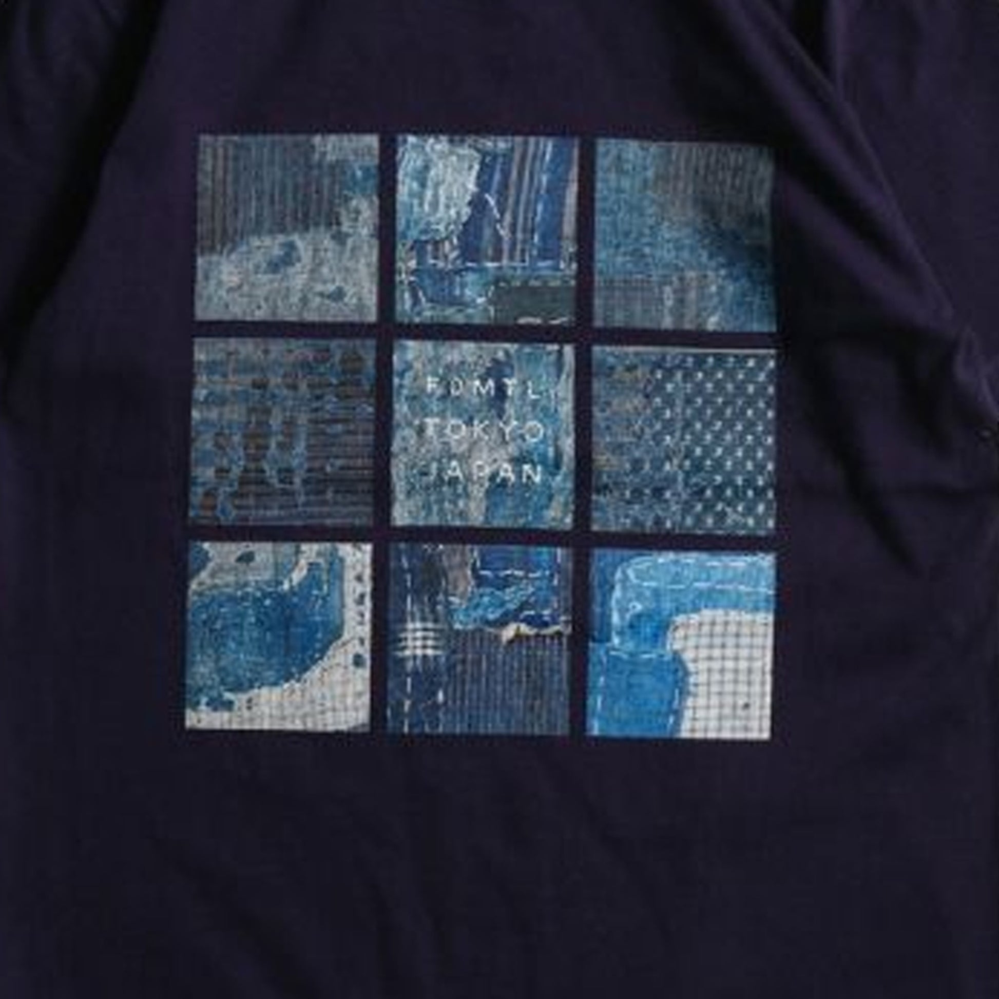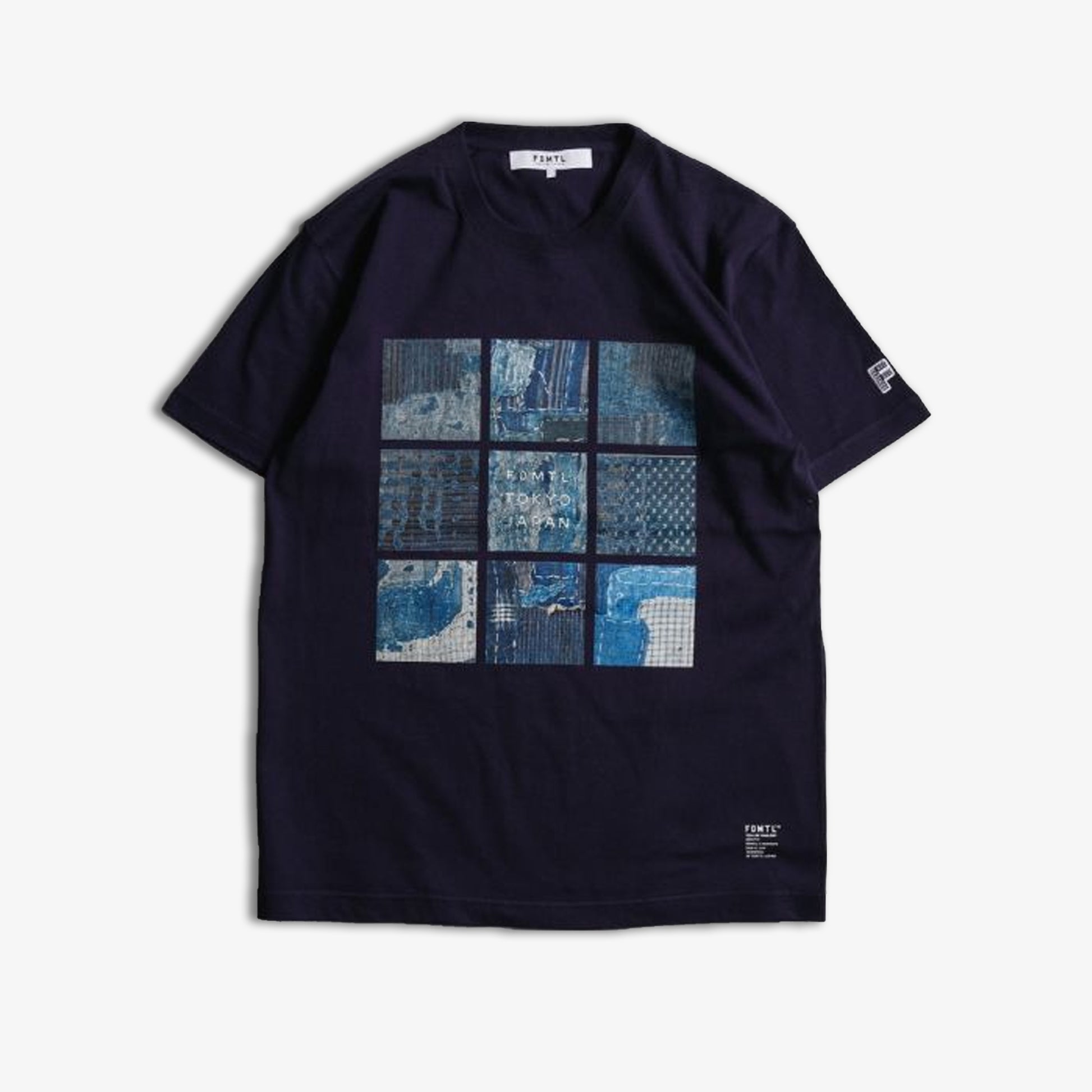 This T-shirt is made from a robust 7.2-ounce equivalent jersey fabric. It features an inkjet print of a distressed fabric motif on the chest, resembling a patchwork effect. The central FDMTL logo is embroidered. A small F logo patch is placed on the left sleeve cuff.