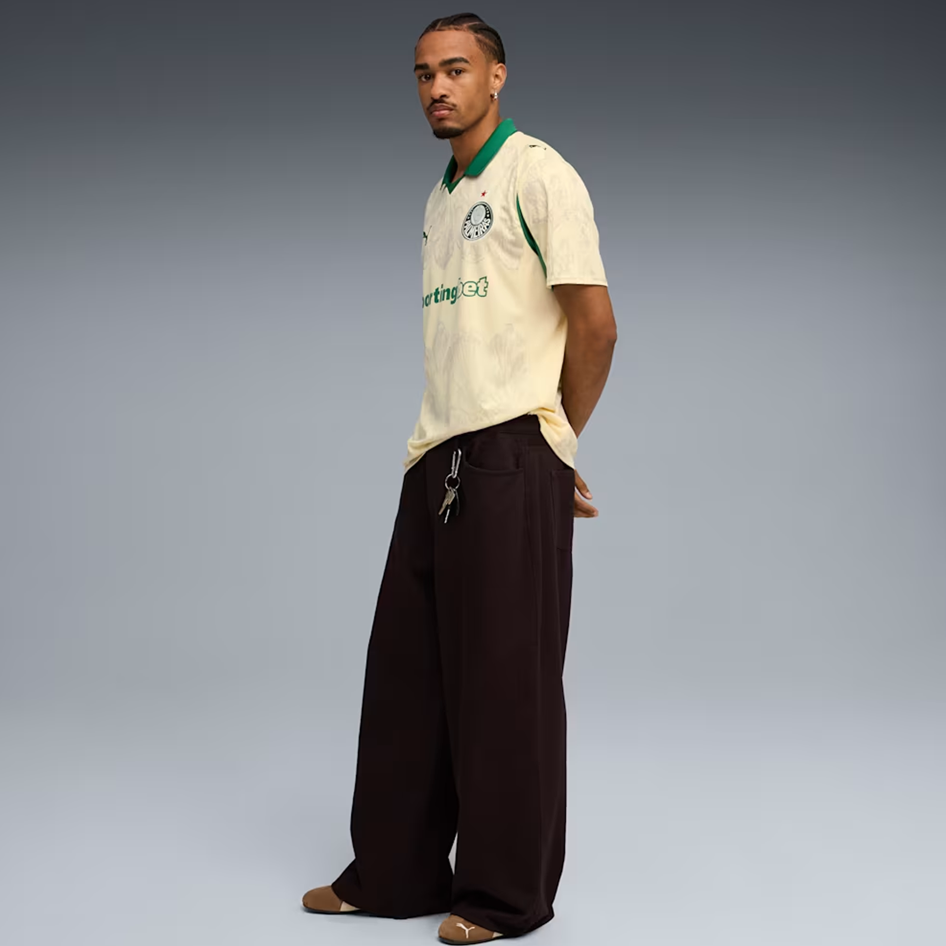 In 1914, a group of Italian immigrants founded a football team in São Paulo. Over a century later, Palmeiras continue to embody the vibrant fusion of Italian and Brazilian culture. With this kit, part of the PUMA x KIDSUPER collection, the Brooklyn designer honors the club’s legacy as the inaugural club world champions in 1951. The baroque-inspired Home Kit features a leaf motif against a golden base, a nod to the club’s Copa Rio triumph and timeless status.