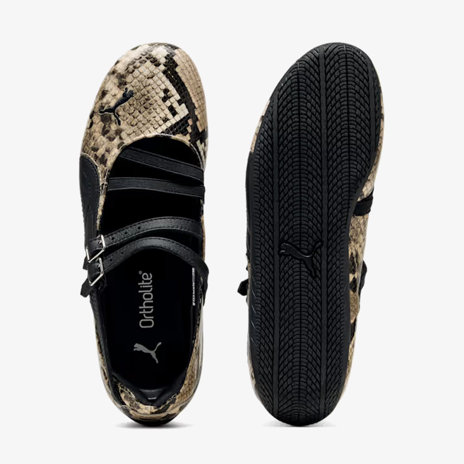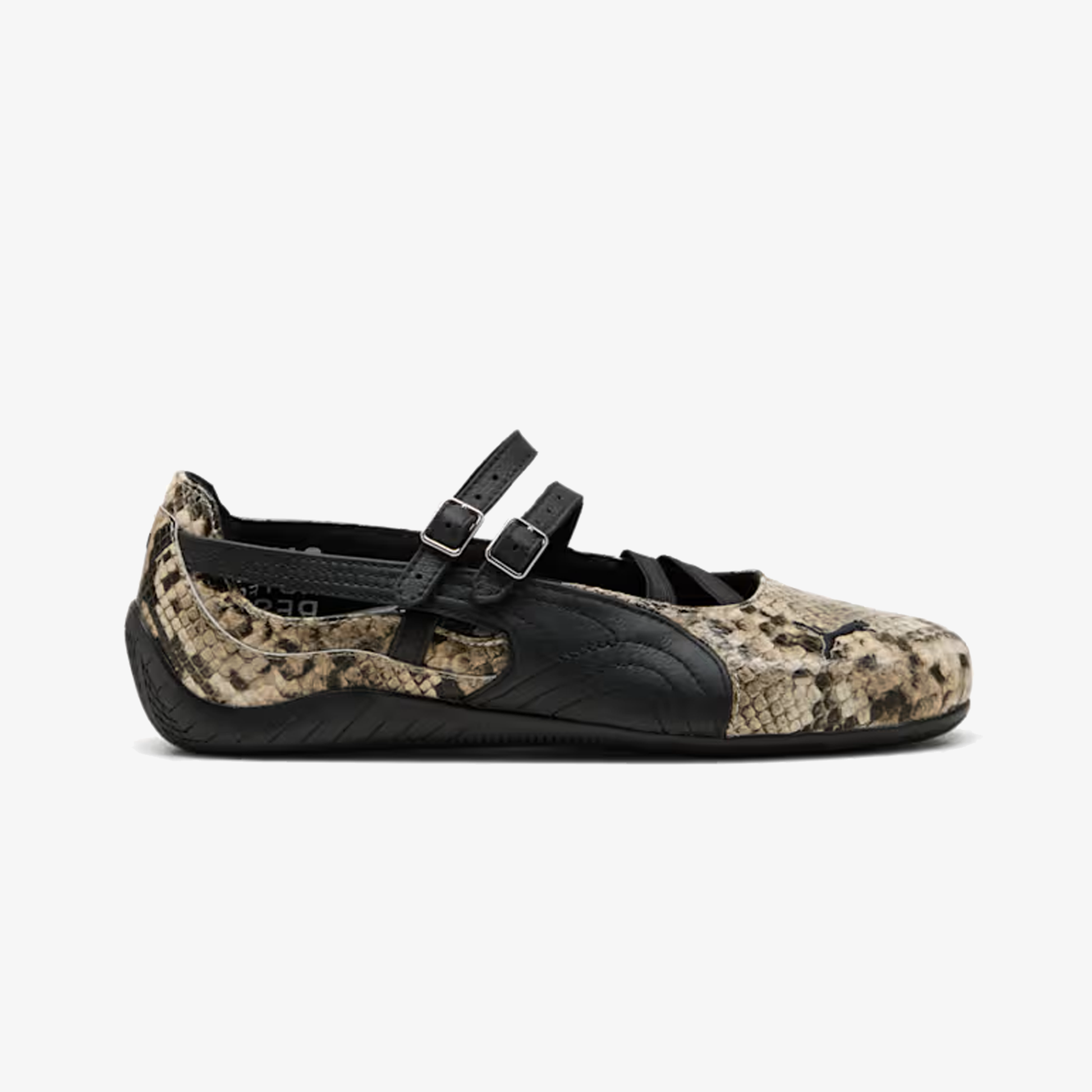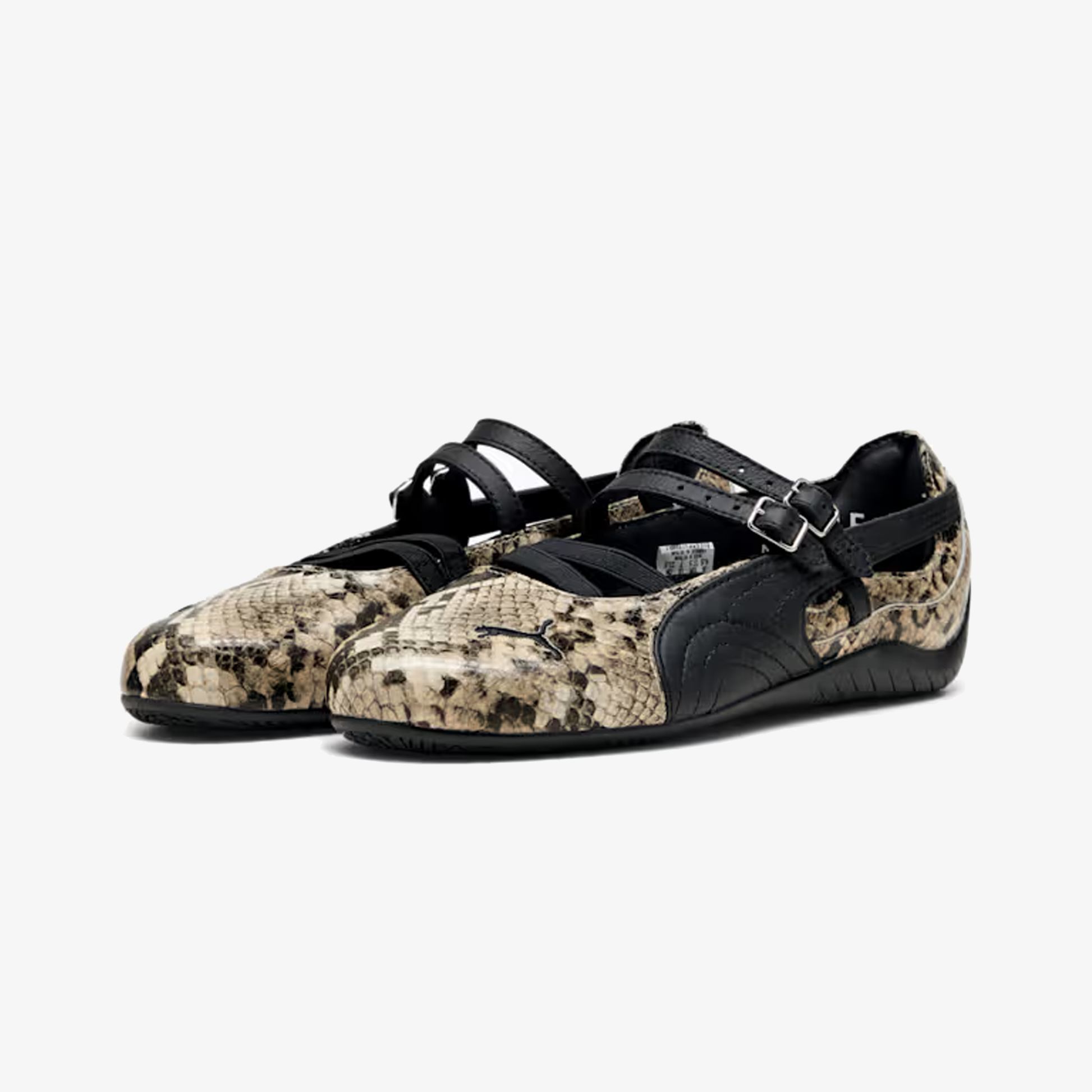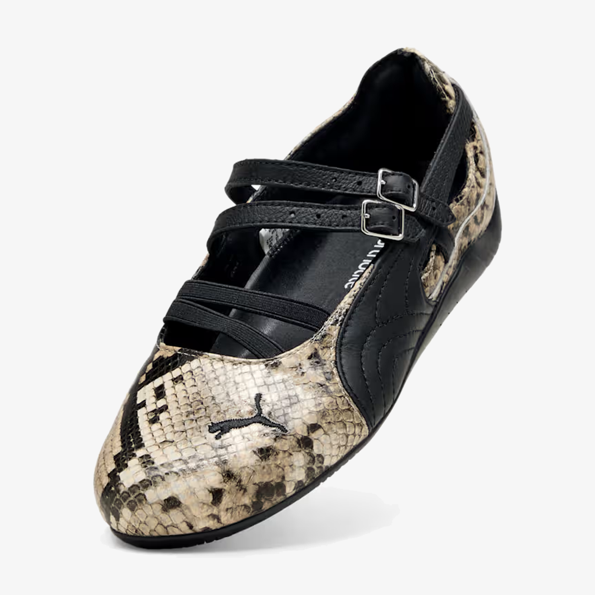 The PUMA Speedcat Ballet Snake redefines an icon, featuring a lustrous faux snakeskin leather upper offset by a black Formstrip that nods to PUMA’s heritage design language. The look is grounded by a matching black outsole, creating a seamless interplay of texture and tone. The silhouette’s signature streamlined profile remains intact, now enhanced with sleek double buckled hardware across the top for a secure fit and a touch of understated glamour.