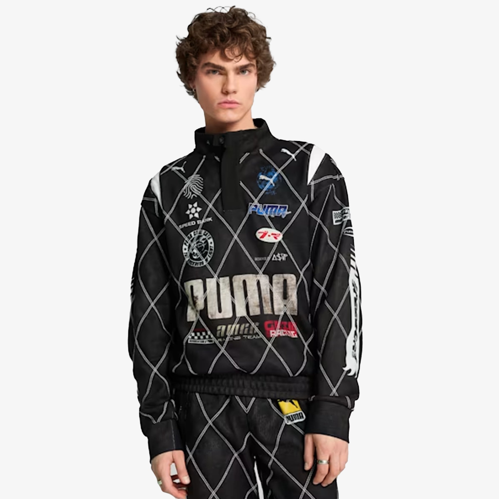 Motorsport and streetwear come together in this A$AP ROCKY x PUMA sweatshirt. With a slim fit to mimic the fit of a racing suit, this sweatshirt features quilted diamond stitching, custom PUMA graphics, and a quarter zip closure at the neck.