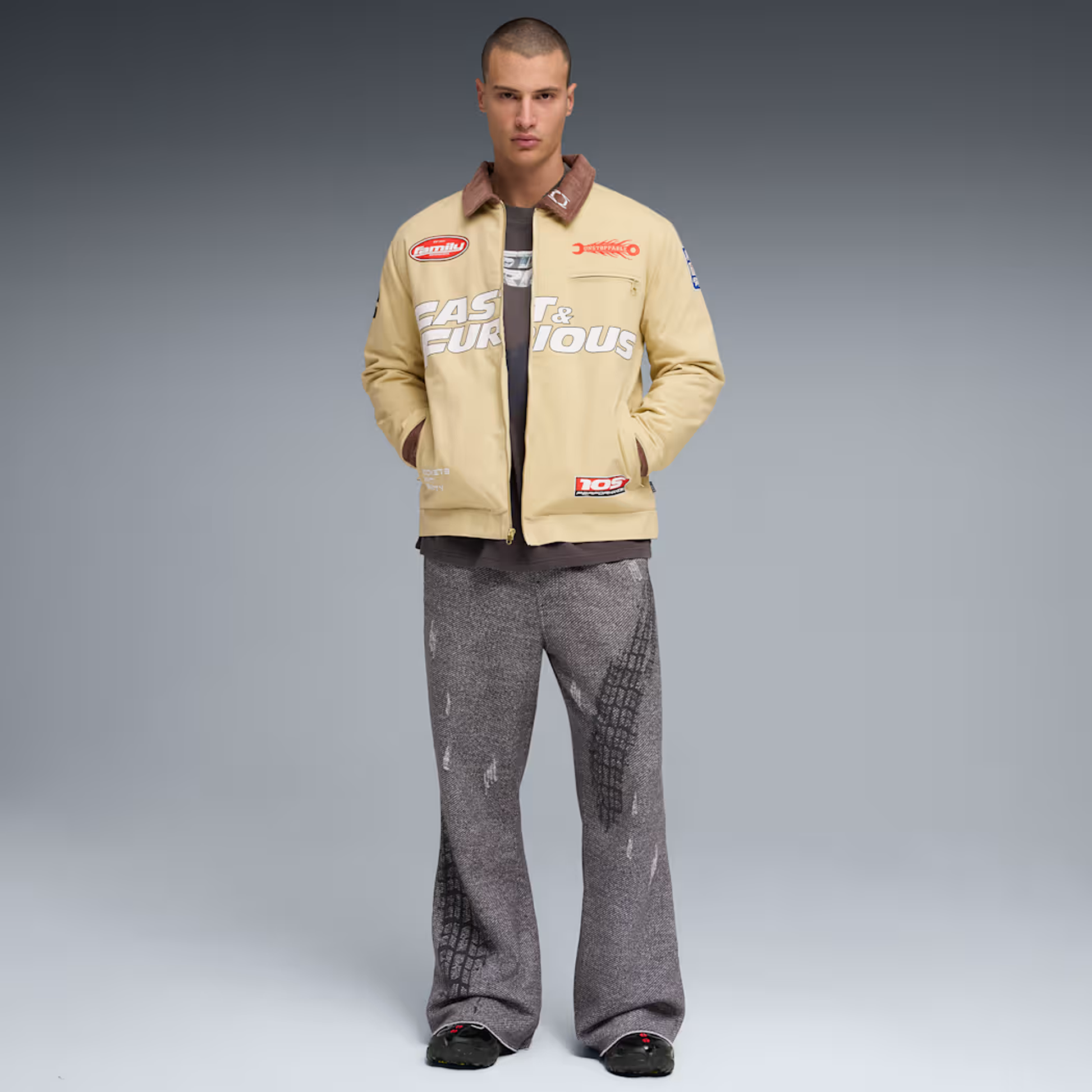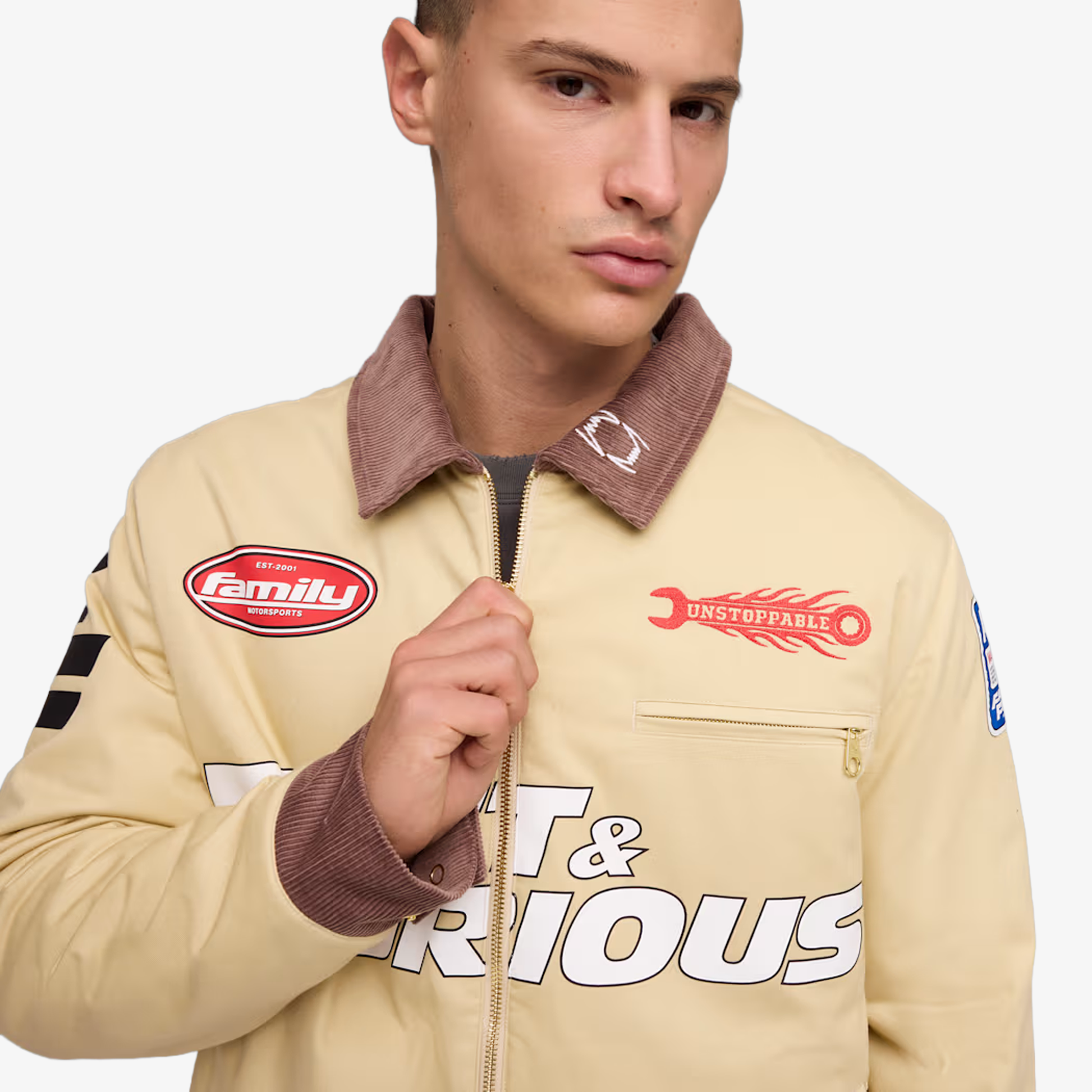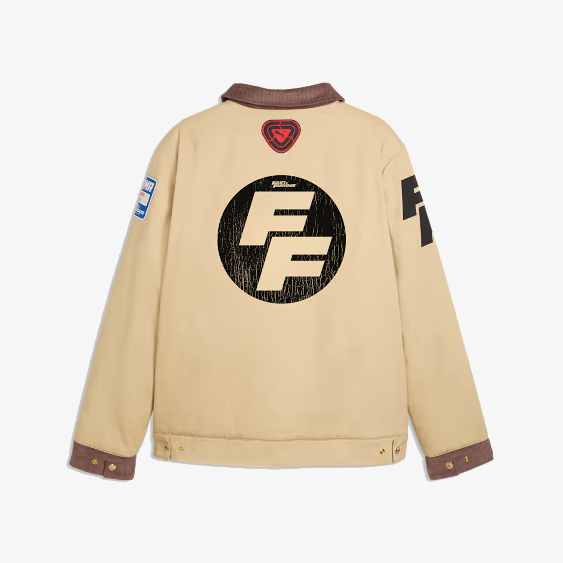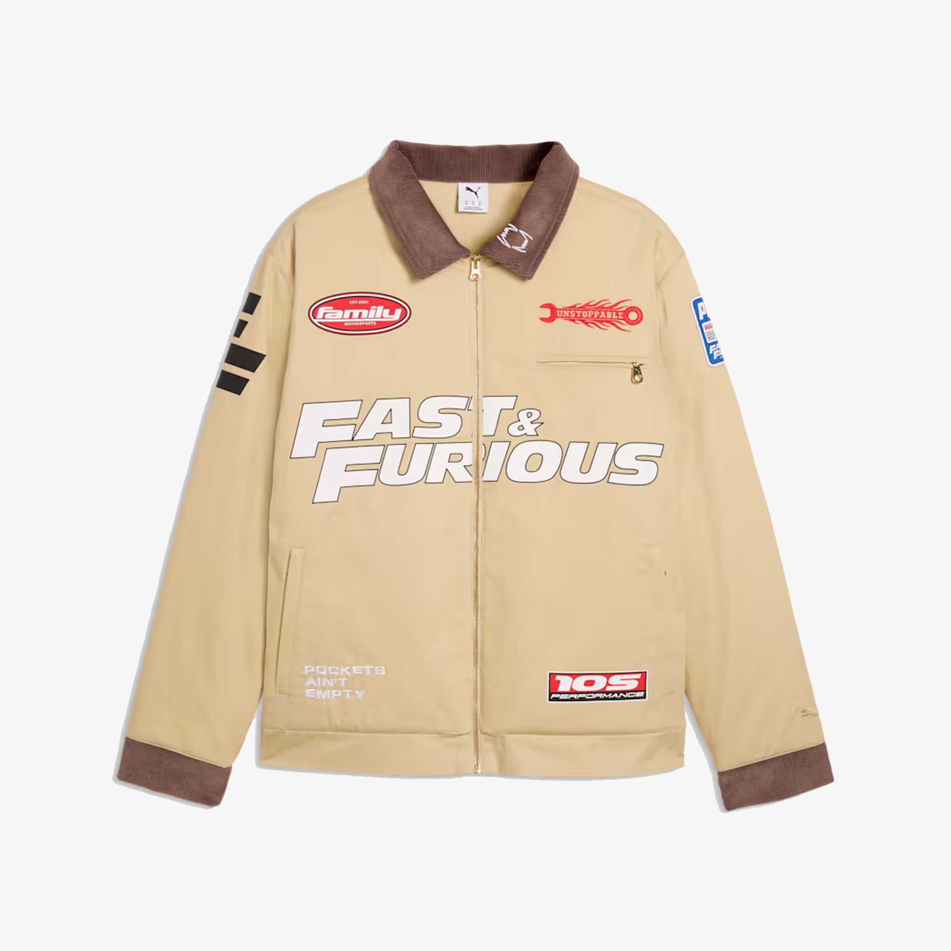 PUMA teams up with Fast & Furious for a collection that's all gas, no brakes. Blending the bold energy of the franchise with Melo's unmistakable game and personal style, this collection is flashy, fun, and firing on all cylinders. A spin on utilitarian style, this workwear jacket comes with logos impossible to miss.