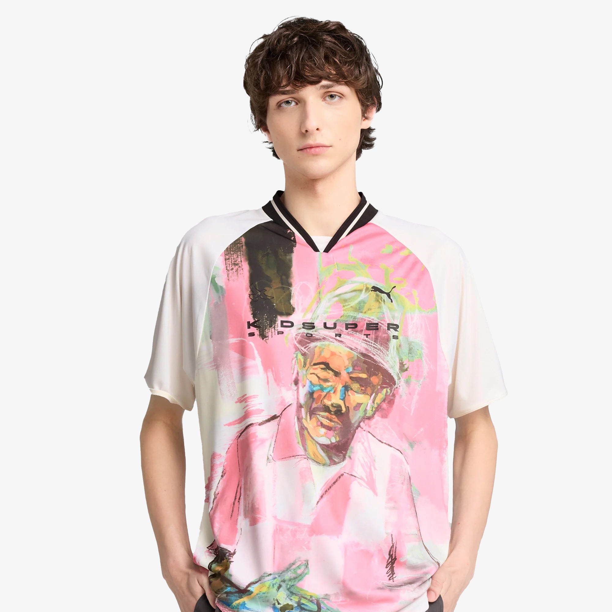 The latest PUMA x KIDSUPER collection is here. This season’s designs capture Colm Dillane’s playful and eclectic spirit, with graphics inspired by his handwriting and vibrant, distinctive artwork. Pulling inspiration from the football world, pieces include a new take on the King Indoor sneaker, as well as football jerseys, shorts, and trousers. Part of the collection, this jersey features a graphic print on the front and back and an oversized fit.