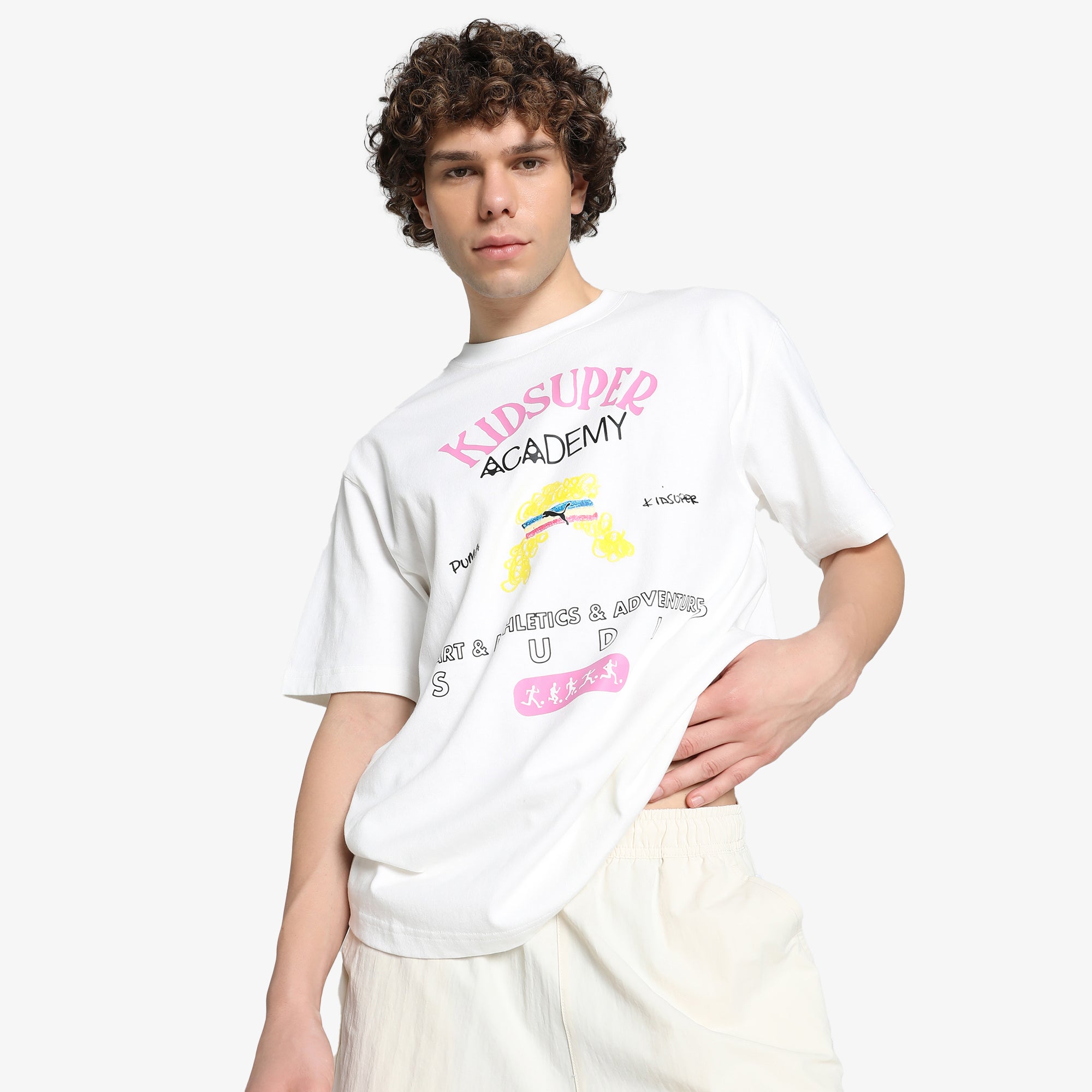 KidSuper founder Colm Dillane is an ex-professional footballer, designer, and artist. The brand is known for their wildly inventive runway shows and even more inventive looks. The PUMA x KIDSUPER collaboration reinterprets PUMA classics through the lens of KidSuper – with pastel colours, dynamic lines, and bold prints featuring his art.