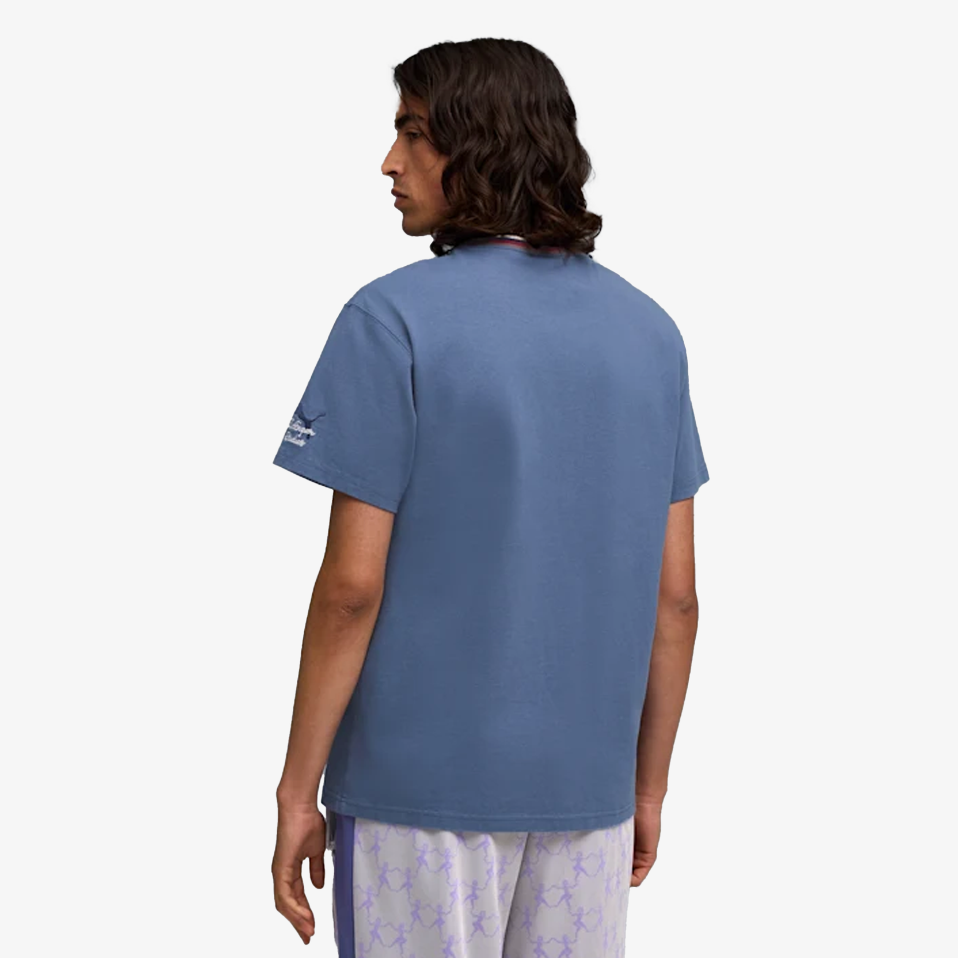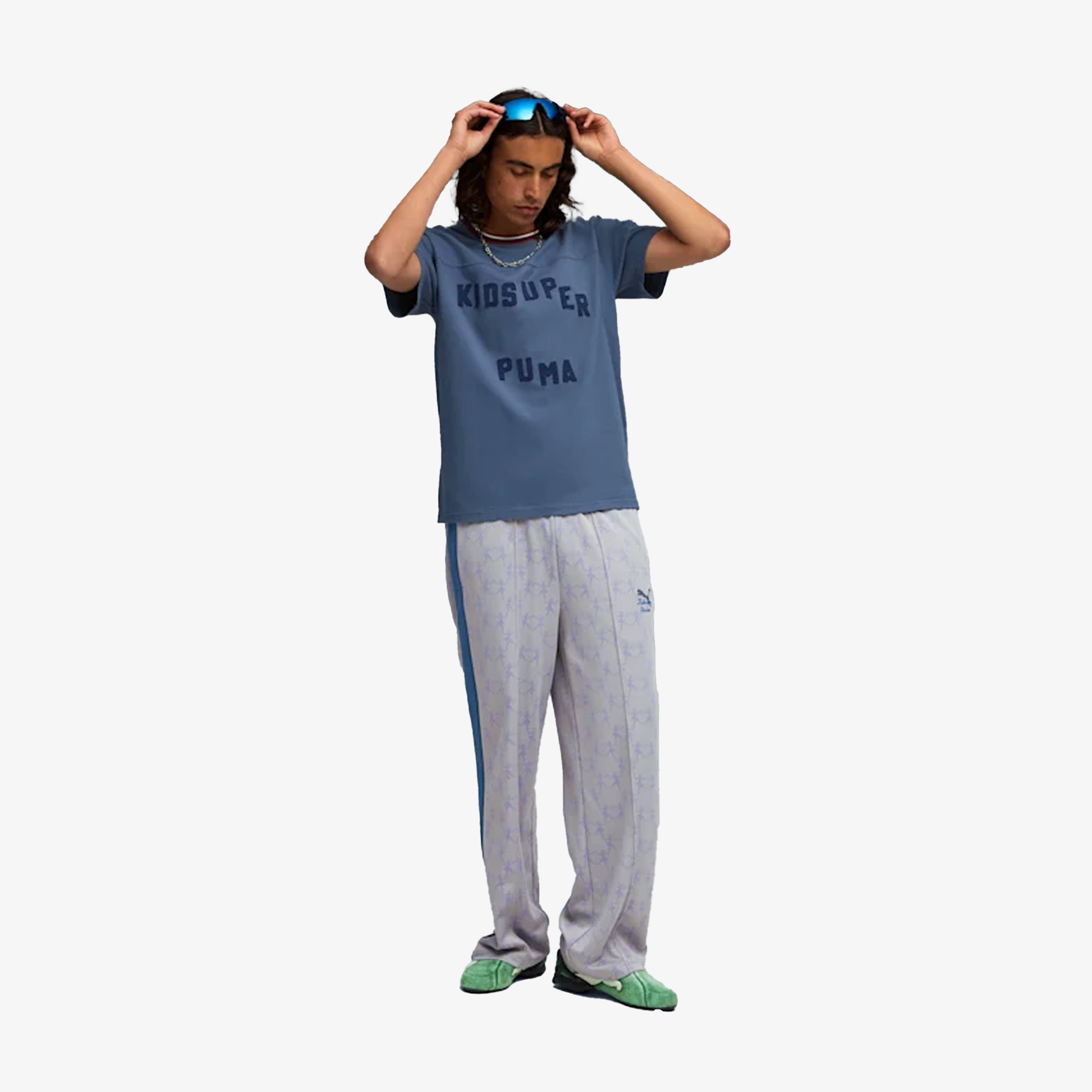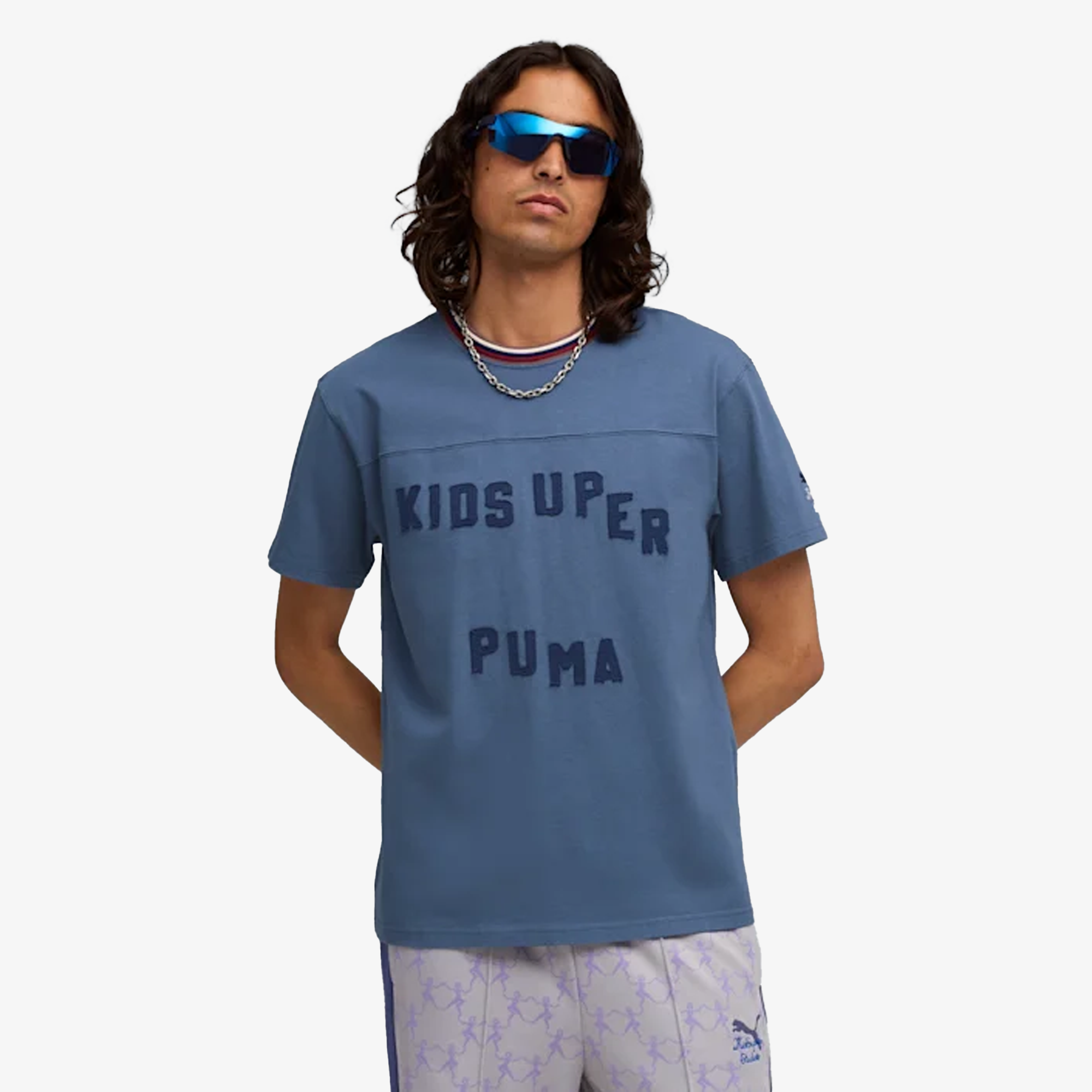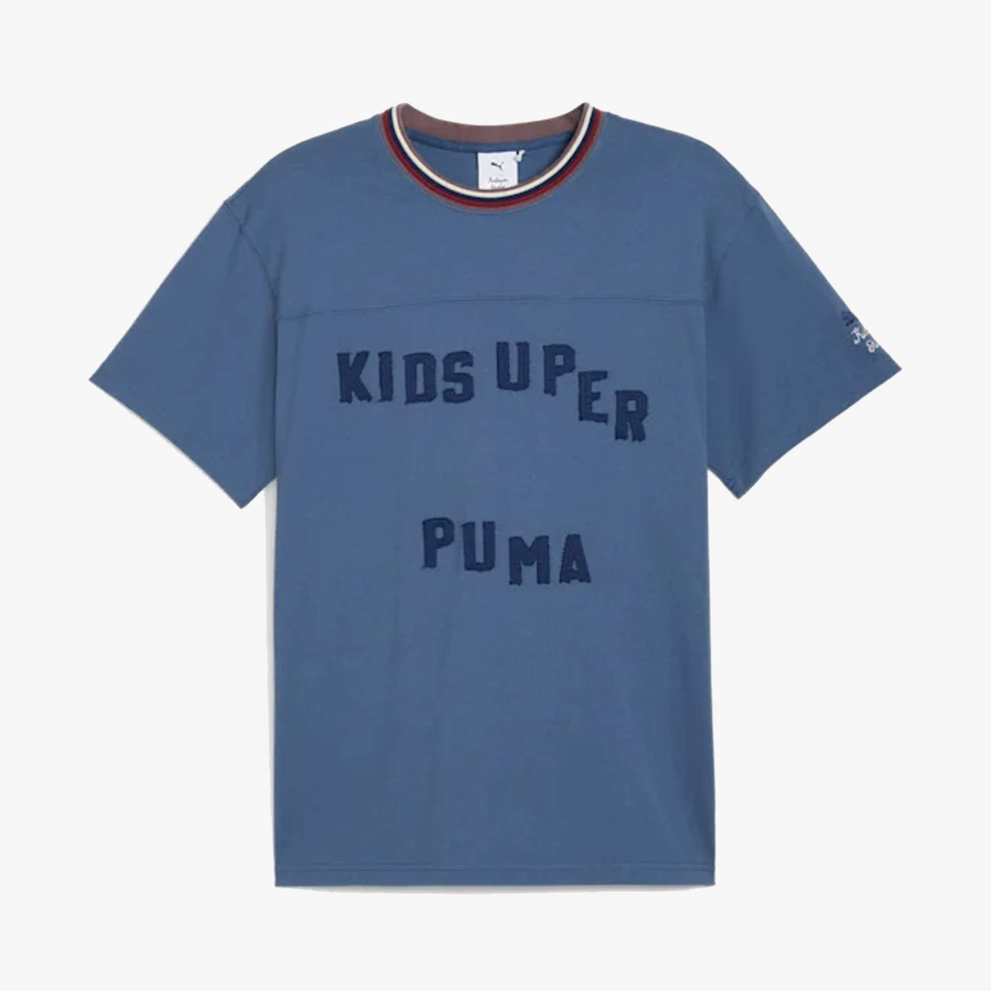 This season's PUMA x KIDSUPER collab can be found at the intersection of art and sport. This collection is an eclectic blend of retro-sporting silhouettes and modern art graphics. Look out for vintage goalie jerseys, a puffer jacket with fine stitching, and jerseys adorned with water-colour prints.