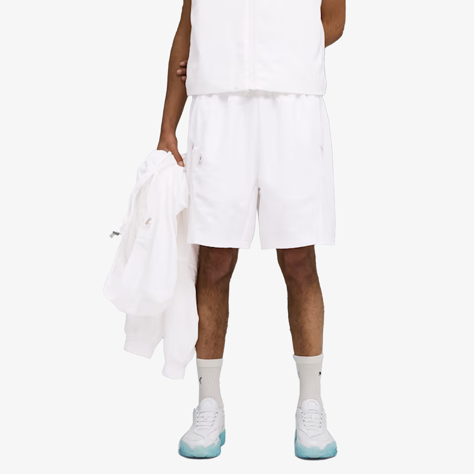 PUMA x SKEPTA goes ice white. This flooded white collection is inspired by Skepta’s iconic aesthetic. Two re-designed Skopes with iced out soles are paired with a suite of elevated streetwear essentials: a jacket and short tracksuit, a vest and a cap. Skepta’s signature style meets PUMA’s design precision and streetwear edge.