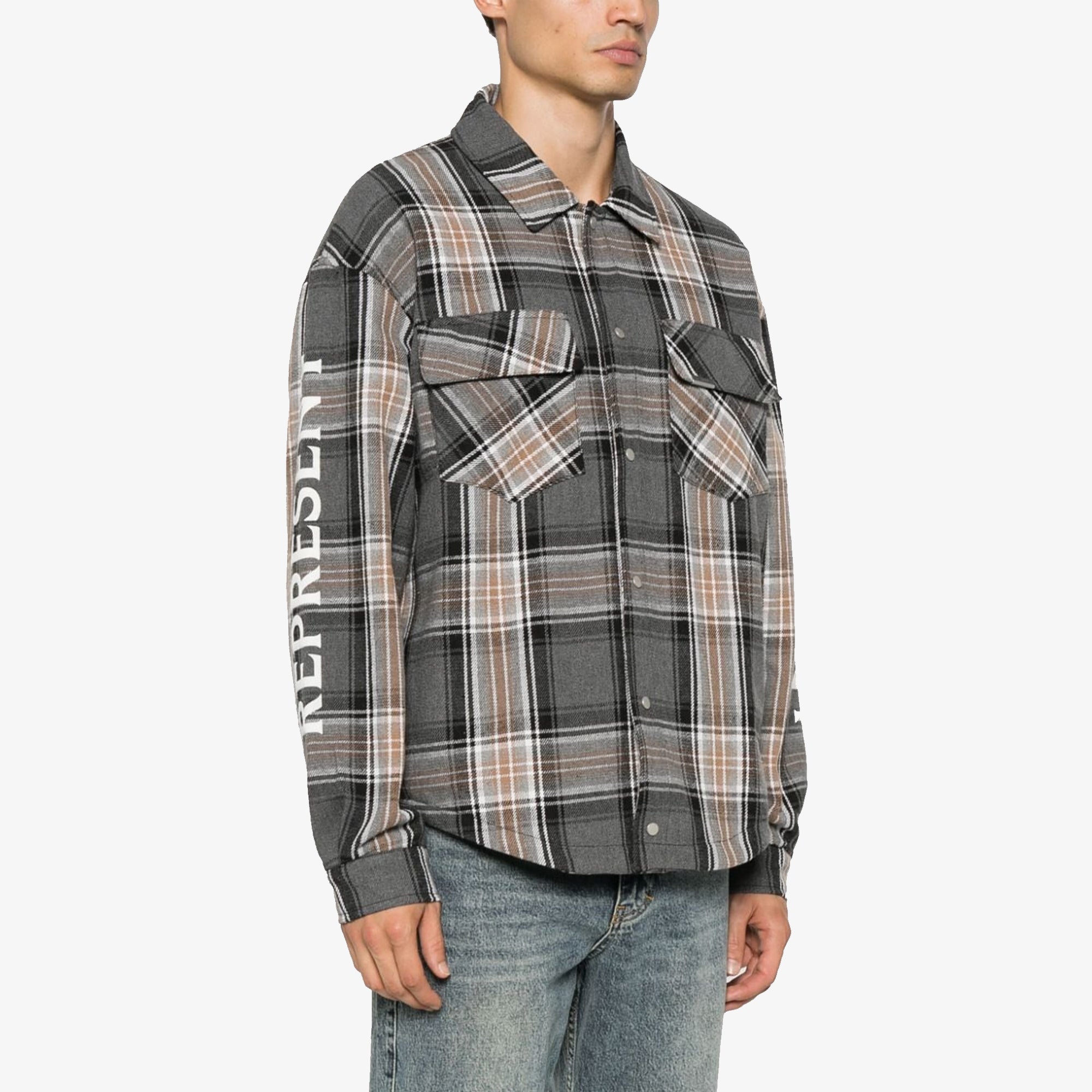 Cotton Shirt by Represent, classic collar, snap button front closure, two flap patch pockets on the front, multicolored tartan pattern, padded inner lining, iconic brand monogram printed in contrast on sleeves, regular fit.