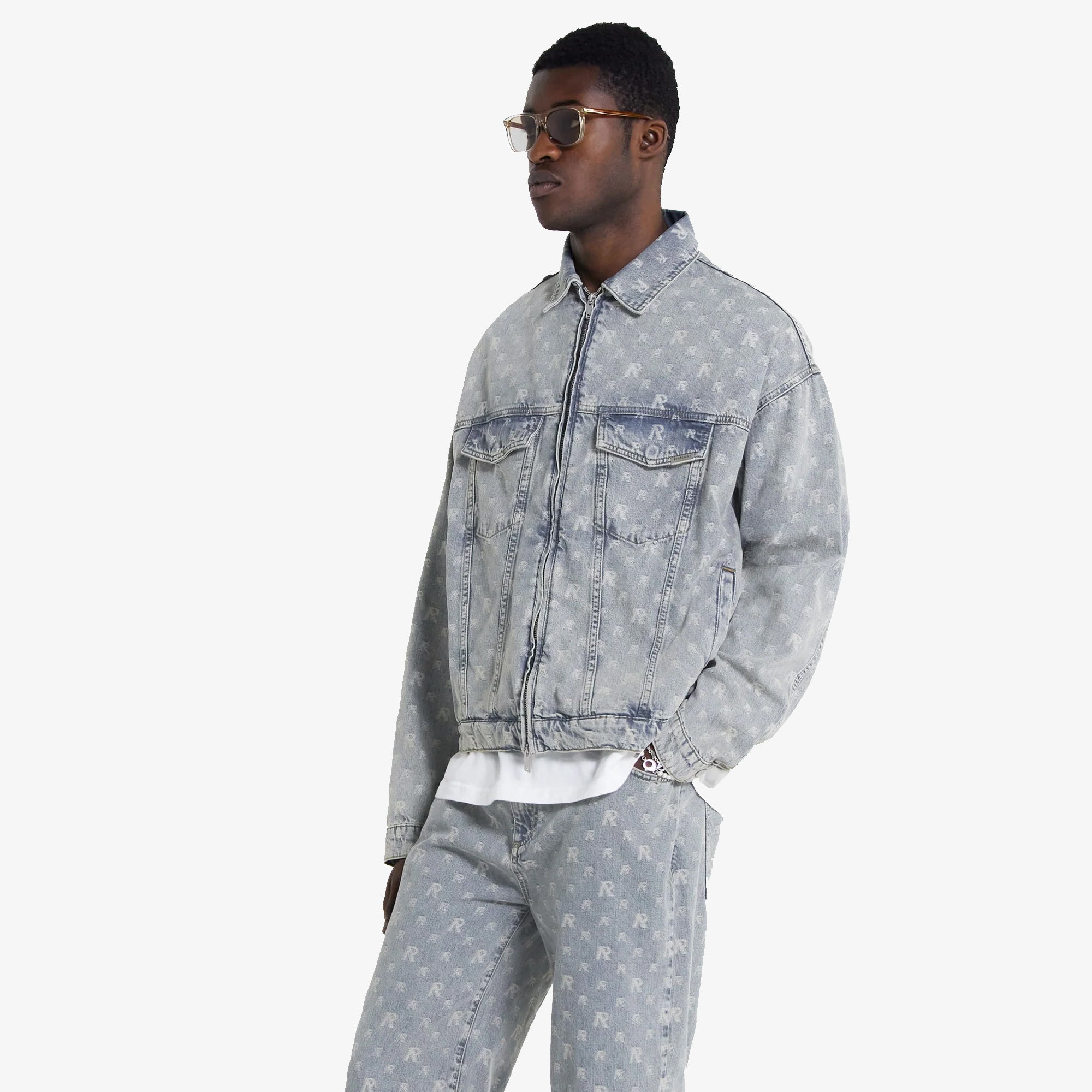 Introducing the R4 Monogram Denim Jacket in Stone Wash, a slightly oversized silhouette built to partner with our Initial Monogram Jeans. The heavy wash denim has a jacquard Initial monogram crafted into the fabric design. The jacket has a kissing welt to the double zip closure, a panelled front and v detailed yoke to the back. It has cobrax popper adjusters to the side and is finished with a Represent metal bar to the chest pocket.