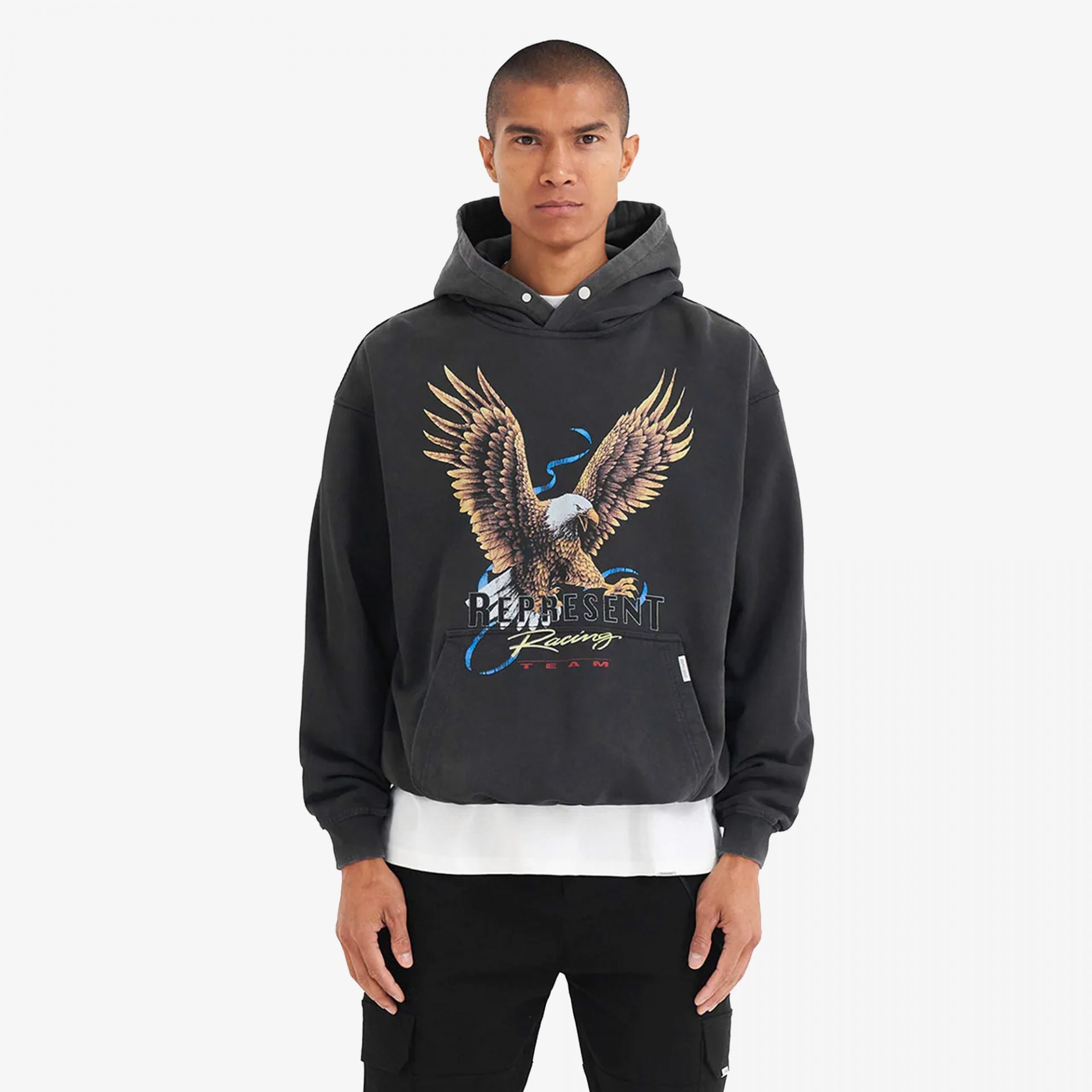 Represent's hoodie in black cotton jersey with Racing Team Eagle print at chest. Featuring kangaroo pocket, long sleeves, ribbed finish and straight hem.