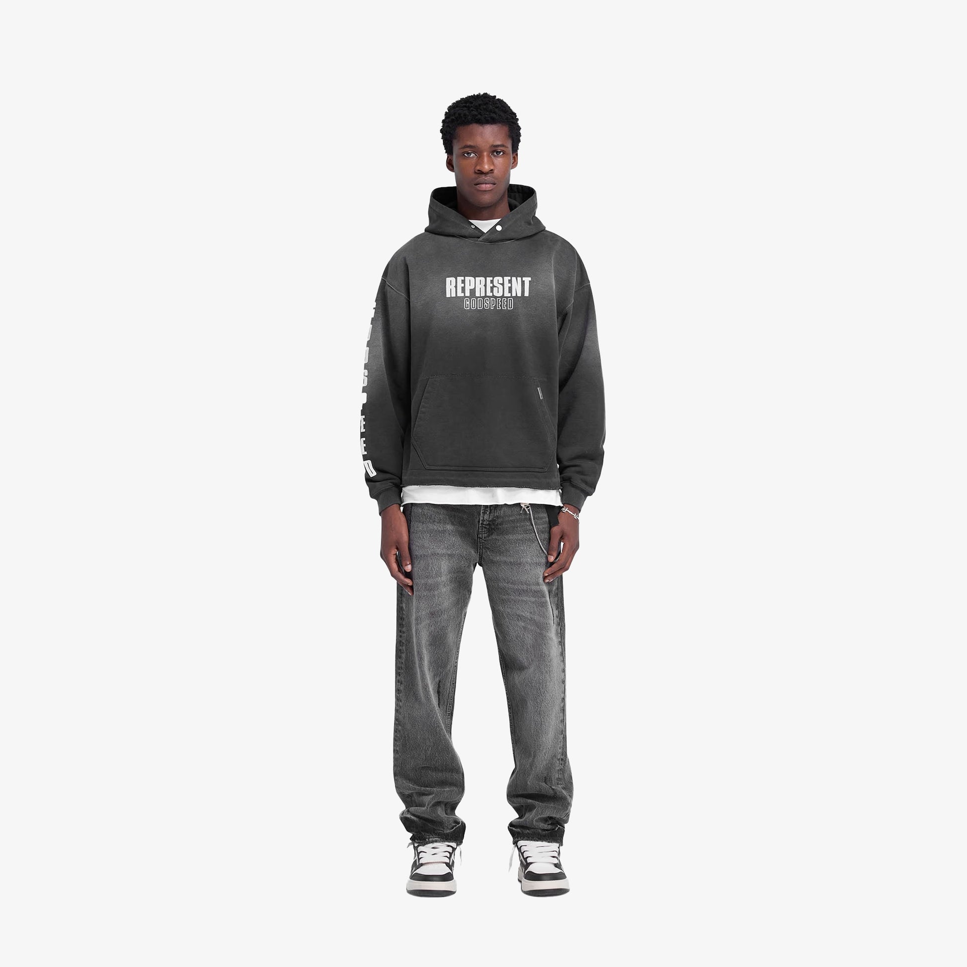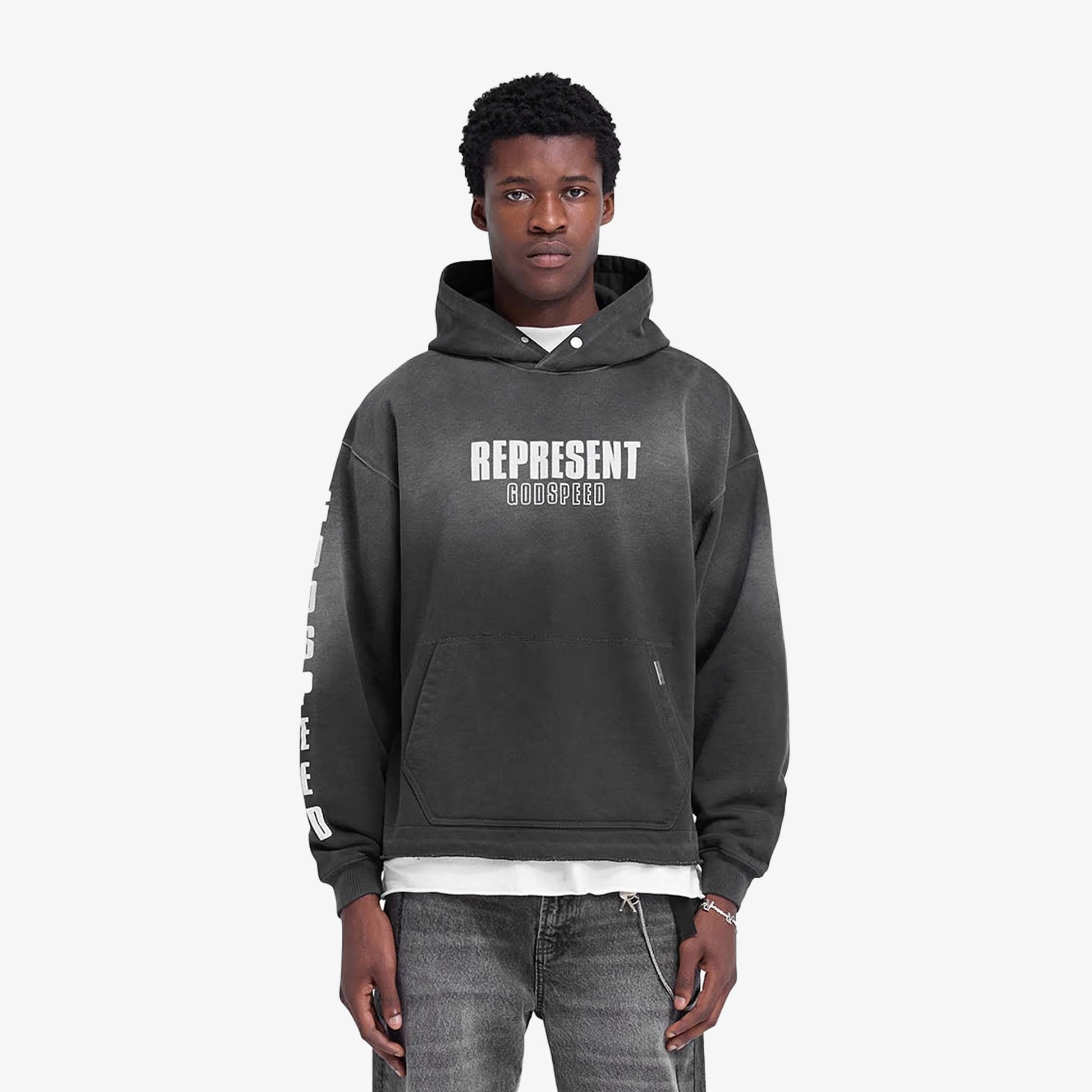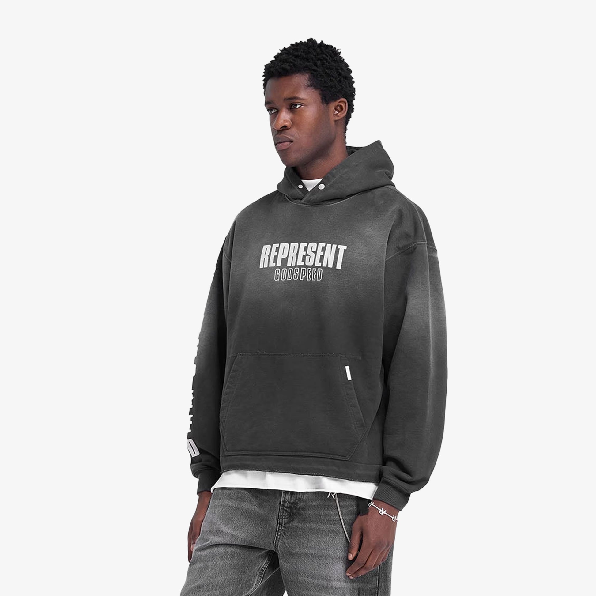 Introducing the Godspeed Hoodie in Aged Black, a luxury oversized hoodie with a fade out wash for a worn look. The hoodie has an open stepped hem with raw edge, ribbed cuffs and a cobrax popper to the hood. It features a cracked print graphic to the front, back and sleeve.