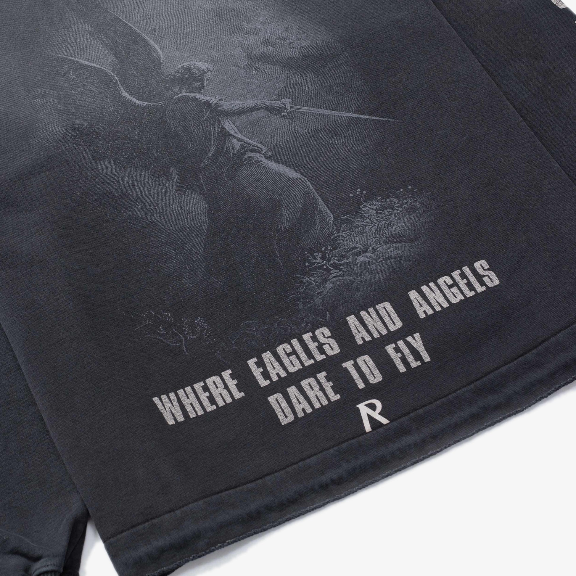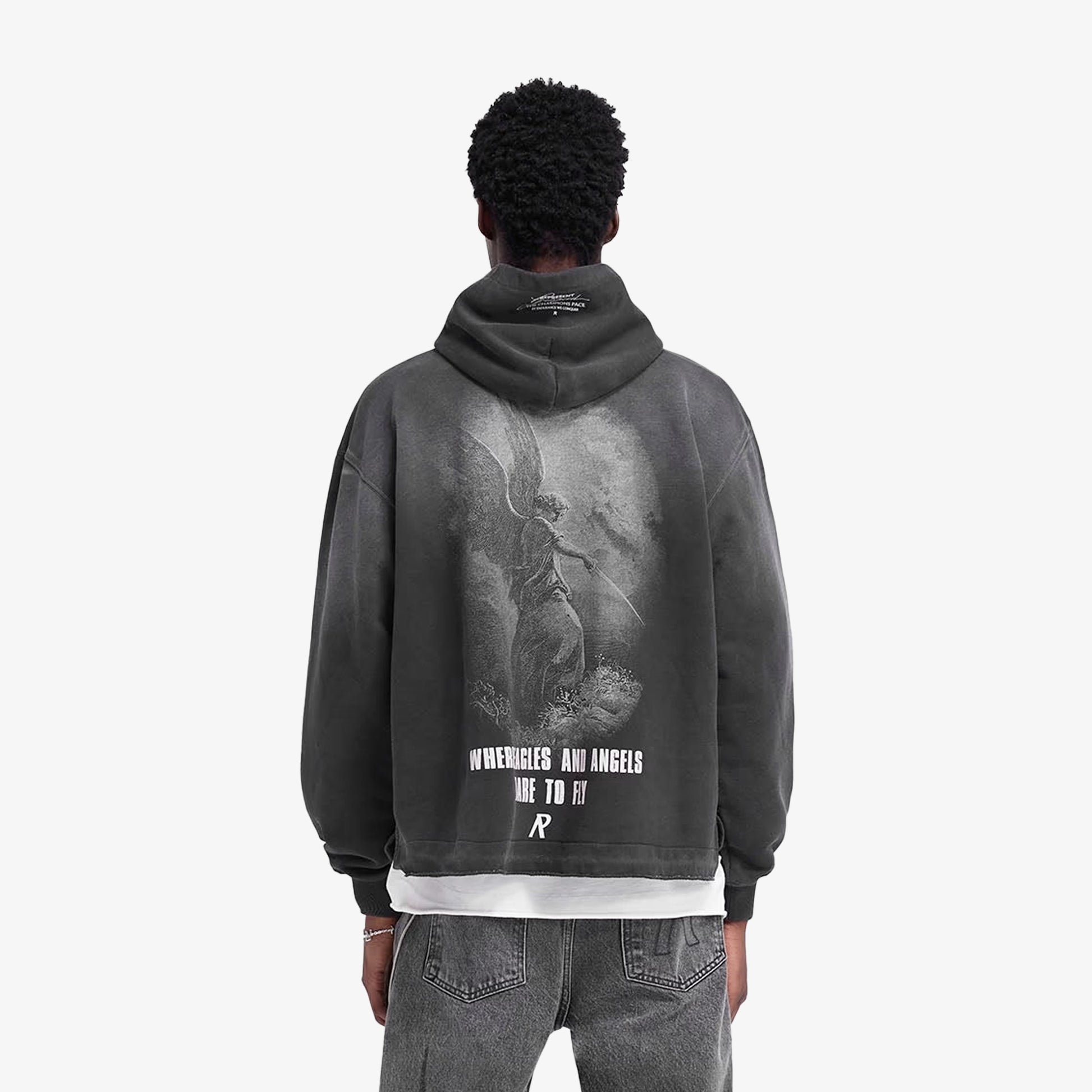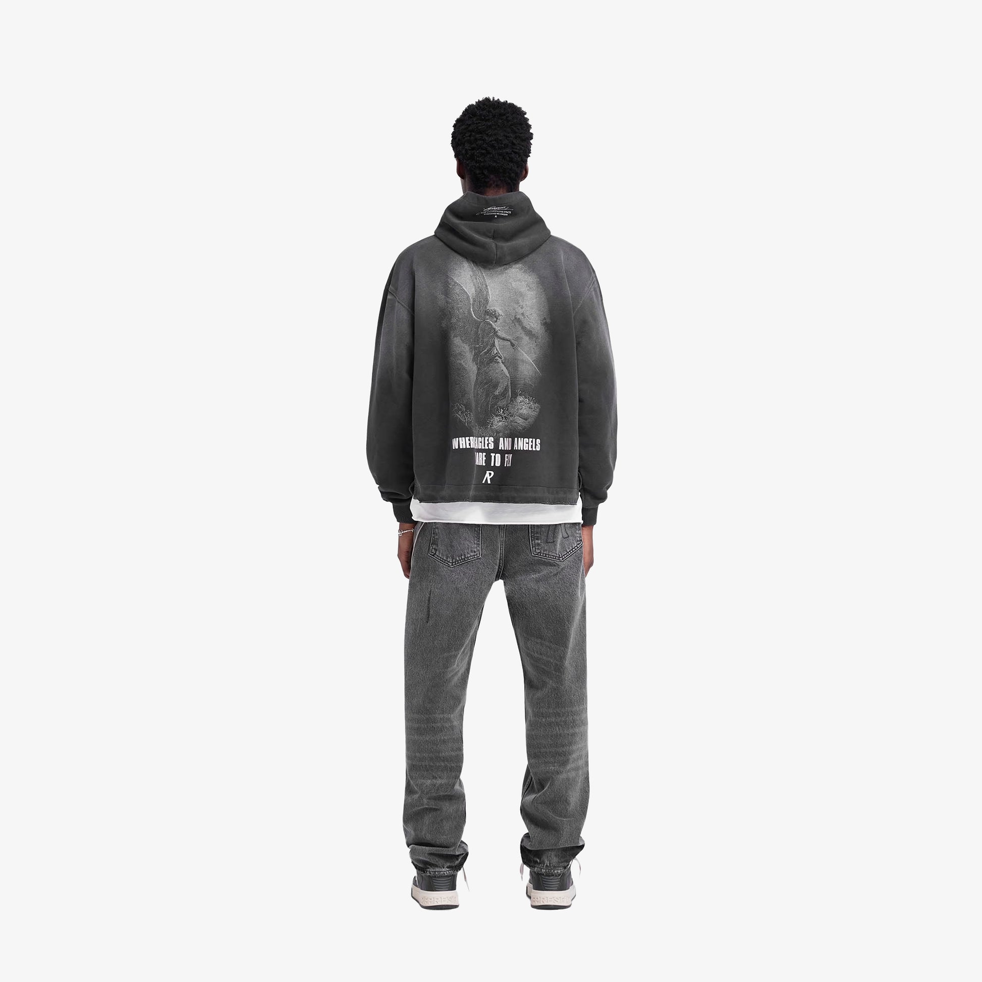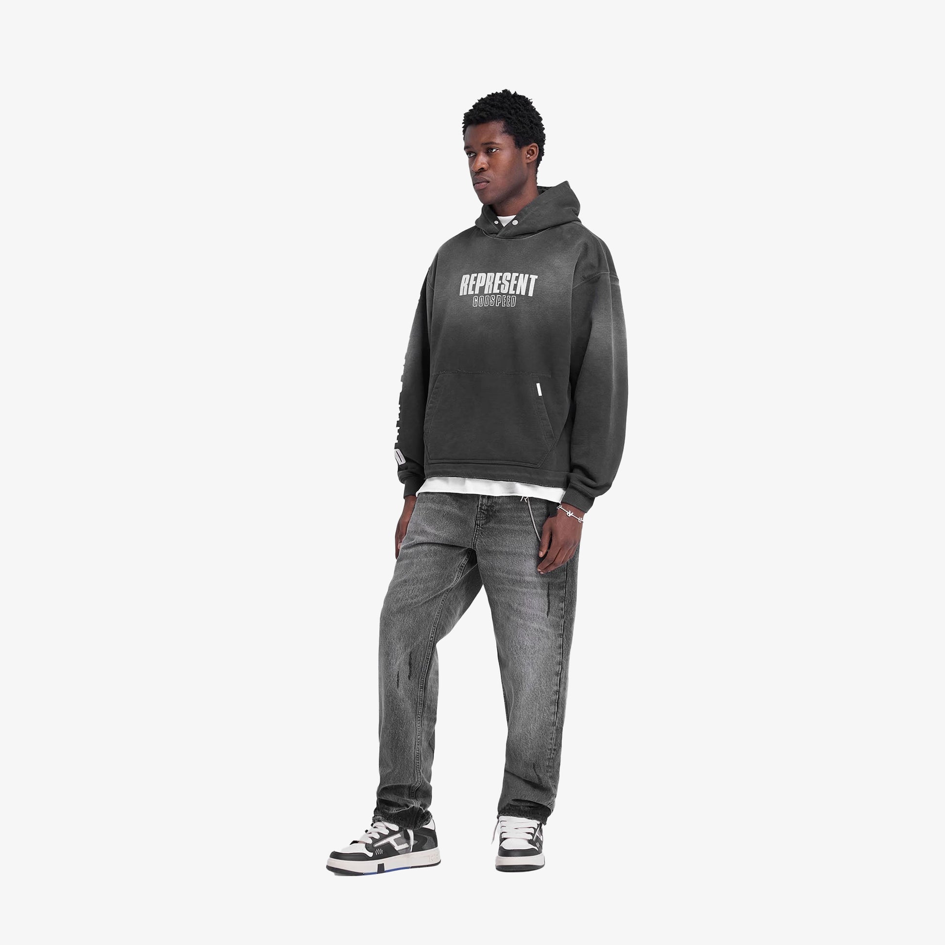Introducing the Godspeed Hoodie in Aged Black, a luxury oversized hoodie with a fade out wash for a worn look. The hoodie has an open stepped hem with raw edge, ribbed cuffs and a cobrax popper to the hood. It features a cracked print graphic to the front, back and sleeve.