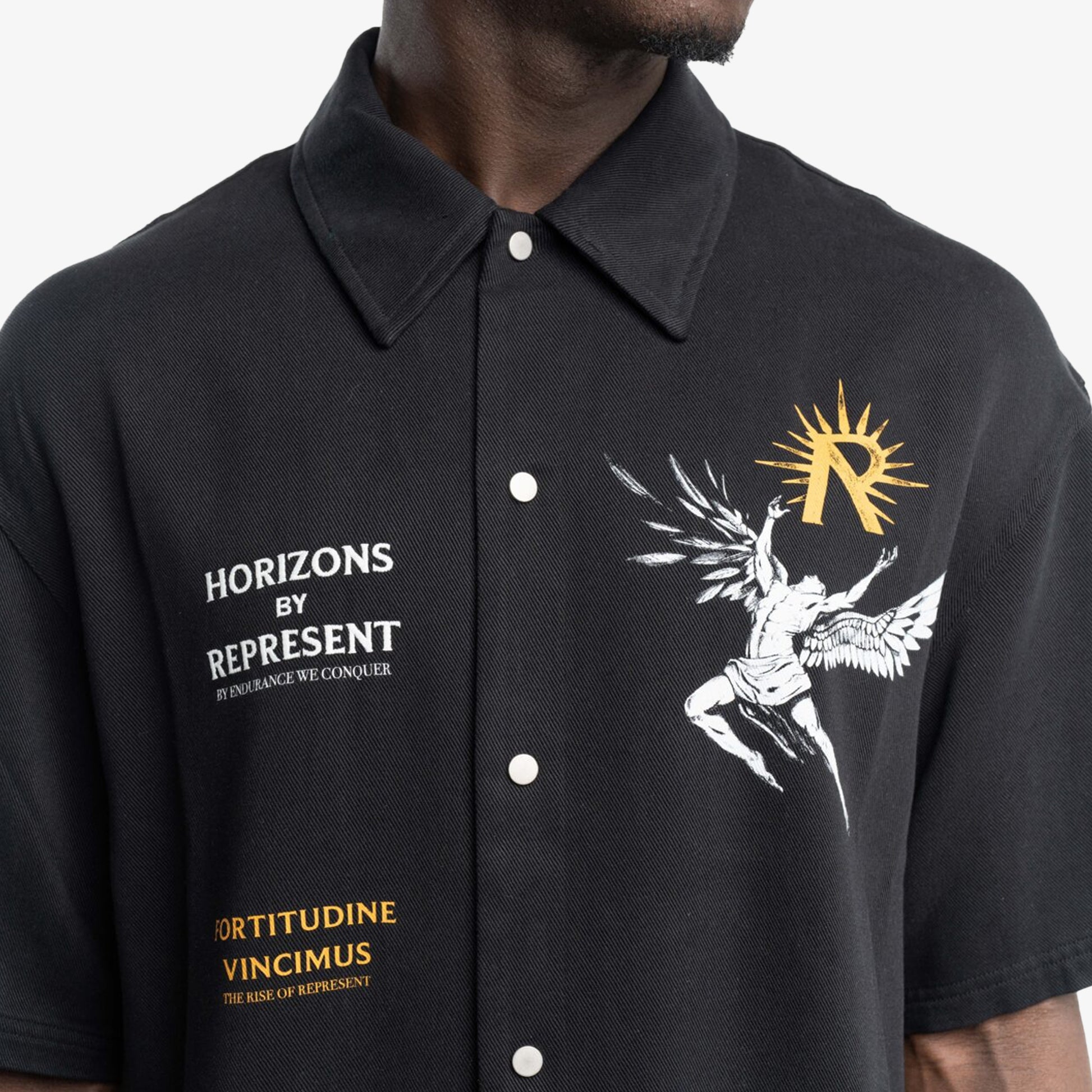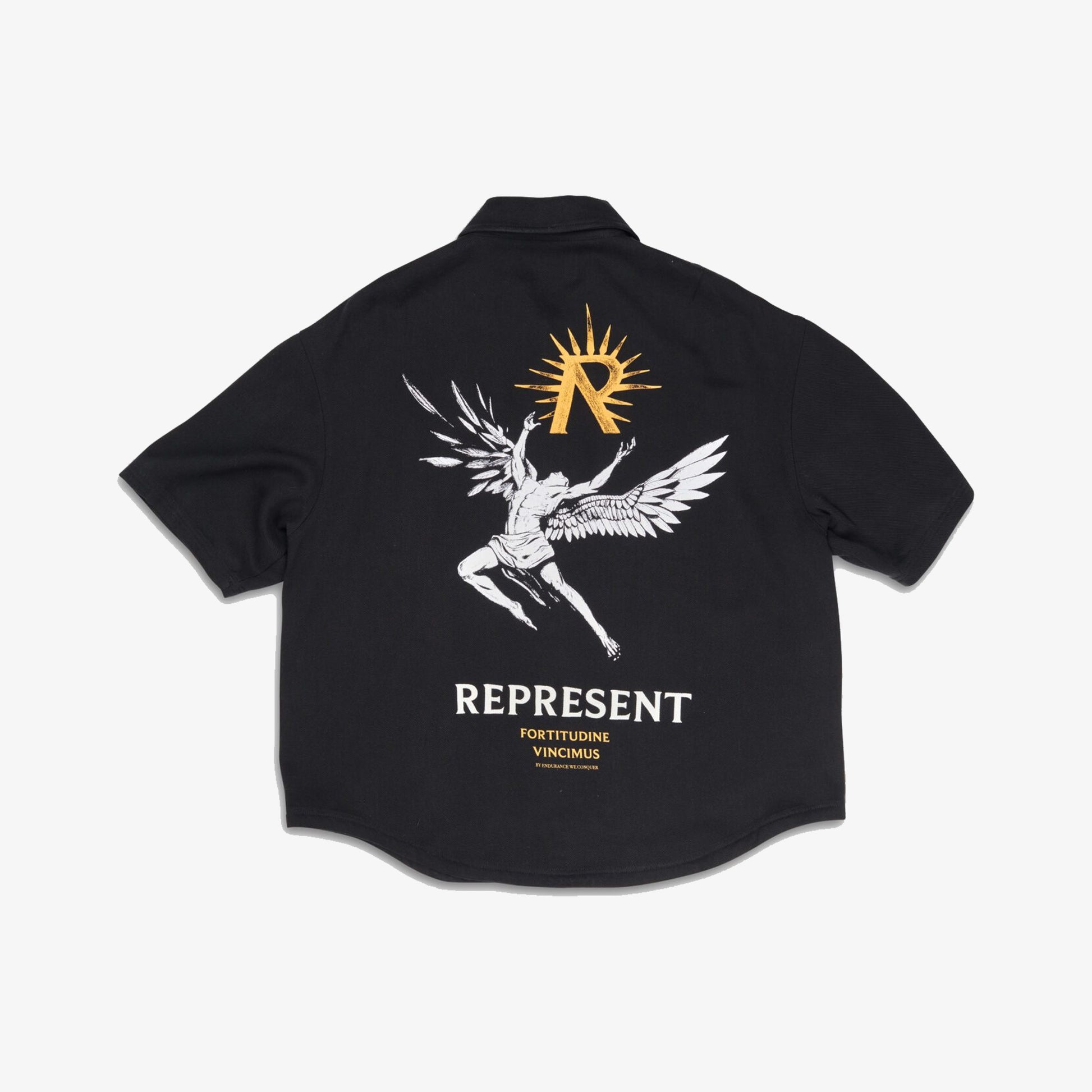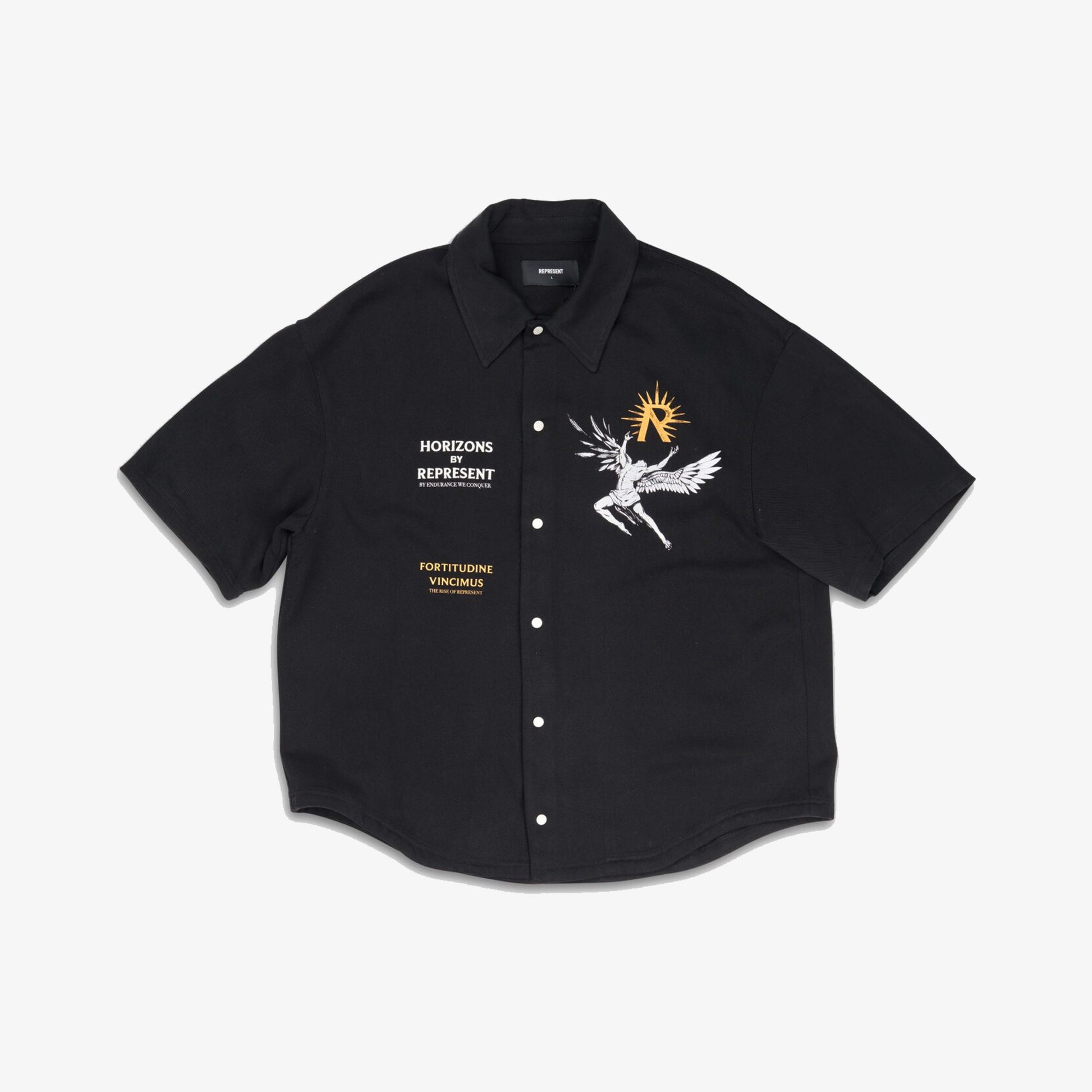 Introducing the Icarus Short Sleeve Shirt in Black, a luxury shirt crafted from a drapey twill weave fabric. The shirt features our screen printed Icarus artwork to the back and chest, with the addition of our ‘Fortitudine Vincimus’ motif. It also displays the collection’s namesake ‘Horizons by Represent’ embroidered to the front.