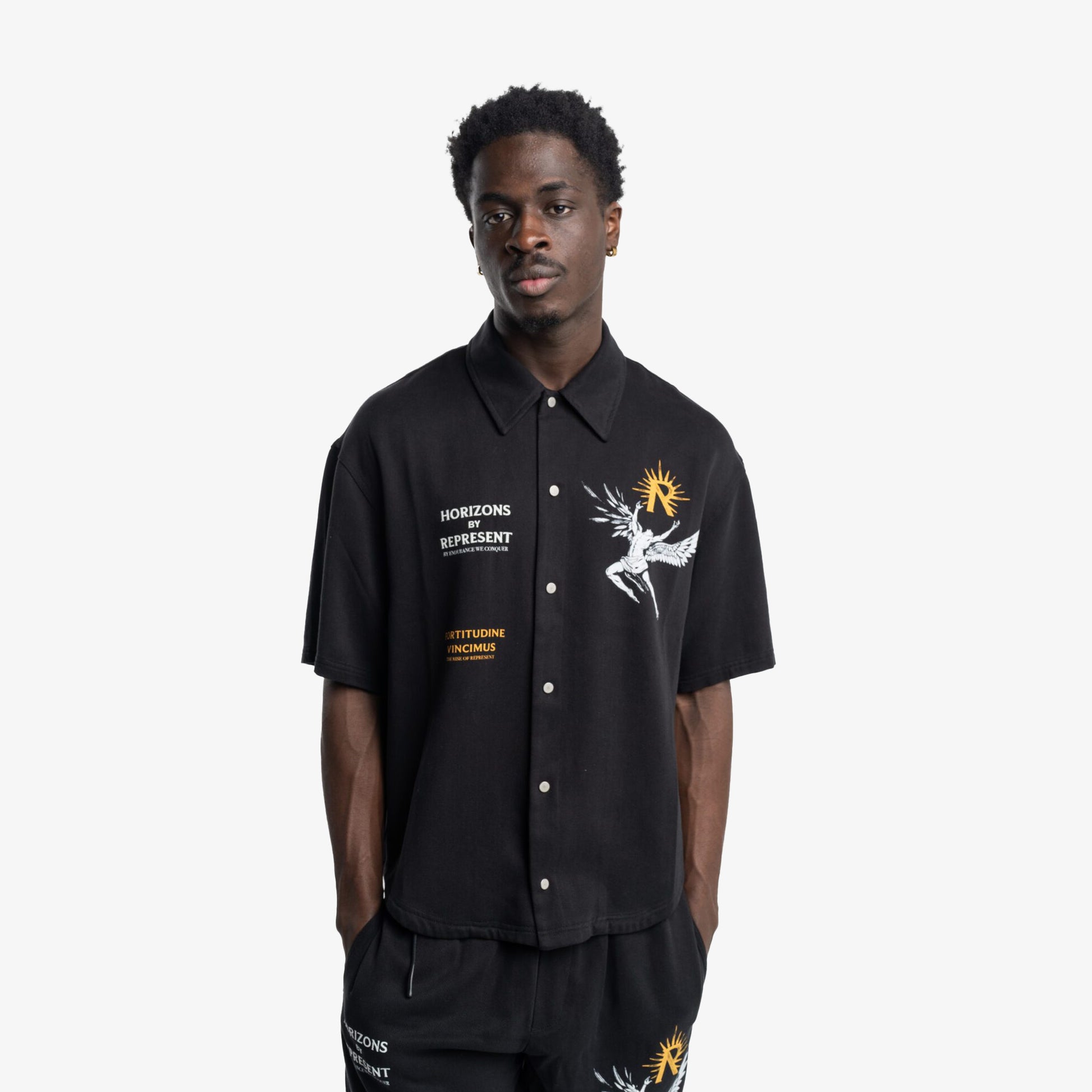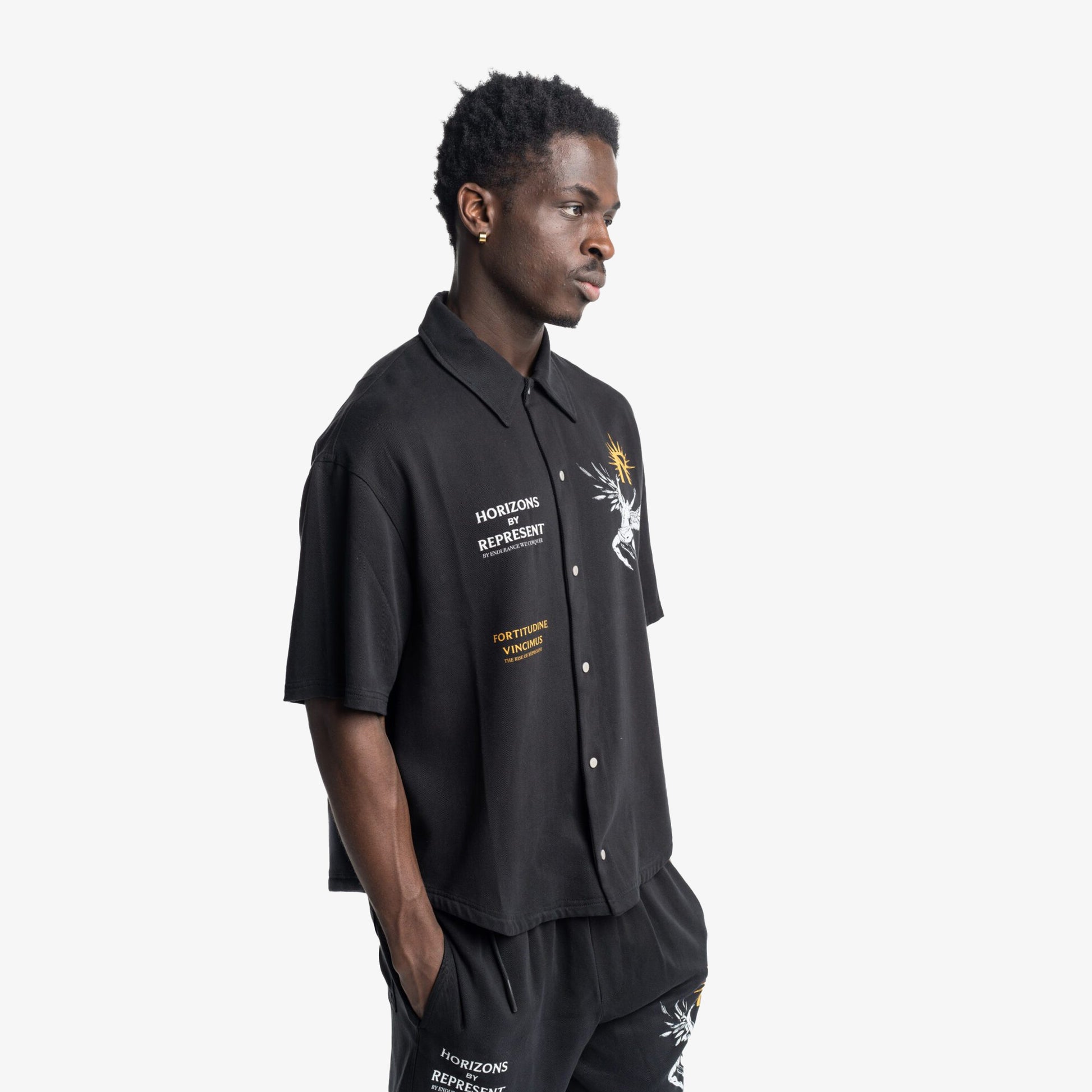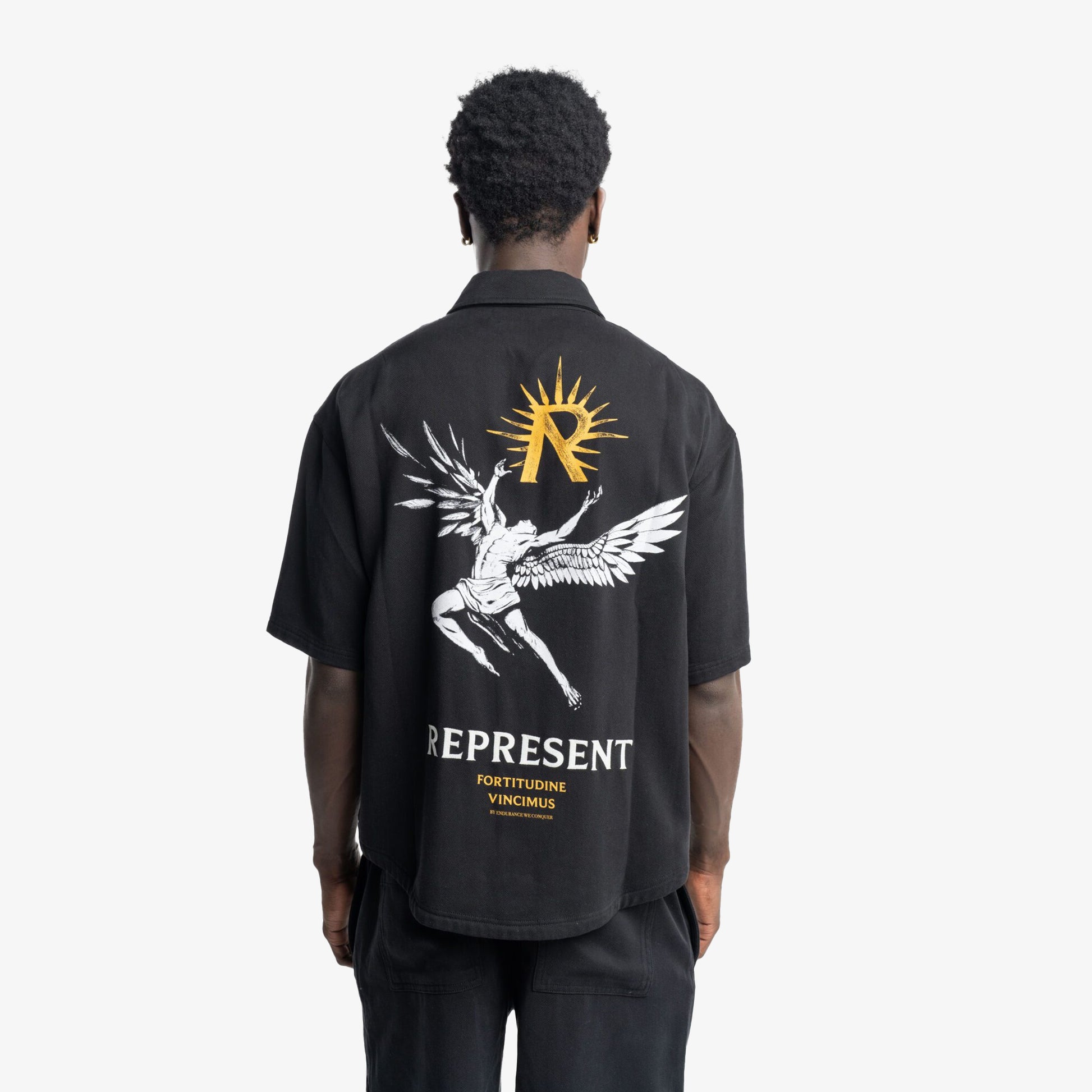Introducing the Icarus Short Sleeve Shirt in Black, a luxury shirt crafted from a drapey twill weave fabric. The shirt features our screen printed Icarus artwork to the back and chest, with the addition of our ‘Fortitudine Vincimus’ motif. It also displays the collection’s namesake ‘Horizons by Represent’ embroidered to the front.