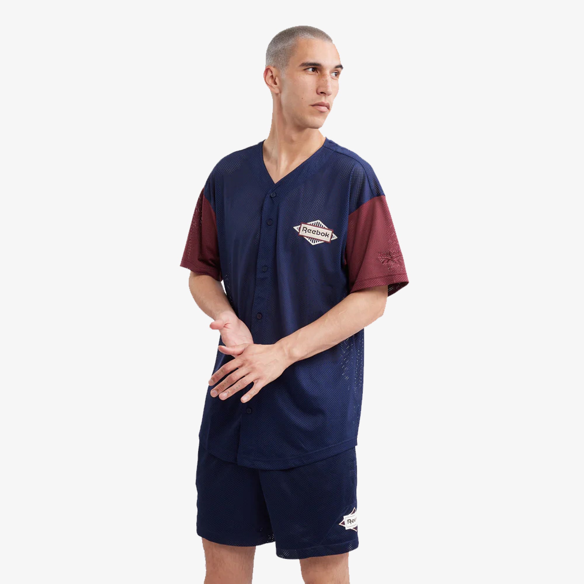 Taking its cues from vintage baseball jerseys, this colorblock top is cut from recycled materials to a classic collarless, button-down silhouette. An archival logo at the chest continues the retro theme.