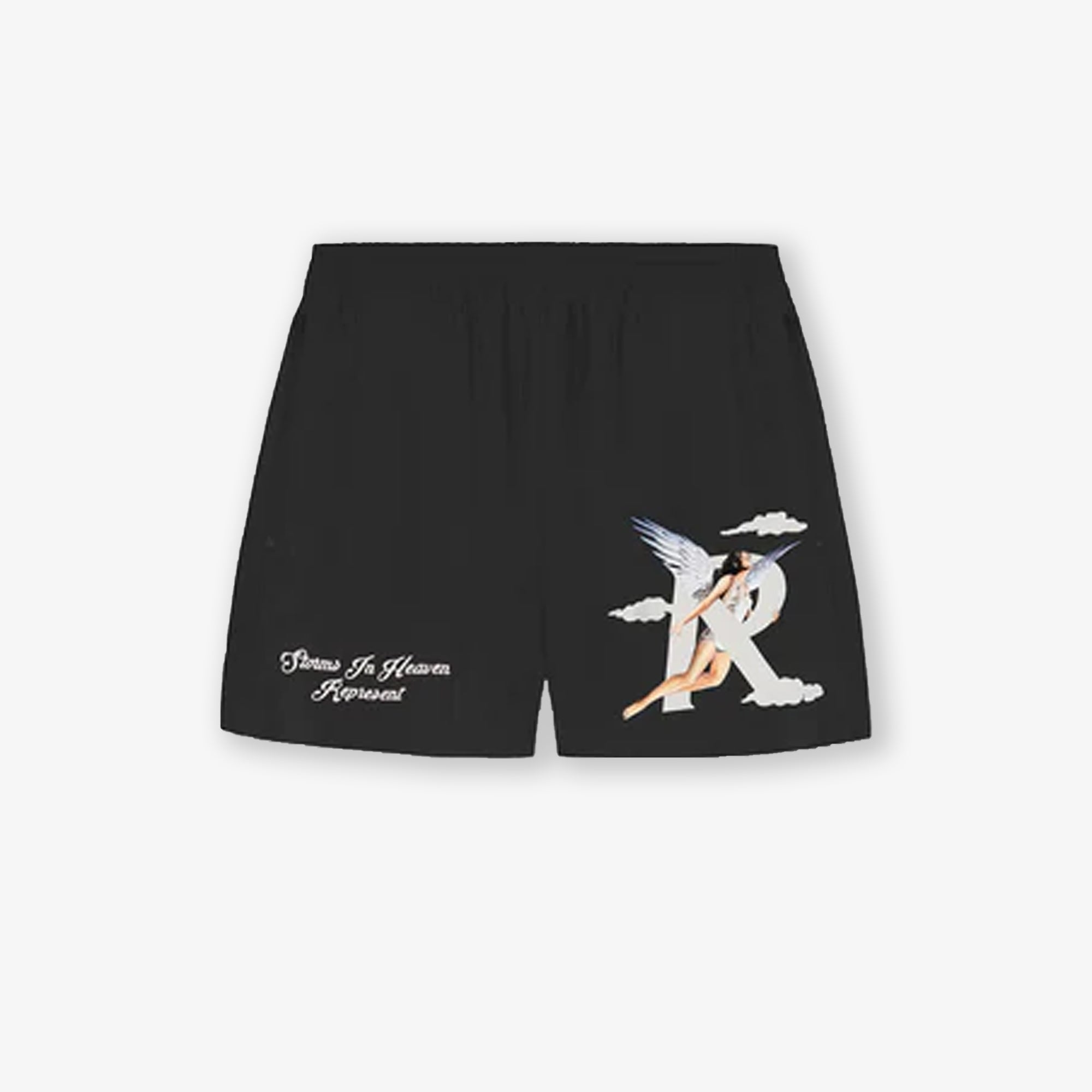 The Storms in Heaven Shorts in black embody luxury summer styling. They feature an elasticated waistband with a drawstring adjuster, zip pockets, and are finished with the Storms in Heaven graphic logo to the left leg and the embroidered motif to the right leg.