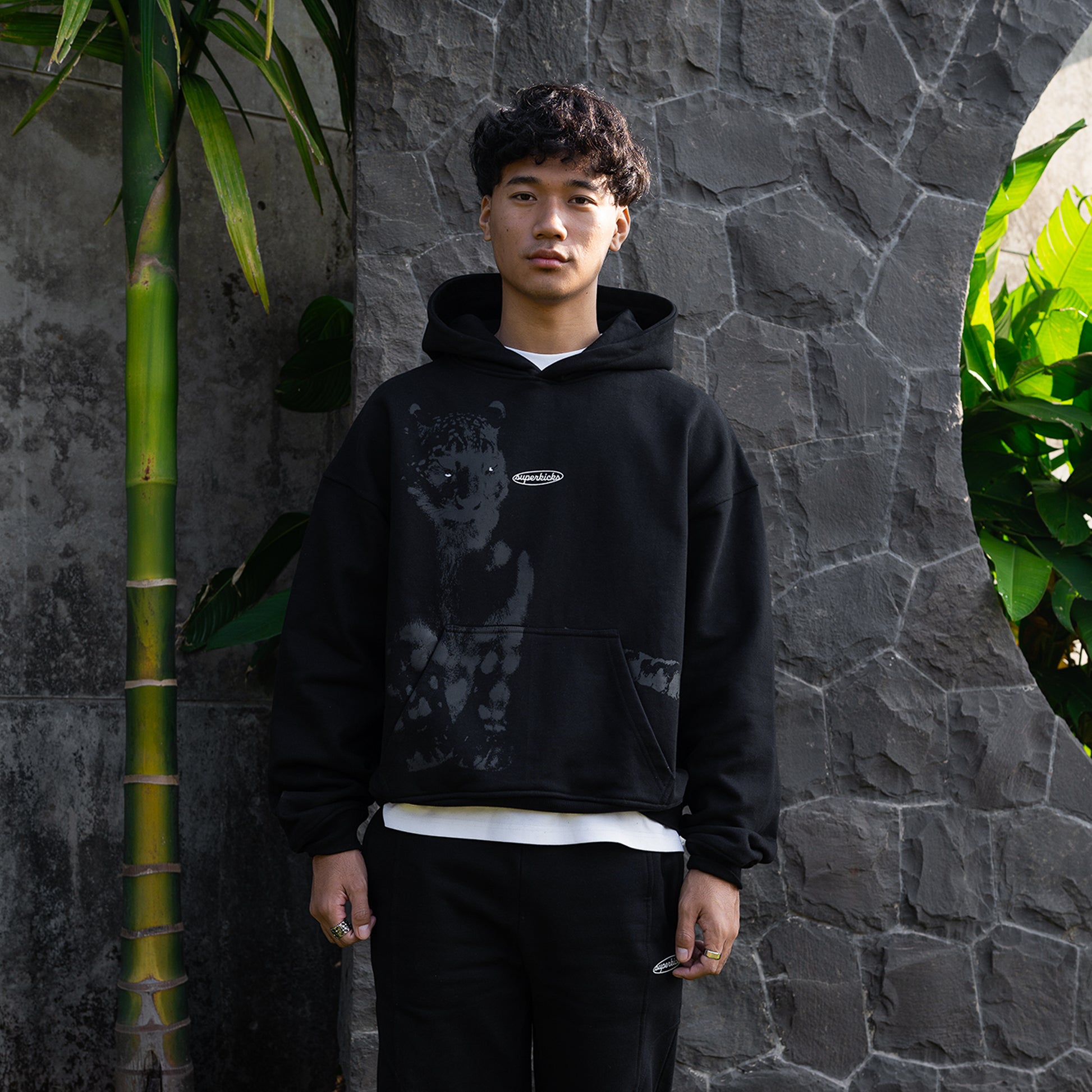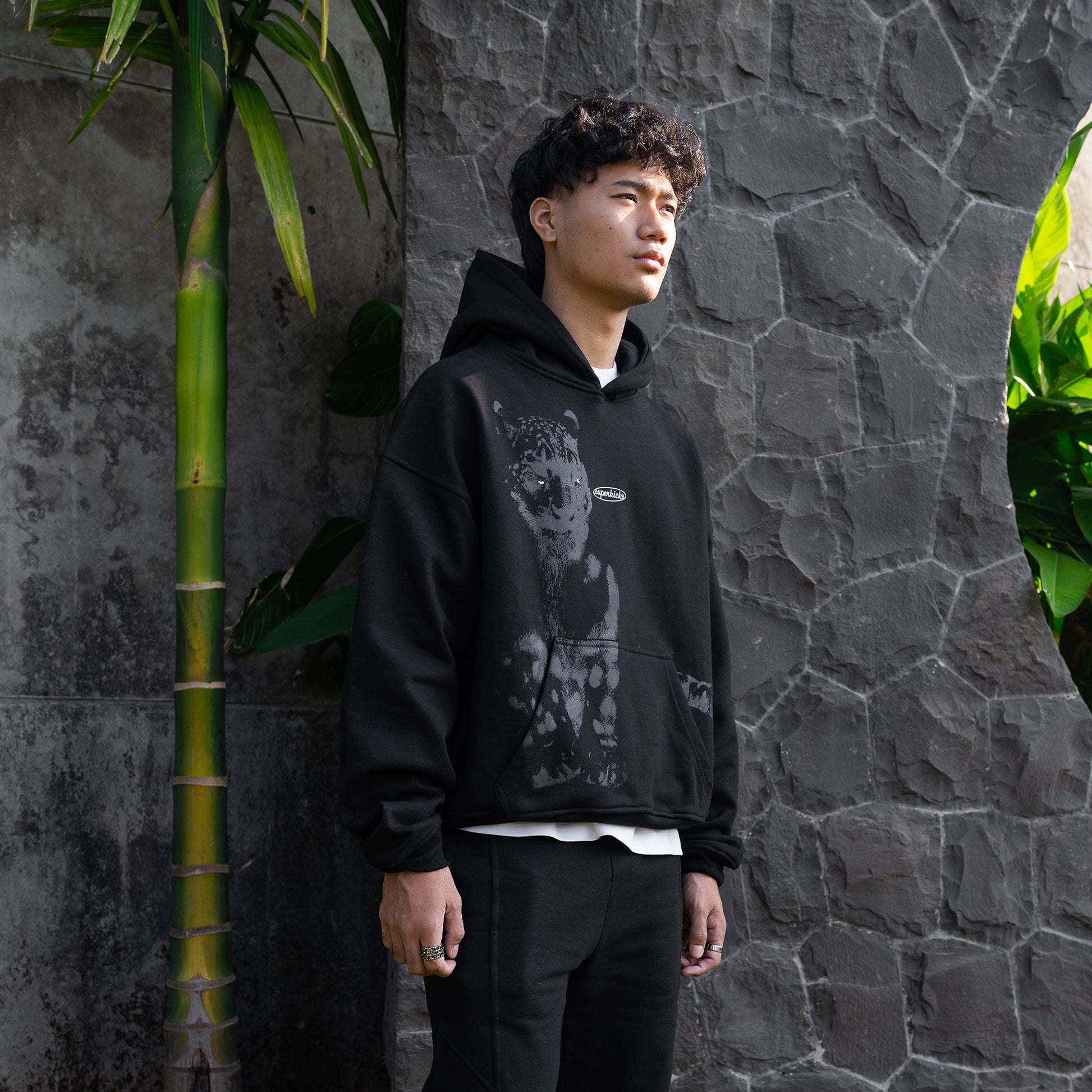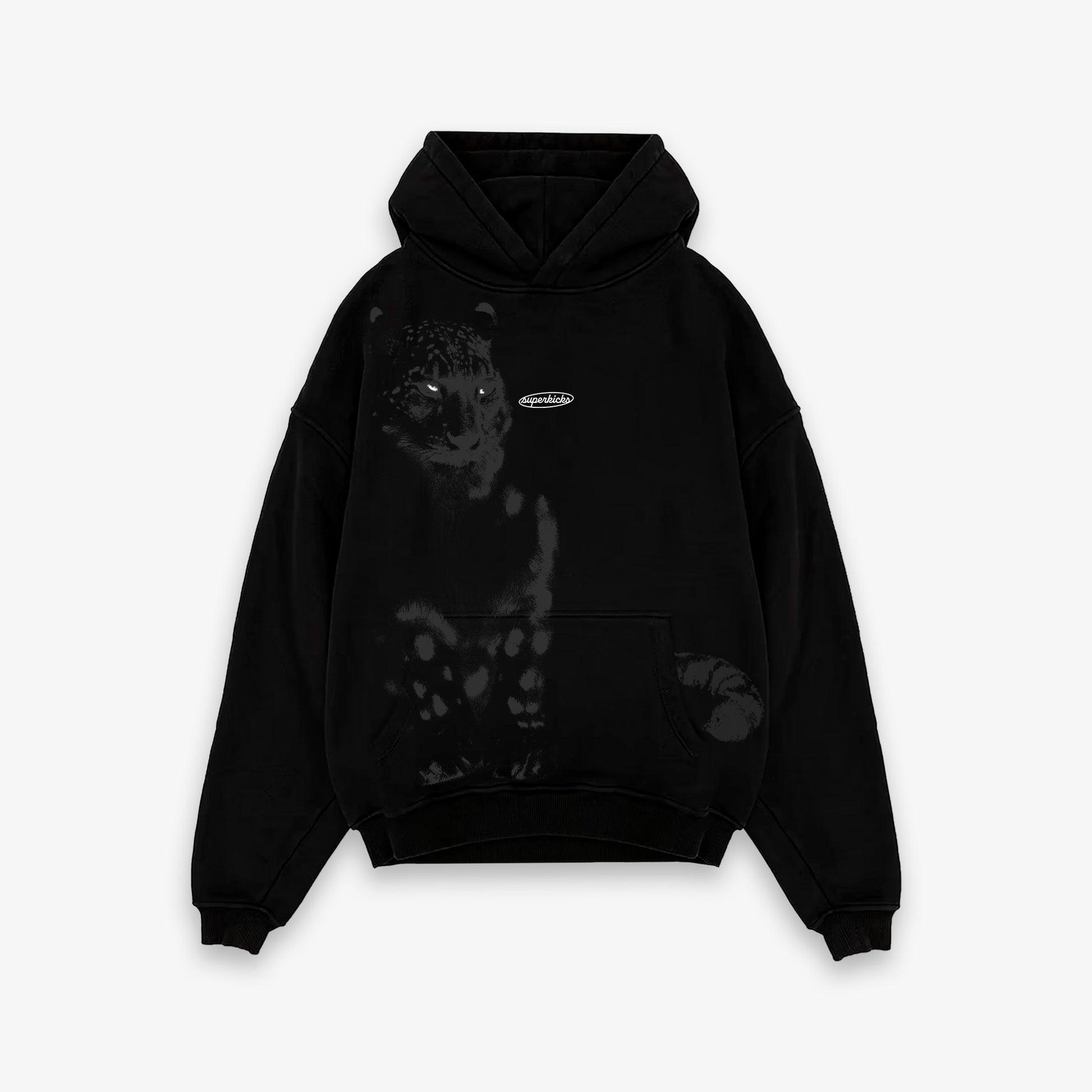 This hoodie features a tone-on-tone snow leopard print that blends seamlessly and only reveals itself when viewed up-close or when caught in the light. A relaxed fit to enable layering and maximize on the cozy factor.
