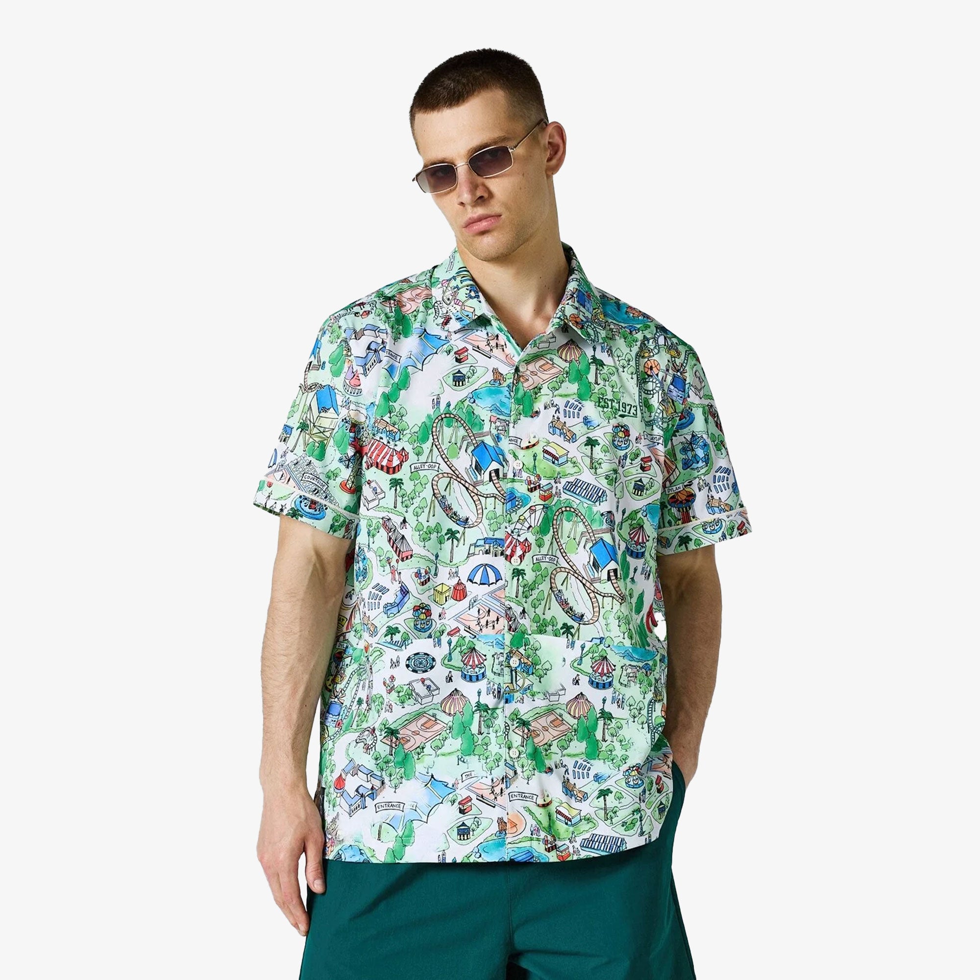 Imagine a place that's pure basketball and pure fun. That's the Fairgrounds Resort. Celebrate basketball in this button-down shirt. It is engineered to wick away moisture and help keep you dry.