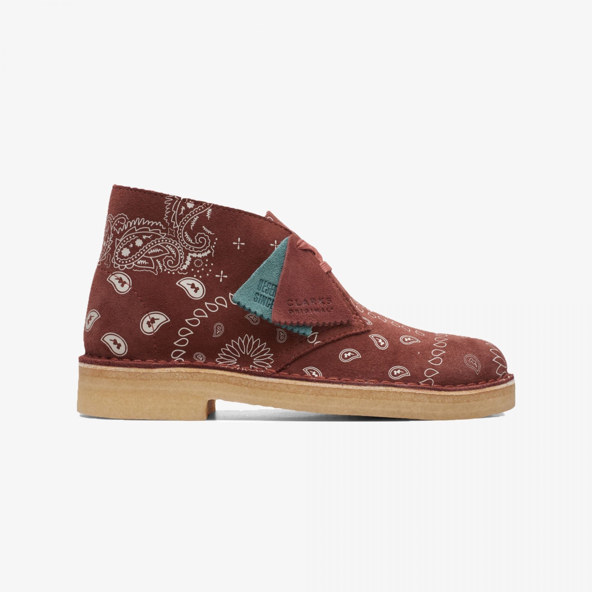 Inspired by Japanese and American vintage style, subtle paisley prints bring this vibrant Desert Boot to life - the perfect complement to retro-feel brick red and dusky green suedes.