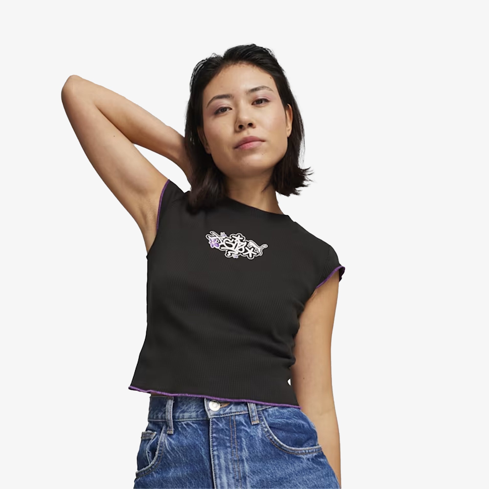 PUMA x X-GIRL has arrived. The collab is bringing a modern, feminine edge to classic street and skate aesthetics and features bold and aggressive pieces with graffiti-inspired graphics and a DIY aesthetic. This ribbed tee goes all out with a rubber print graphic on the front and contrasting pops of colour.