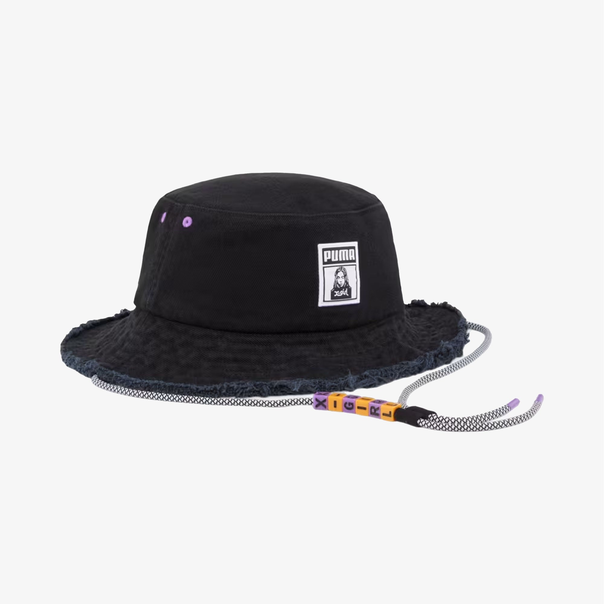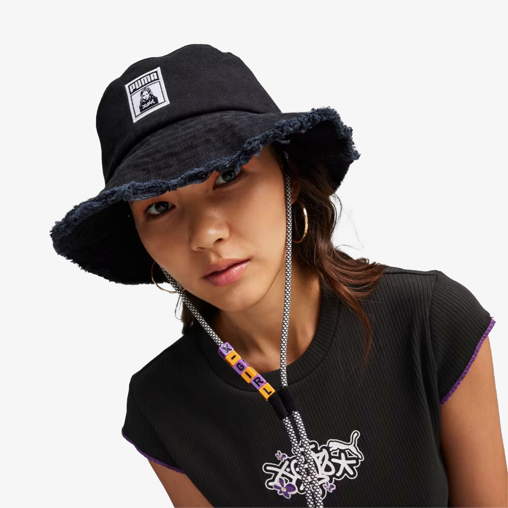 PUMA x X-GIRL has arrived. The collab is bringing a modern, feminine edge to classic street and skate aesthetics and features bold and aggressive pieces with graffiti-inspired graphics and a DIY aesthetic. This bucket hat goes all out with a destroyed fabric and patch-like label on the front.