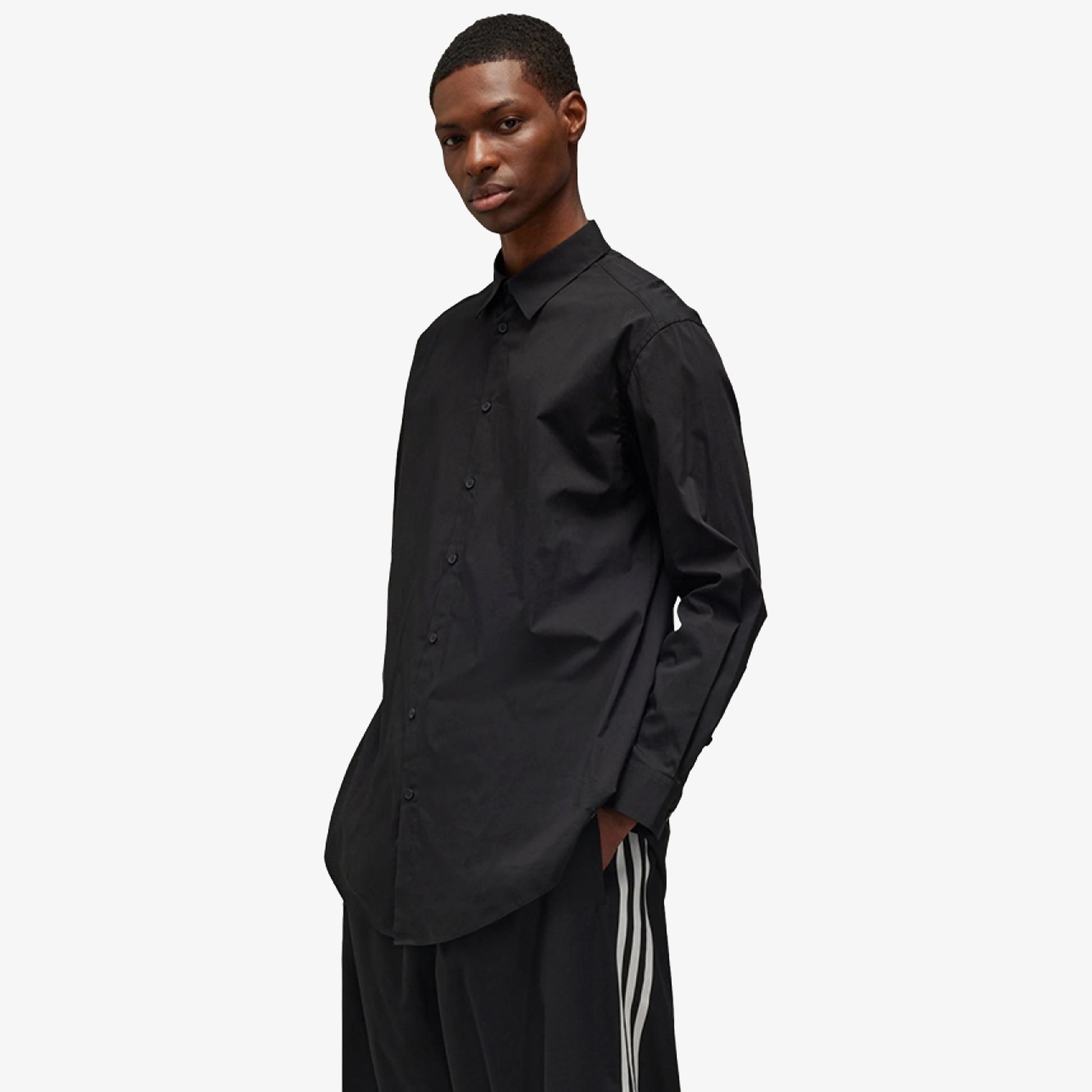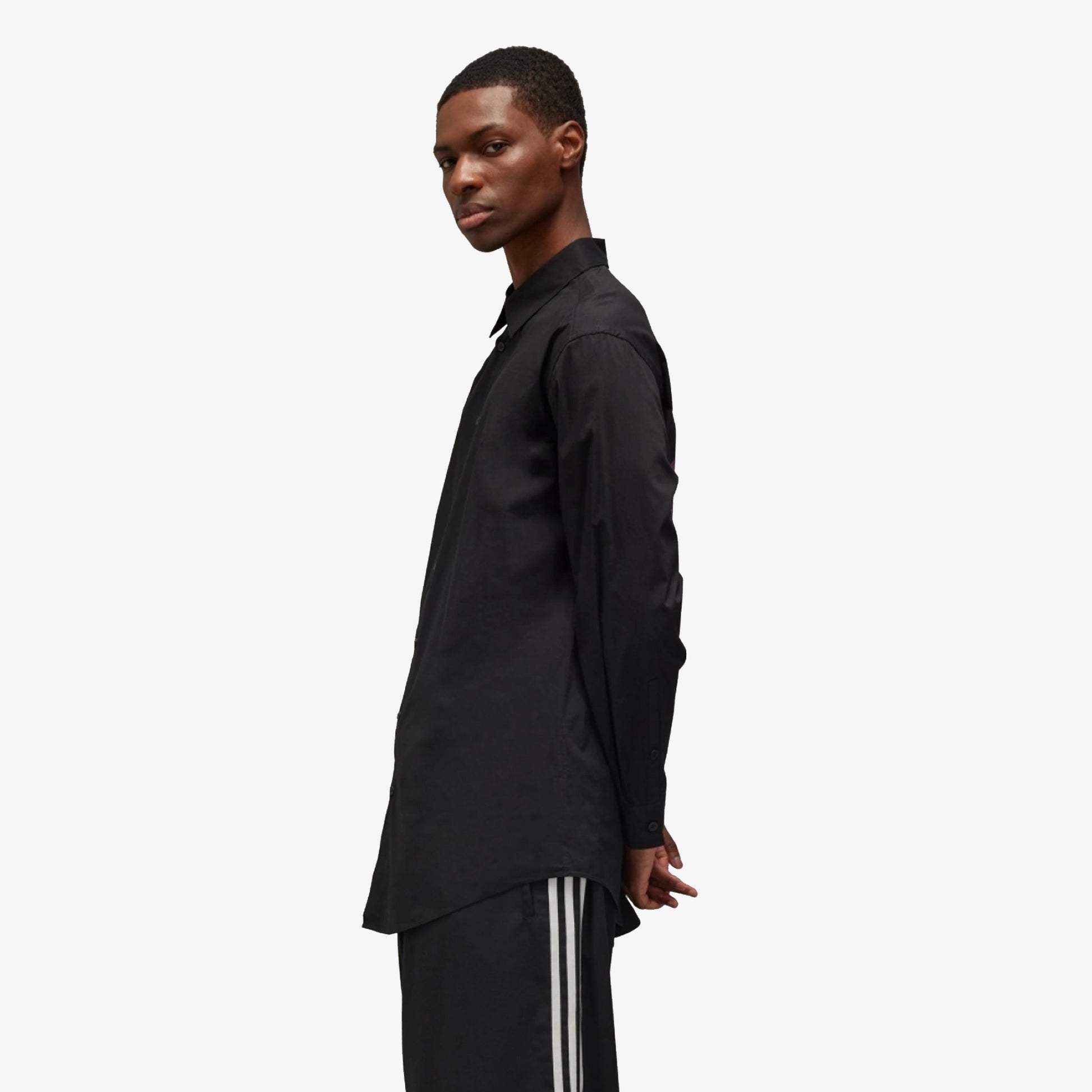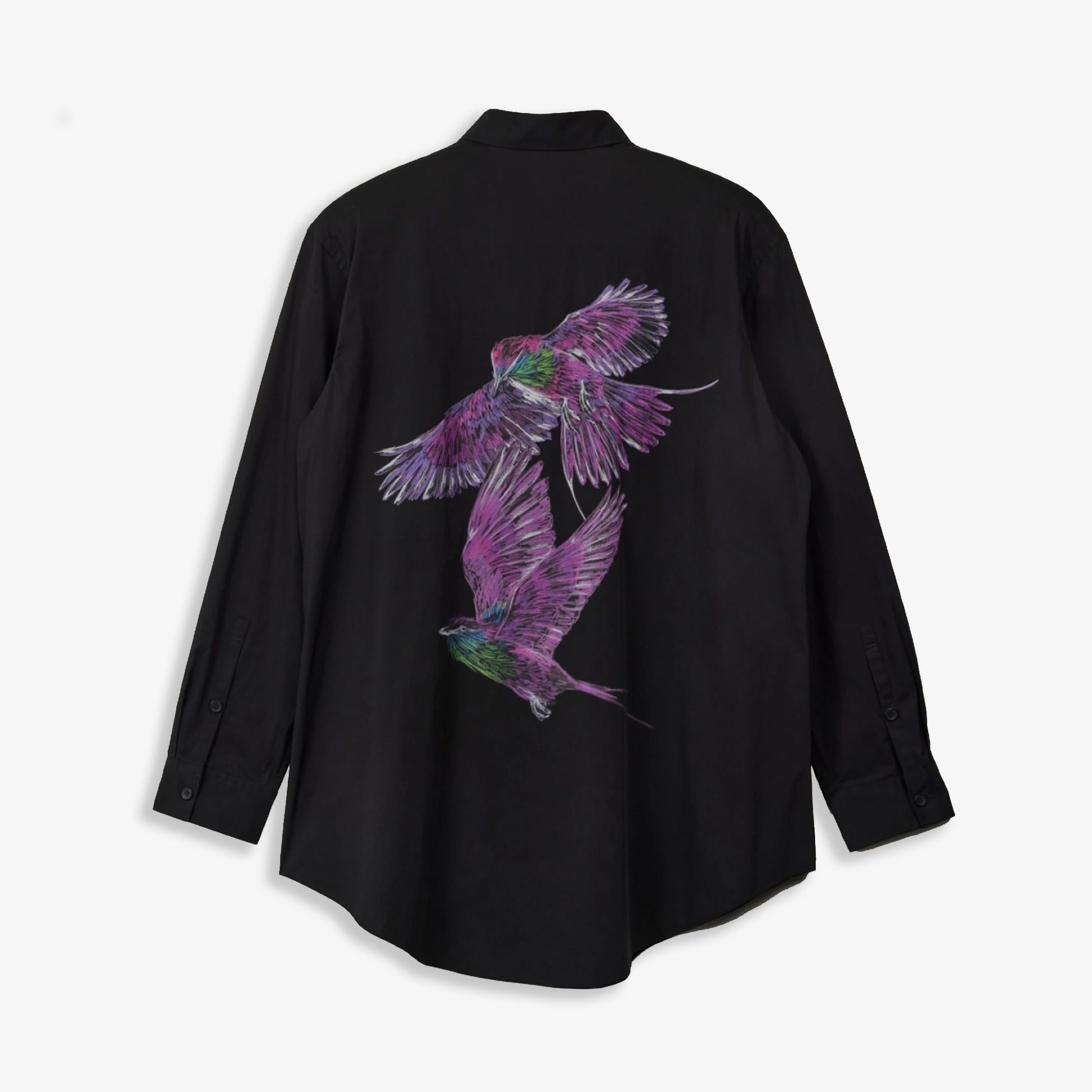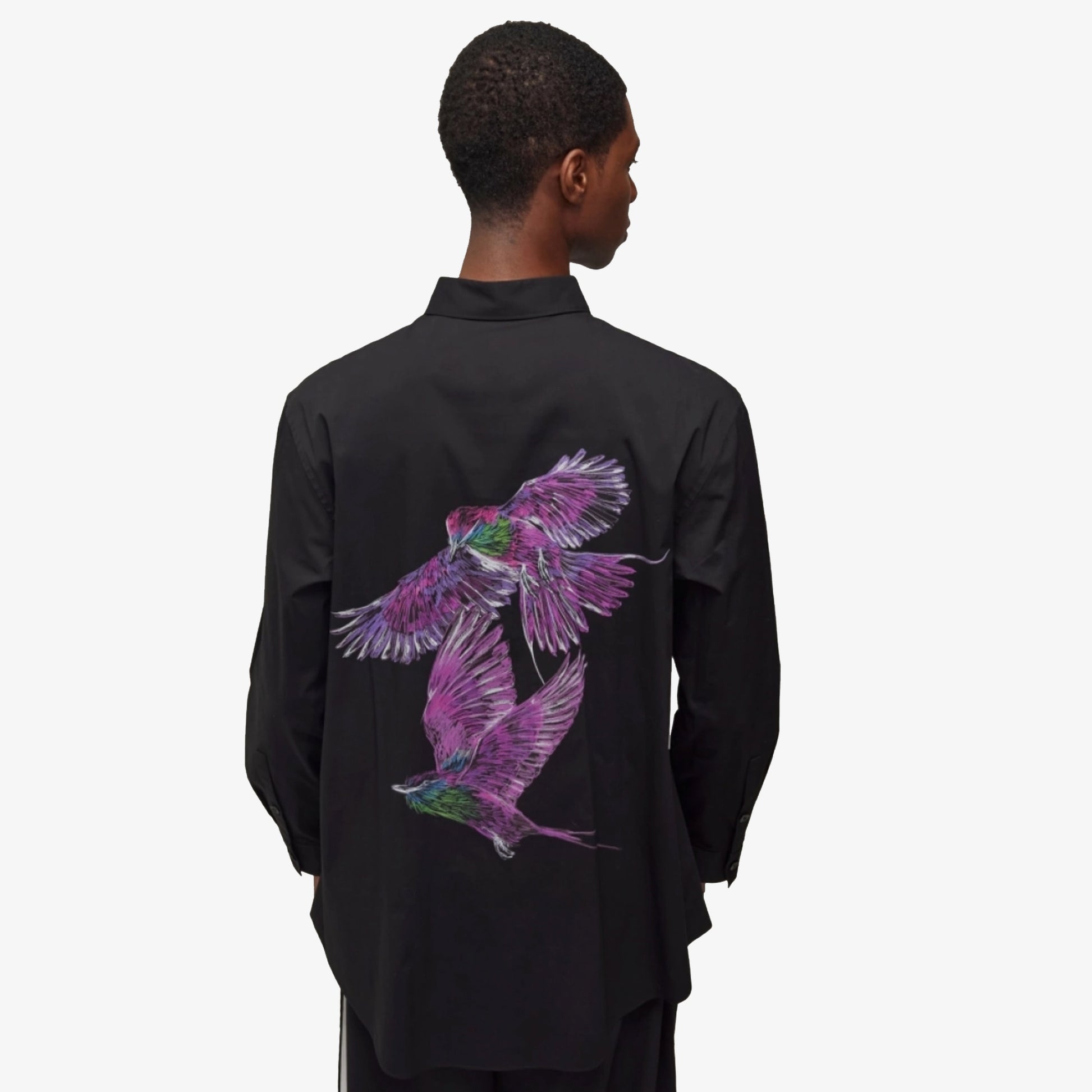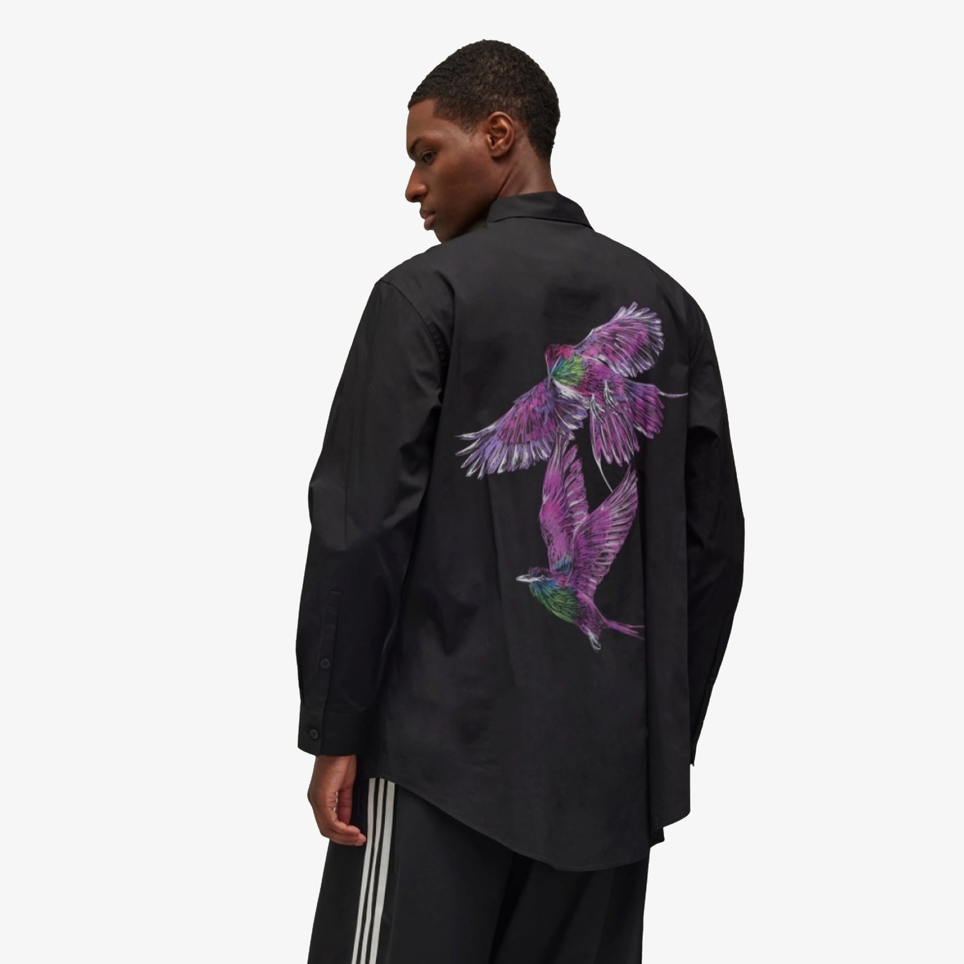 The Y-3 Graphic Shirt is understated on front and features a vivid nature-inspired graphic on the back. Birds soar across the cotton and nylon blend plain weave fabric with built-in stretch, offering a glimpse into the ultraviolet colour spectrum human eyes can't see. A fold-down collar and buttons add classic touches.