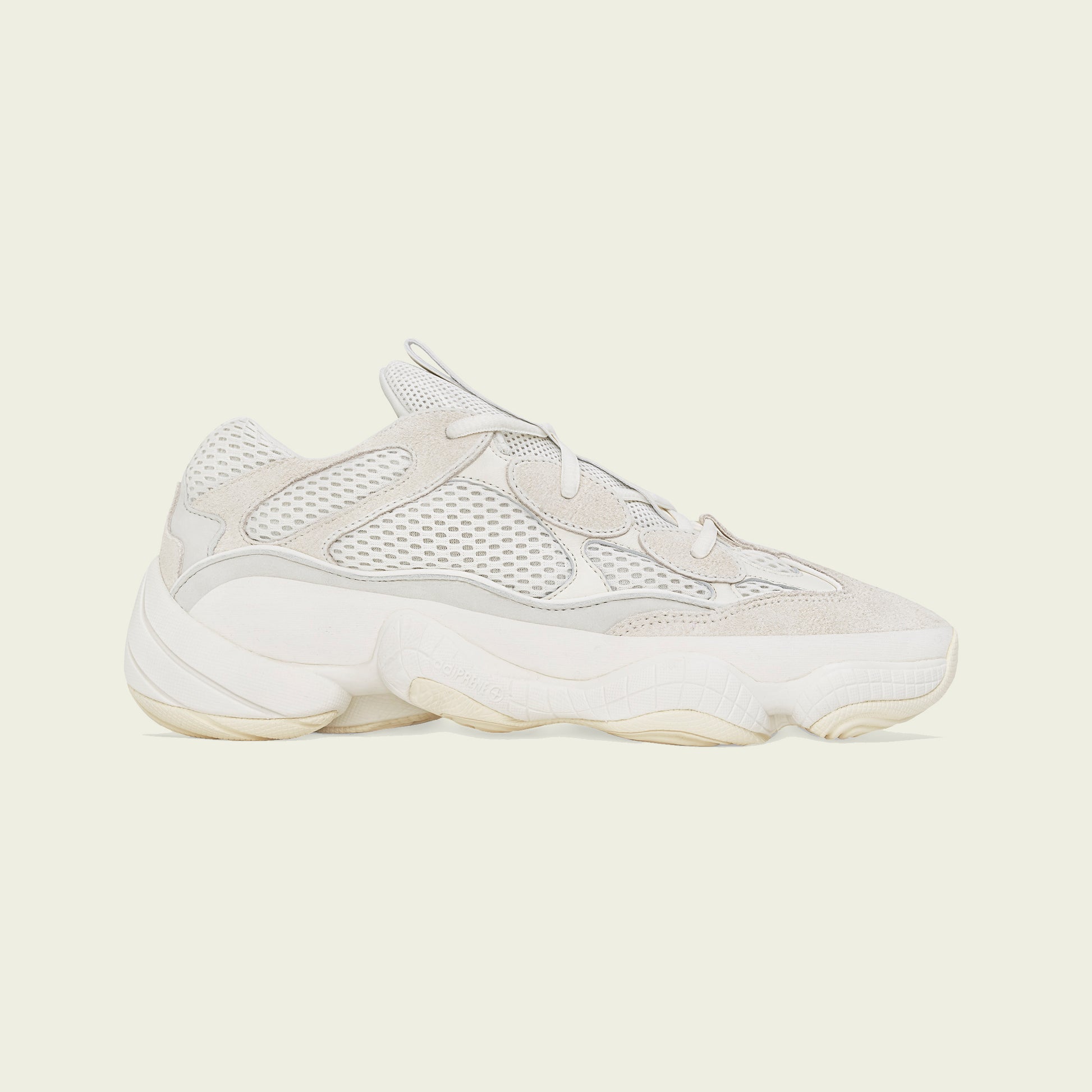 The YEEZY 500 Bone white features an upper composed of cow suede, premium leather and mesh. A rubber wrap along the midsole of the foot provides support and abrasion resistance with reflective piping details around the lace eyelets that add visibility in low-light conditions. The adiPRENE+ cushioning absorbs impact and optimizes rebound while a light rubber outsole provides traction.