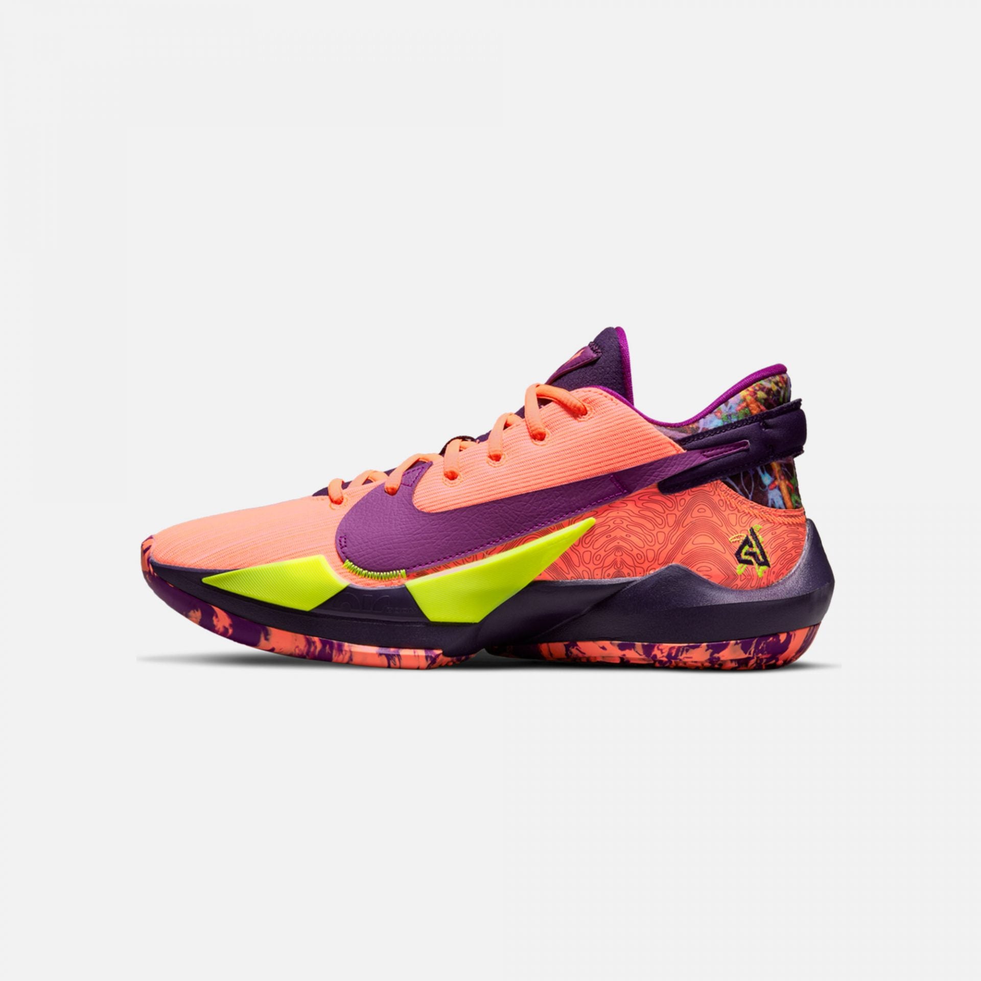 Giannis possesses a freakish combination of height, length and speed rarely seen in the league. The Zoom Freak 2 harnesses his power and helps enable him to generate force to help drive him down the court. A moulded overlay caps the outer toe area to help contain Giannis's devastating Euro step move.